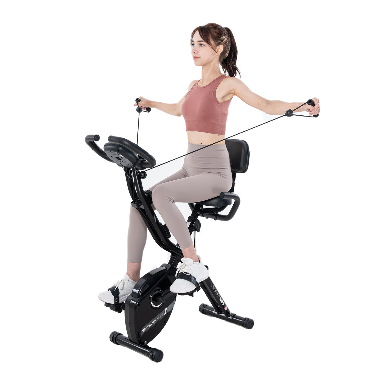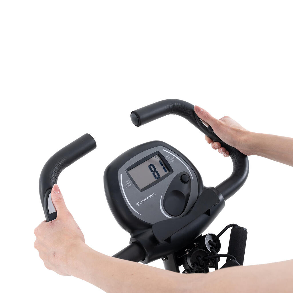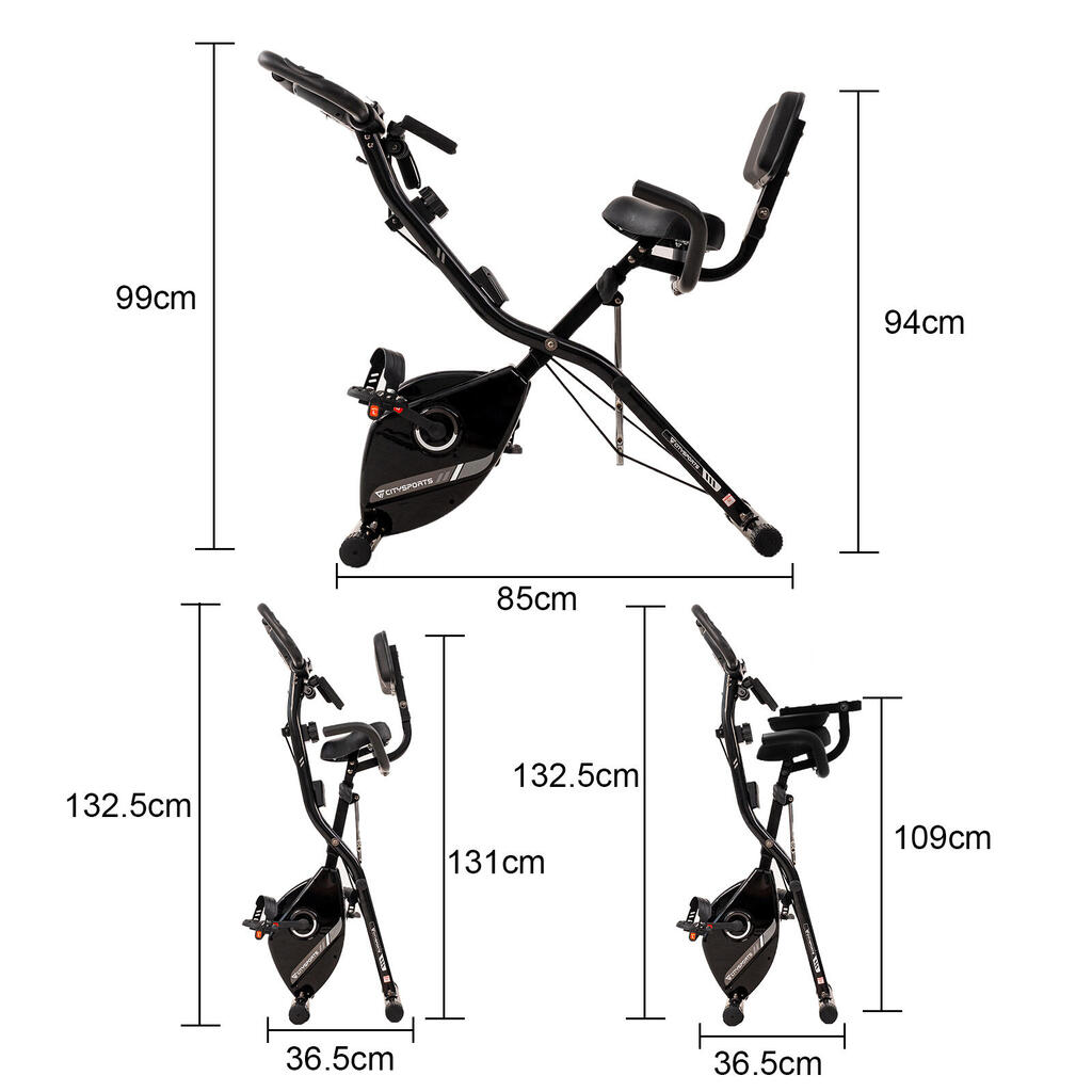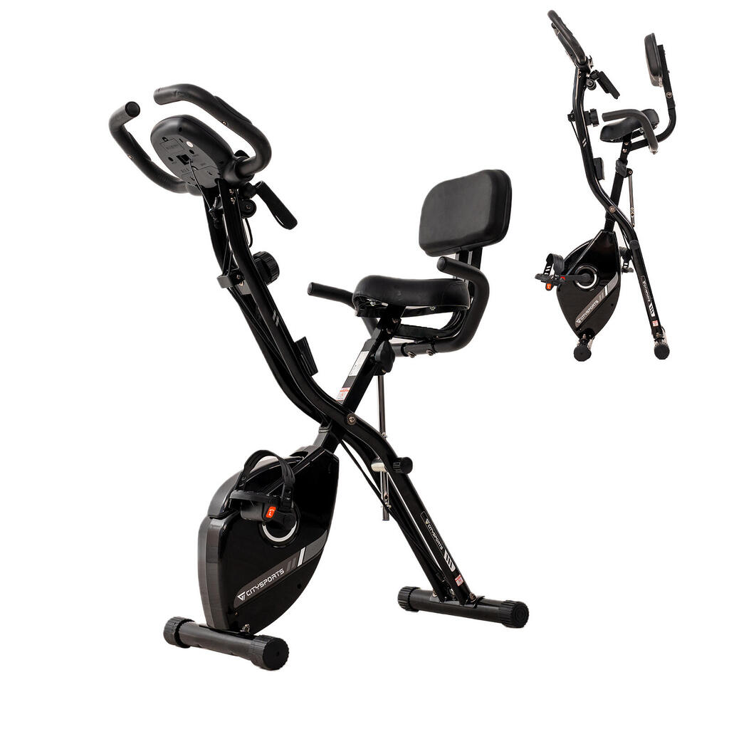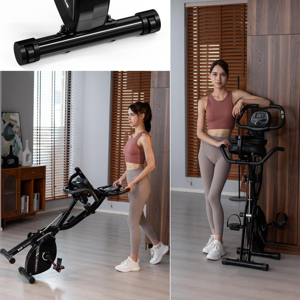 Foldable 2-in-1 exercise bike with 12 magnetic resistance levels. Features LCD monitor, pulse sensors, and backrest. Silent belt drive, max load 120kg.