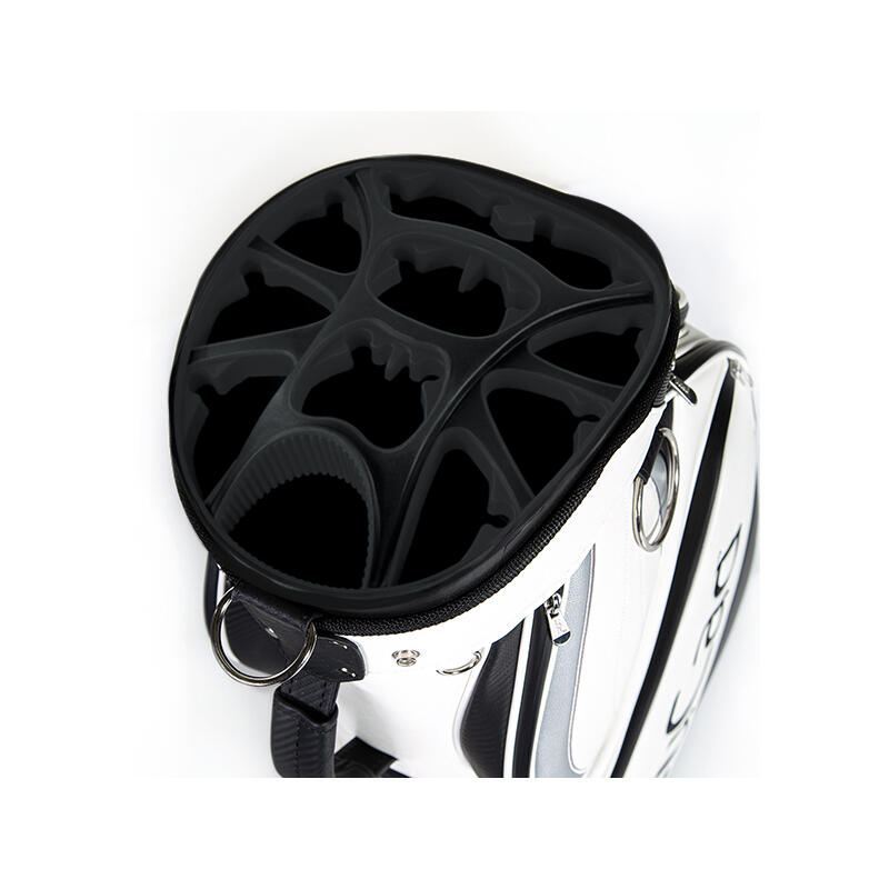 Play golf like a pro with this trendy bag JuCad. Made of waterproof leather-look material with zippered pockets, this durable model meets the space needs of a professional golfer. The easy-access fastening system lets you securely and neatly fasten up to 14 clubs. With an oversized putter compartment, large putter grips will fit right in. The bag has a heavy-duty handle that makes it easy to carry the bag, even with very heavy equipment. The balanced bag bottom ensures a secure seat on the course or cart.