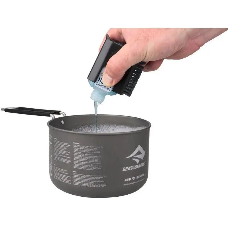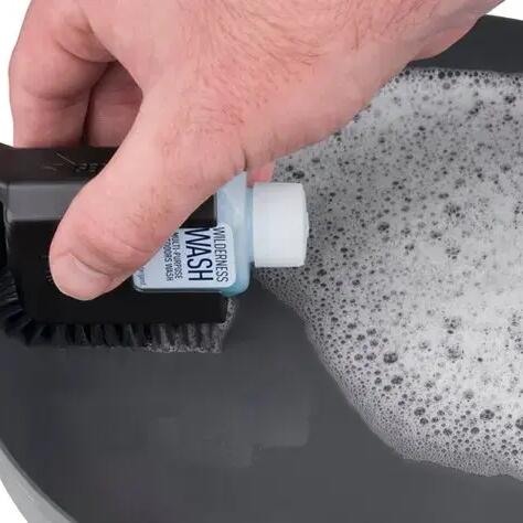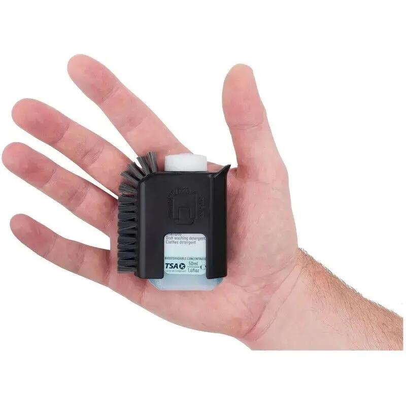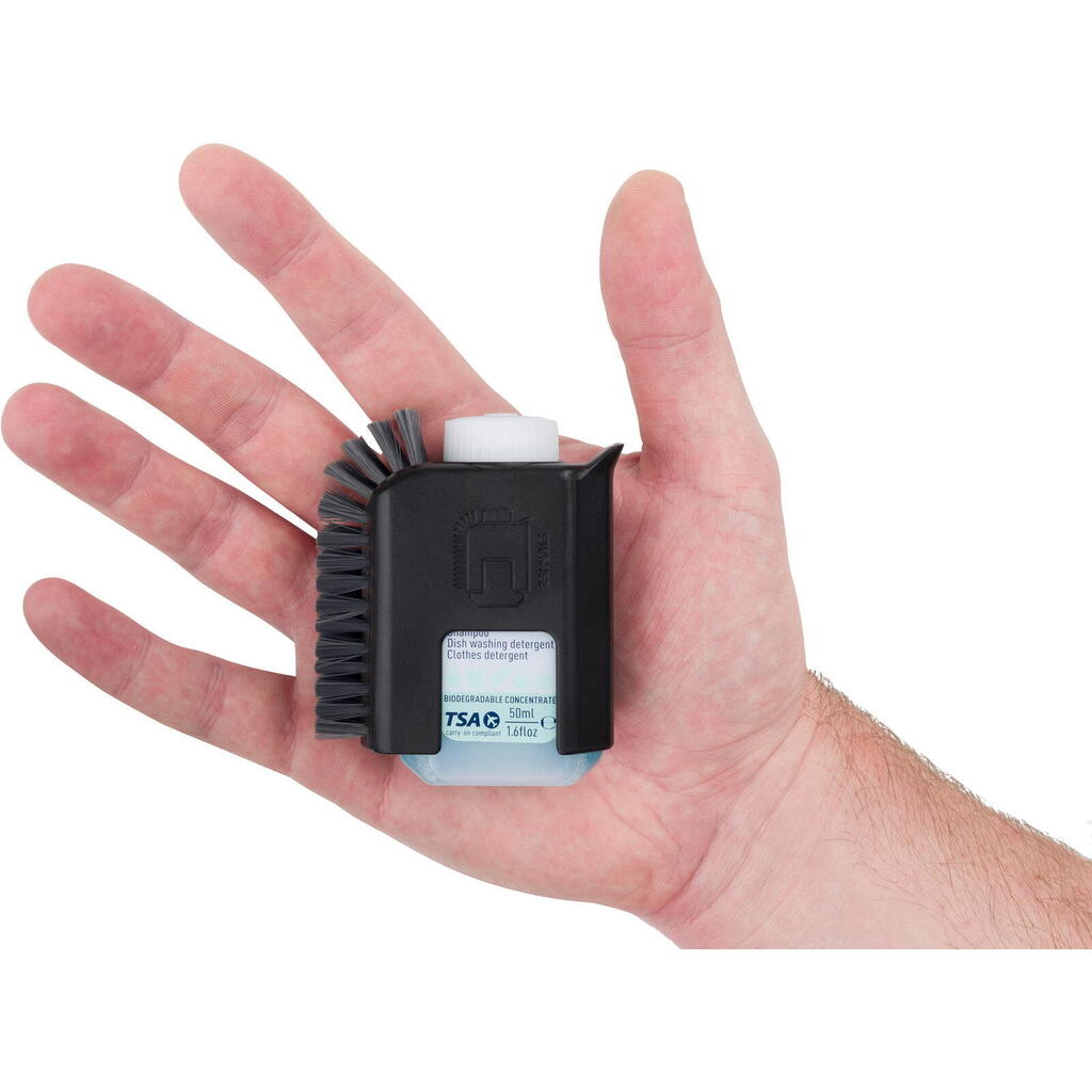 Keep camp cookware spotless: nylon brush, scraper, and 50 ml Wilderness Wash all in one compact kit!