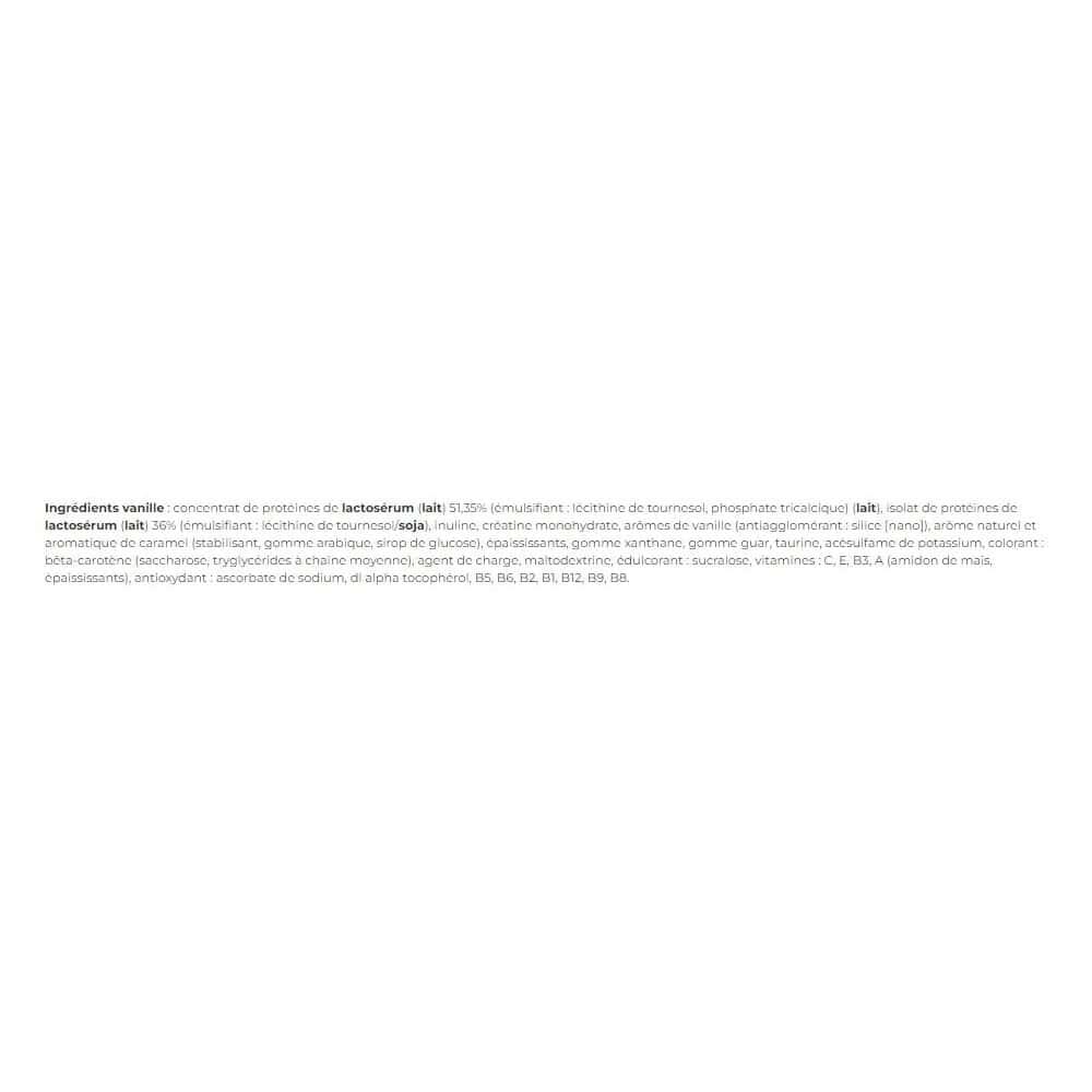 Chocolate ingredients: whey protein concentrate (milk) 42.4% (emulsifier: sunflower lecithin, tricalcium phosphate) (milk), whey protein isolate (milk) 39.5% (emulsifier: sunflowerlecithin/soy), low-fat cocoa powder 6% acidity regulator (potassium carbonate, acidifier, sweetening acid), inulin, chocolate flavourings anti-caking agent : silica [nano]), creatine monohydrate, thickeners, xanthan gum, guar gum, taurine, acesulfame potassium, bulking agent, maltodextrin, sweetener: sucralose, vitamins: C, E, B3, A (corn starch, thickeners, )(antioxidant: dl alpha tocopherol), B5, B6, B2, B1, B12, B9, B8.Vanilla ingredients: whey protein concentrate (milk) 51.35% (emulsifier: sunflower lecithin, tricalcium phosphate) (milk), whey protein isolate (milk) 36% (emulsifier:sunflower/soy lecithin), inulin, creatine monohydrate, vanilla flavoring (anticaking agent: silica [nano]), natural and aromatic caramel flavor (stabilizer, gum arabic, glucose syrup), thickeners, xanthan gum, guar gum, taurine, acesulfame potassium, coloring : beta-carotene (sucrose, medium-chain tryglycerides), bulking agent, maltodextrin, sweetener: sucralose, vitamins: C, E, B3, A (corn starch, thickeners), antioxidant: sodium ascorbate, dl alpha tocopherol, B5, B6, B2, B1, B12, B9, B8.