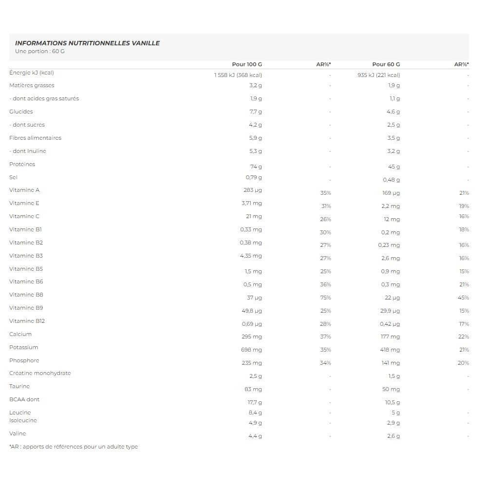NUTRITIONAL INFORMATION CHOCOLATE One portion : 60 G For 100 G AR%* For 60 G AR%* Energy kJ (kcal) 1528 kJ (361 kcal) - 917 kJ (217 kcal) - Fat - of which saturated fatty acids 3.4 g 2 g - - 2 g 1.2 g - - Carbohydrates - of which sugars 7.2 g 3.7 g - - 4.3 g 2.2 g - - Dietary fibre - of which Inulin 7,9 g 5,3 g - - 4,7 g 3,2 g - - Protein 72 g - 43 g - Salt 0,73 g - 0,44 g - Vitamin A 220 µg 27% 132 µg 17% Vitamin E 3,71 mg 31% 2,2 mg 19% Vitamin C 21 mg 26% 12 mg 16% Vitamin B1 0,35 mg 32% 0,2 mg 19% Vitamin B2 0,4 mg 29% 0.24 mg 17% Vitamin B3 4.5 mg 28% 2.6 mg 17% Vitamin B5 1.6 mg 26% 0.9 mg 16% Vitamin B6 0.5 mg 36% 0.3 mg 21% Vitamin B8 37 µg 75% 22 µg 45% Vitamin B9 51.8 µg 26% 31.1 µg 16% Vitamin B12 0.69 µg 28% 0,42 µg 17% Calcium 288 mg 36% 172 mg 22% Potassium 941 mg 47% 565 mg 28% Phosphorus 259 mg 37% 156 mg 22% Creatine monohydrate 2.5 g - 1.5 g - Taurine 83 mg - 50 mg - BCAA of which 16.8 g - 10.1 g Leucine 7.9 g - 4.8 g - Isoleucine 4.7 g - 2.8 g - Valine 4.2 g - 2.5