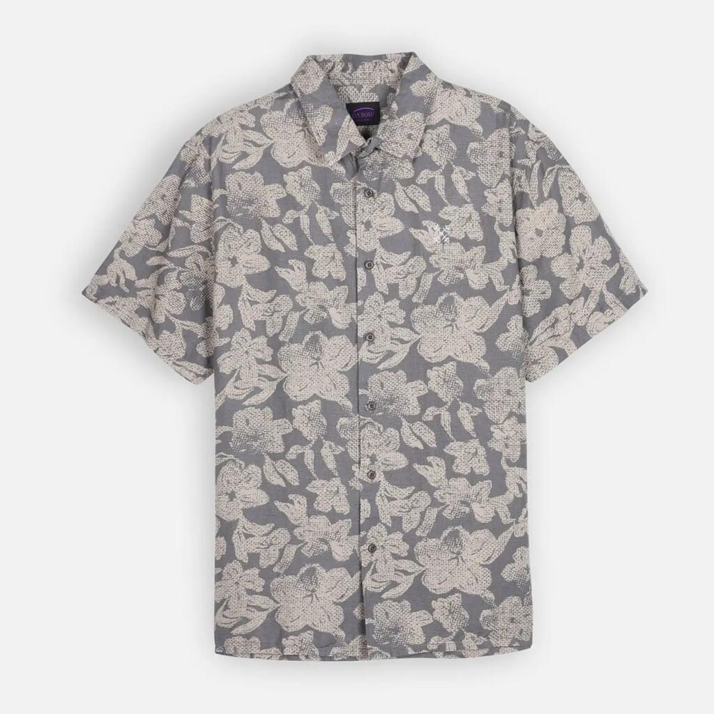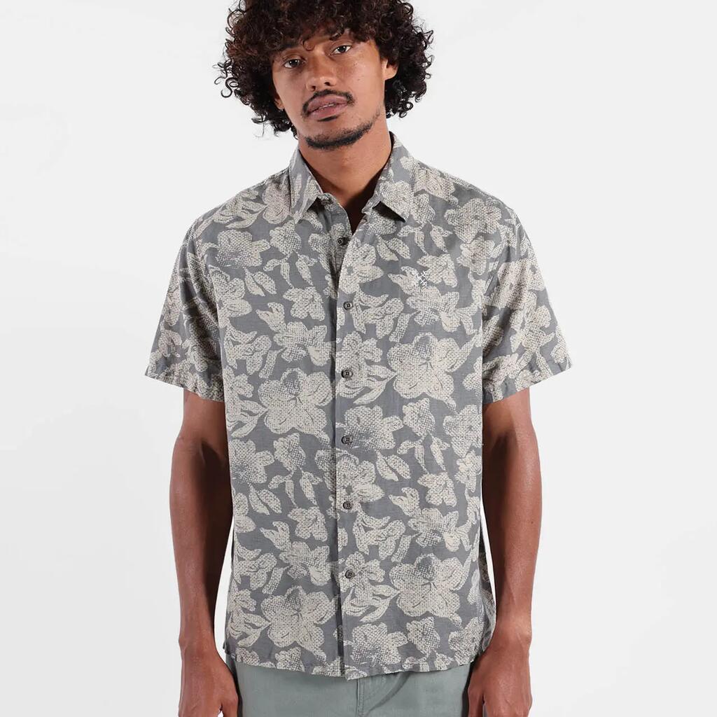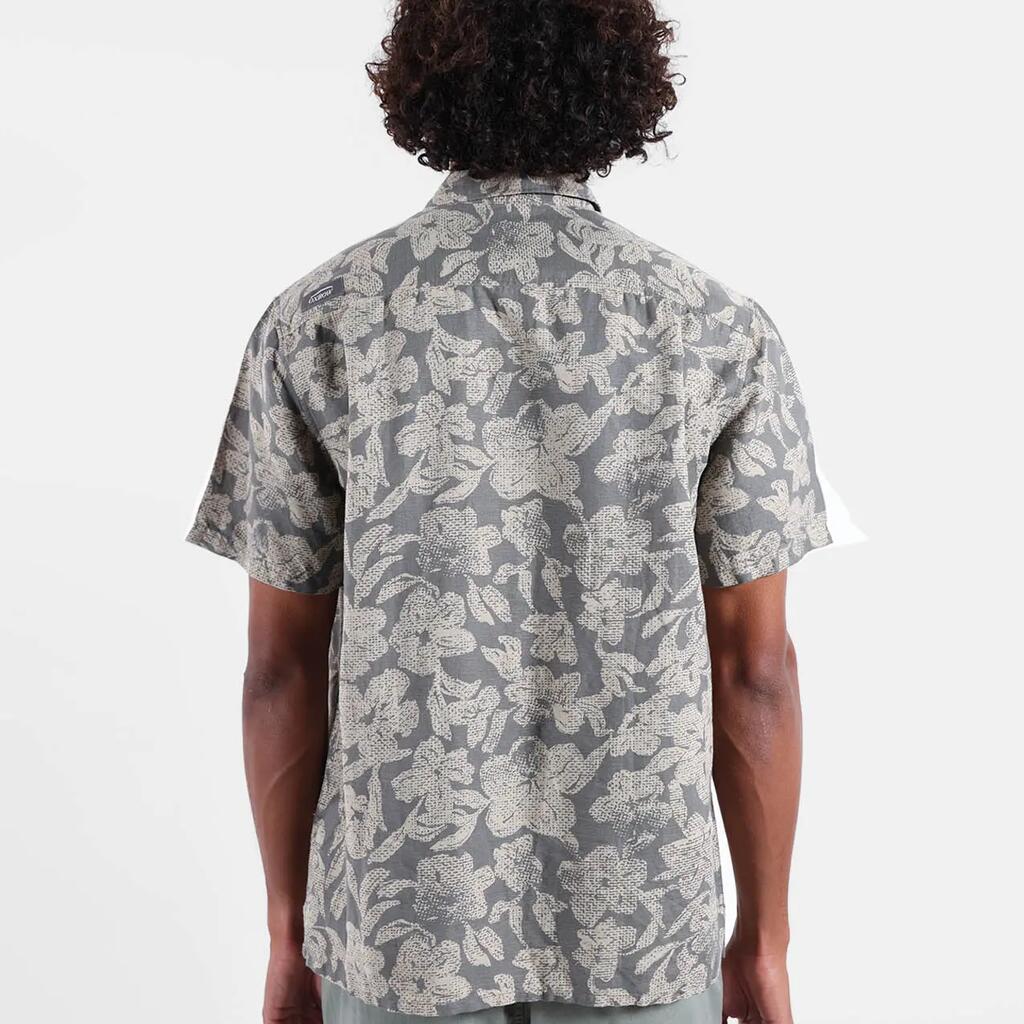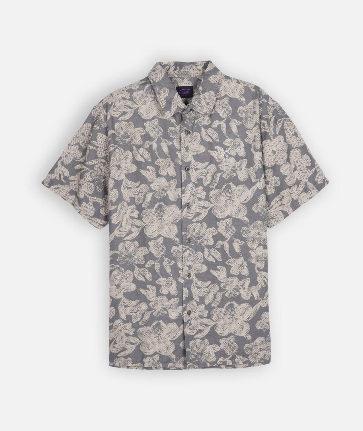 Short-sleeve Italian collar shirt with collar stand, allover print, back yoke, 4flo embroidery on chest, washed 135g/m² cotton-linen for softness.