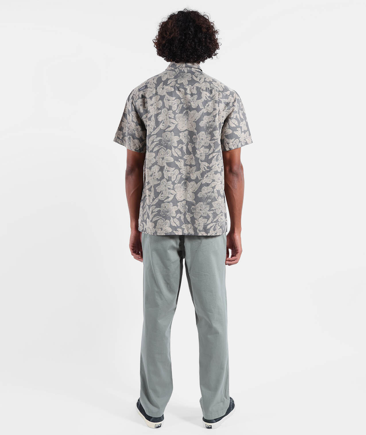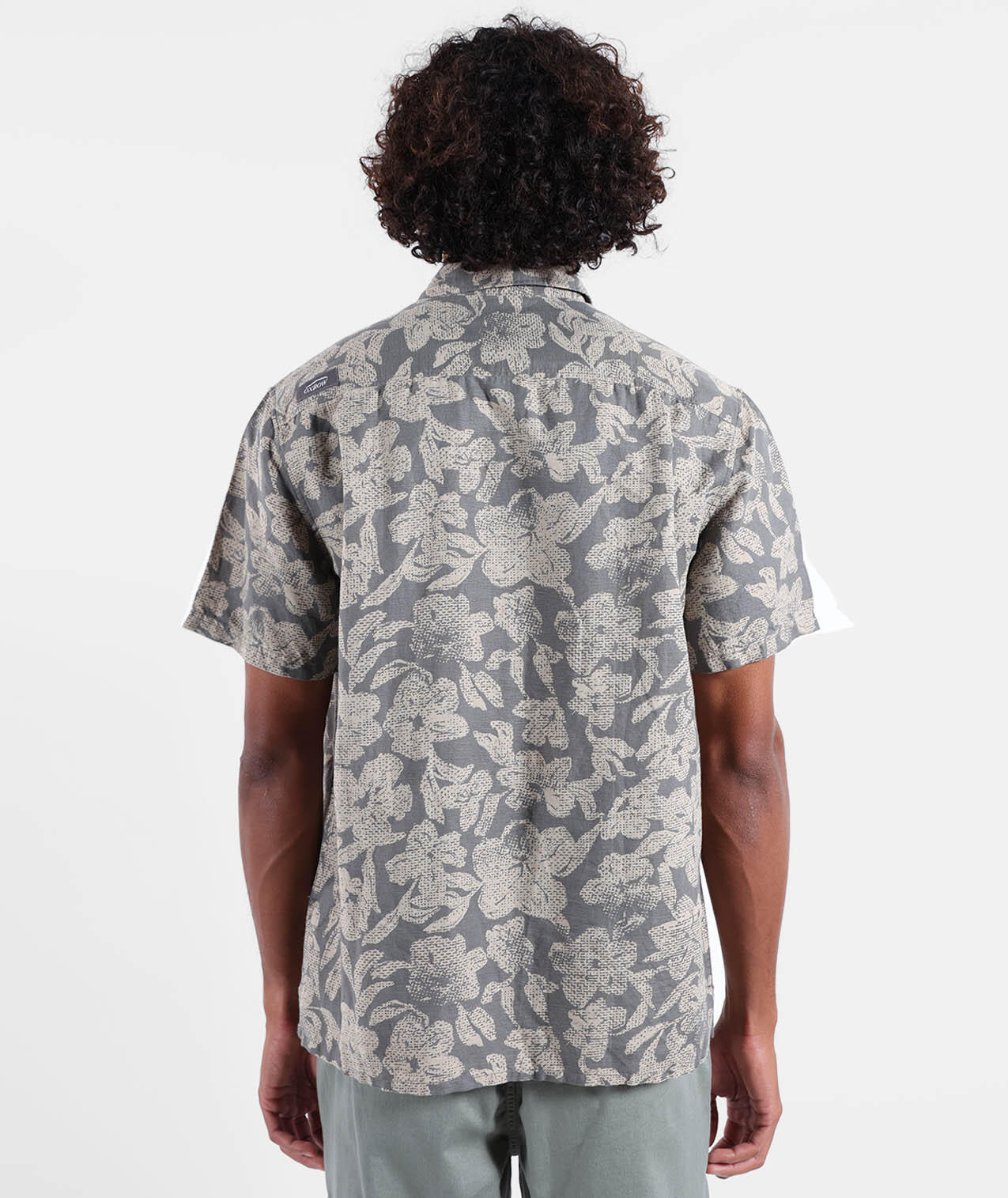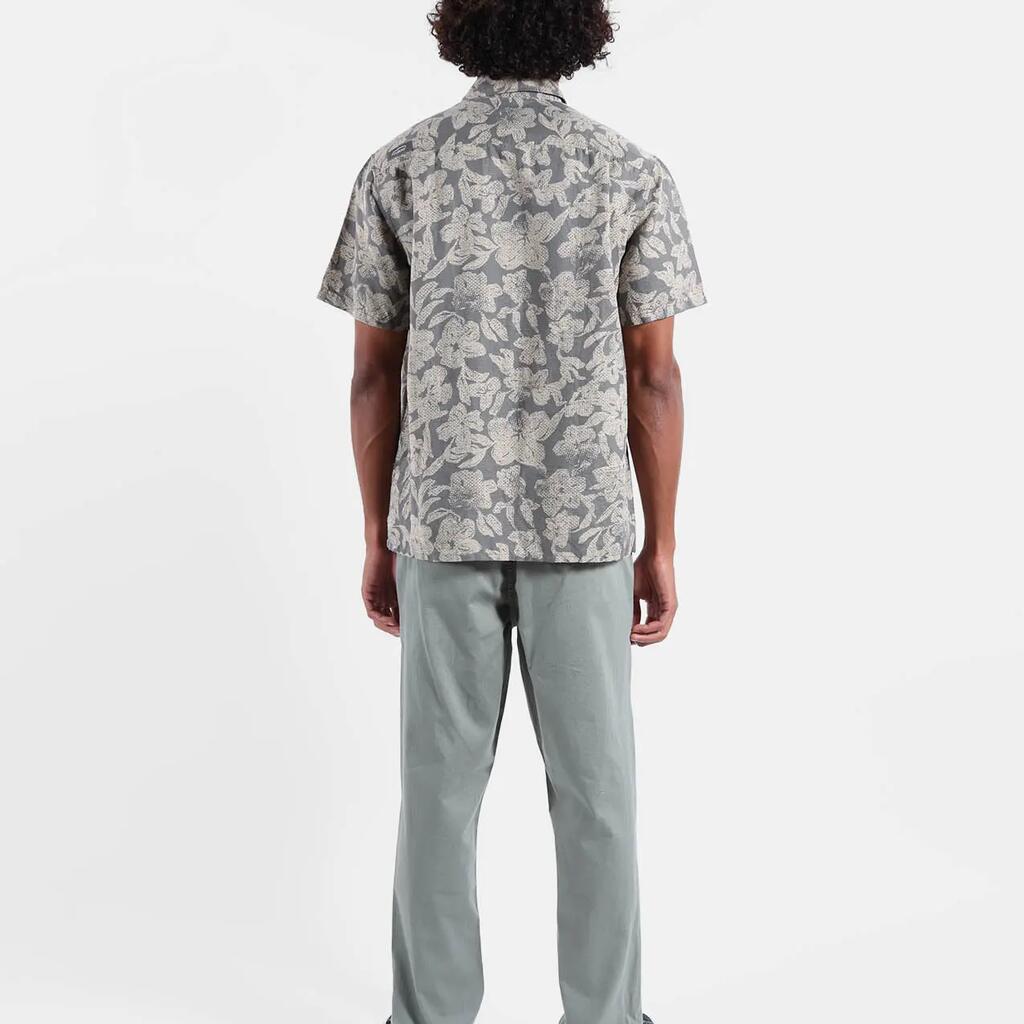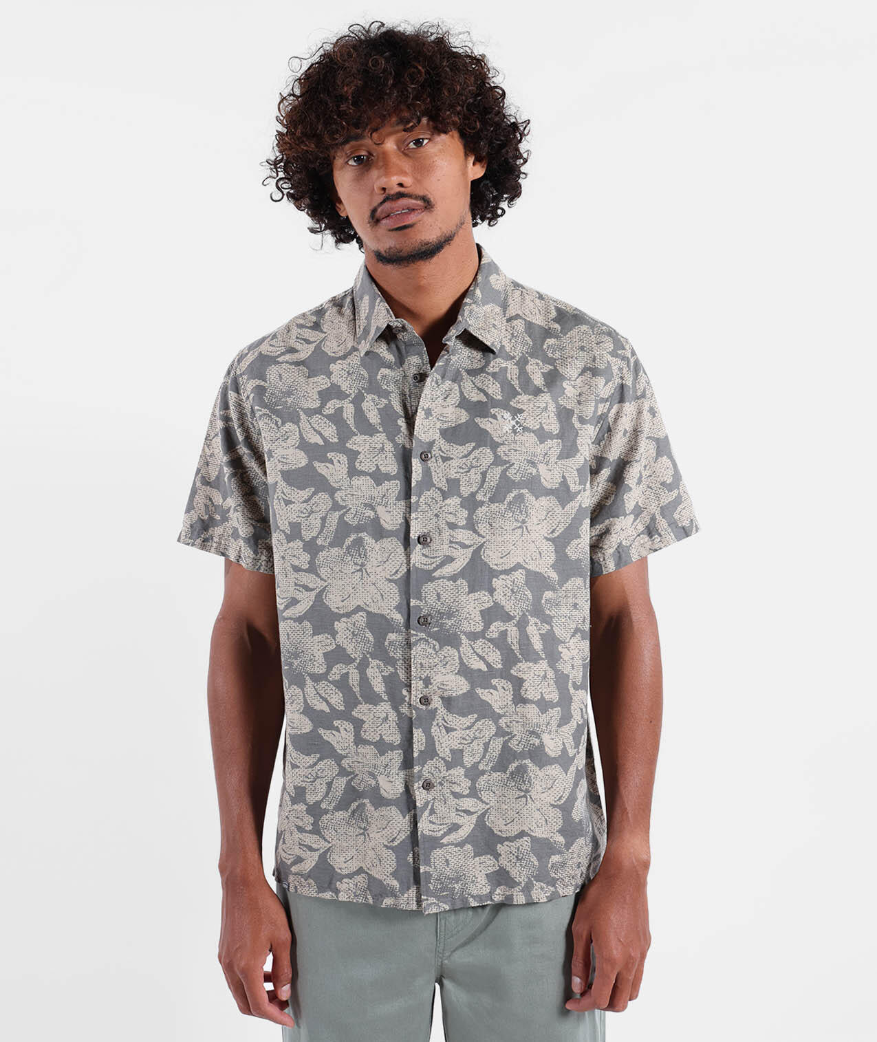 Short-sleeve Italian collar shirt with collar stand, allover print, back yoke, 4flo embroidery on chest, washed 135g/m² cotton-linen for softness.