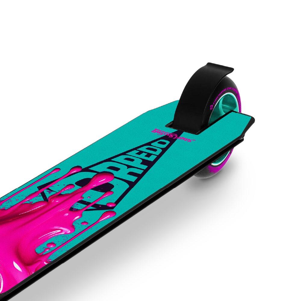 The Torpedo is a reliable and affordable freestyle scooter, ideal for skate park stunts, with a lightweight 6061 aluminum deck, TPE grips, and 100mm wheels with Abec 7 bearings.