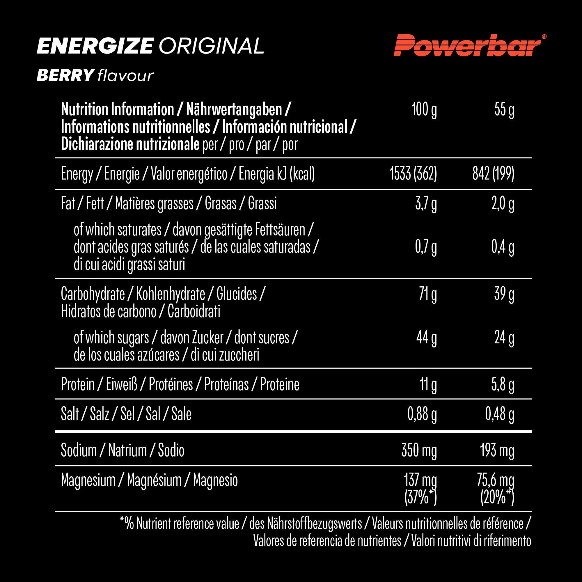 | Nutritional information | per 100g | per serving: 55 g | |---|---|---| | Energy: | 1531 kj | 842,1 kj | | Energy: | 366 kcal | 201,3 kcal | | Fat: | 3,6 g | 2,0 g | | of which saturates: | 0,7 g | 0,4 g | | Carbohydrate: | 70,9 g | 39,0 g | | of which sugars: | 44,0 g | 24,2 g | | Protein: | 10,5 g | 5,8 g |