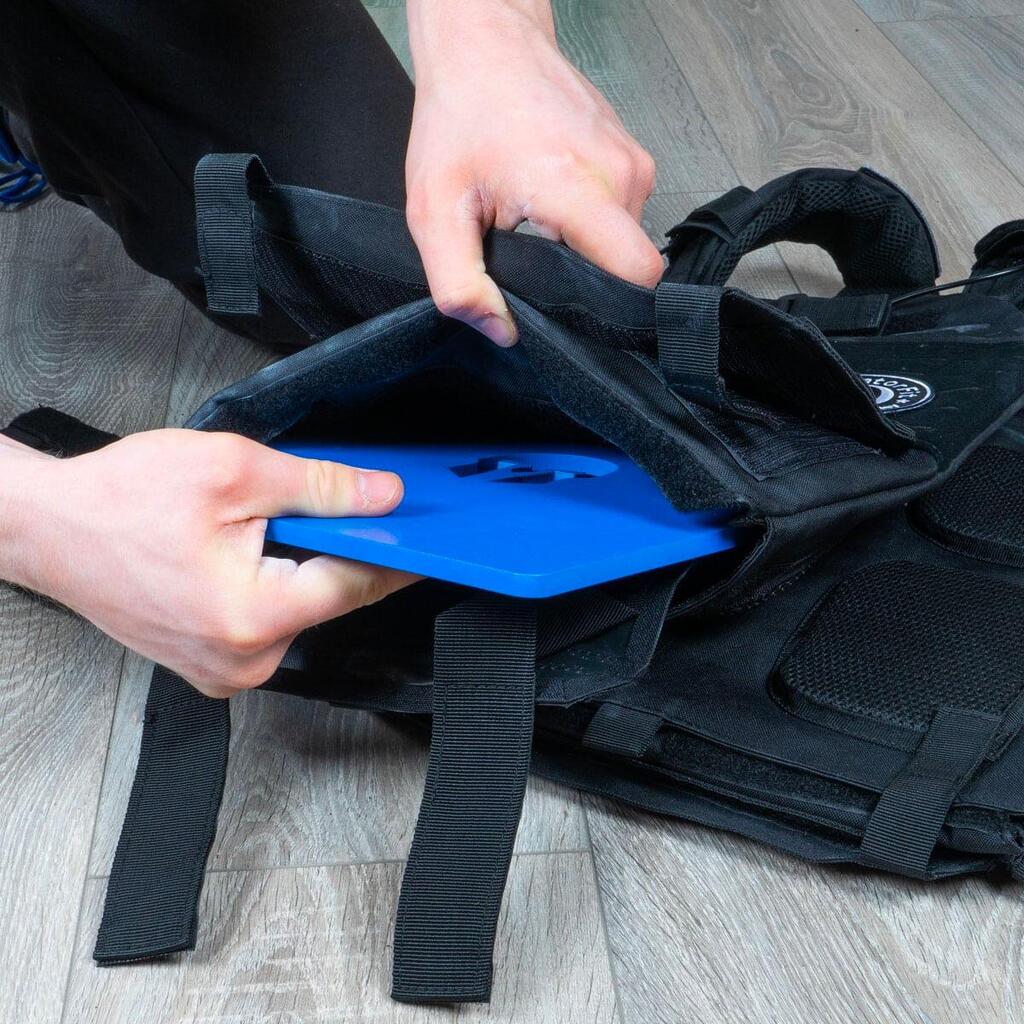 Each anti-corrosion film-coated steel weight plate slides and locks easily into sturdy pockets with Velcro flaps. Reinforced seams withstand thousands of training cycles, while breathable mesh efficiently wicks away perspiration to avoid the "plastic bag" effect.