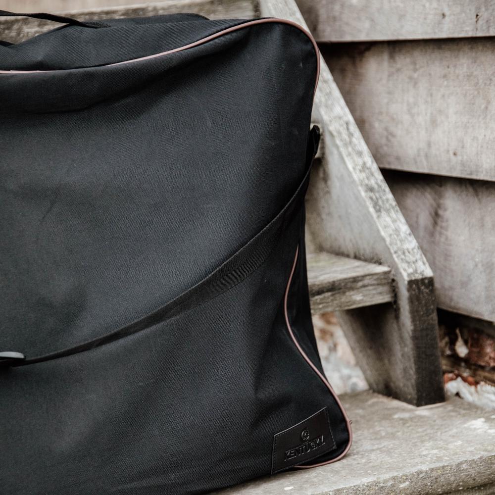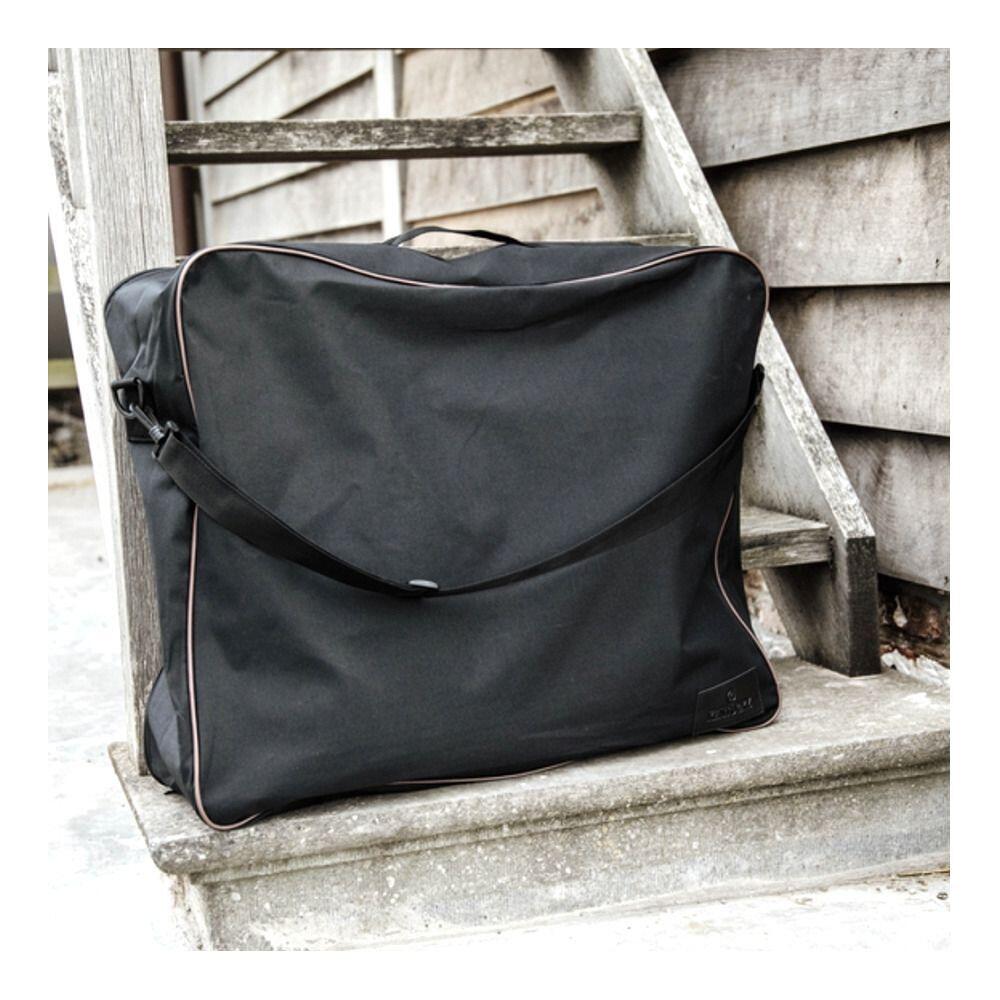 This elegant and practical Saddle Pad Bag is made out of heavy duty 600D polyester fabric with a waterproof coating and a nice finishing touch with artificial leather piping. It has been specially