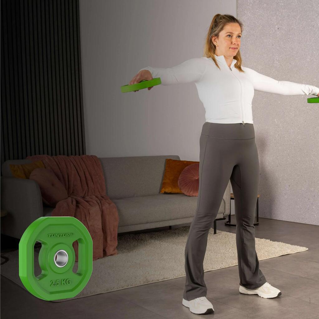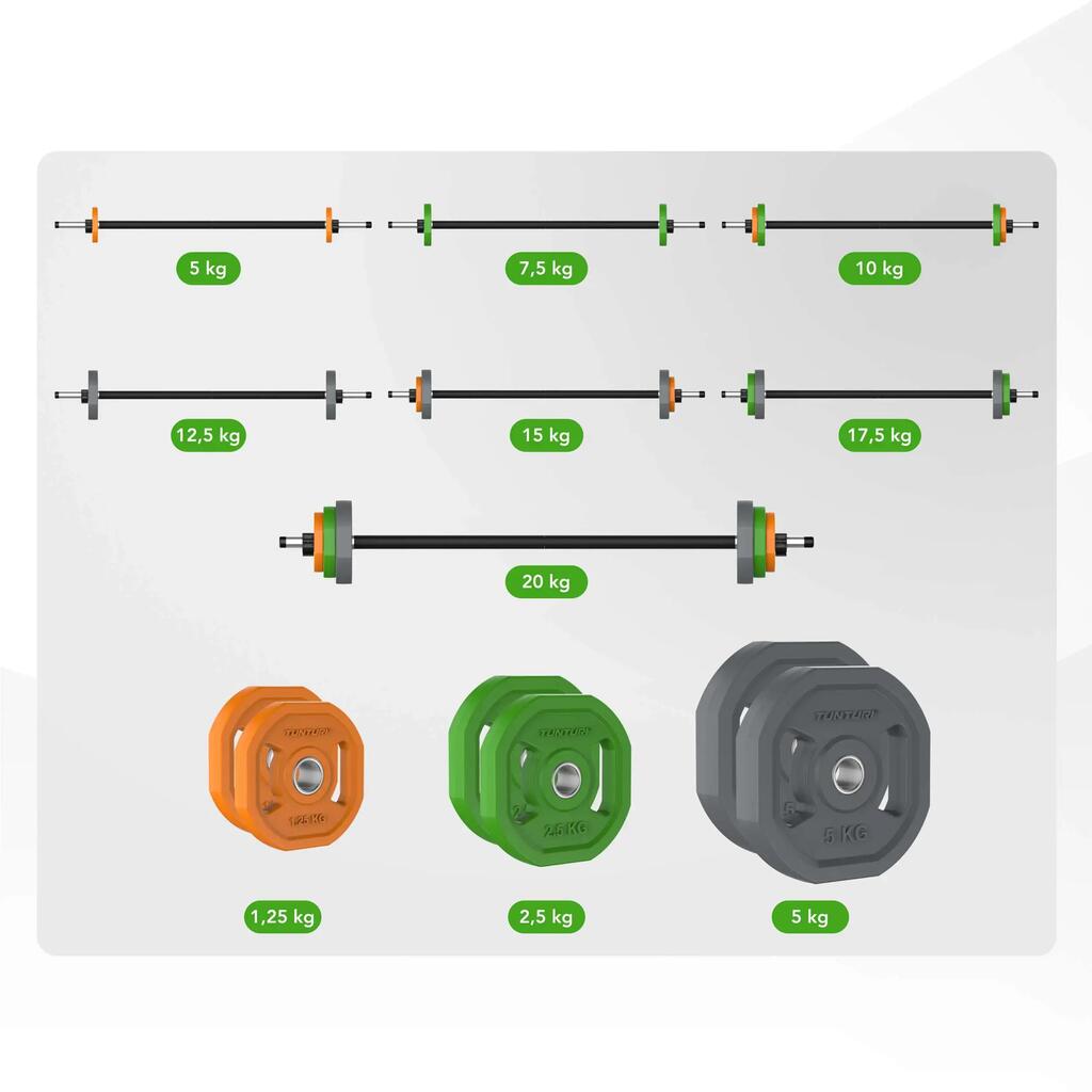 The different weights of 1.25, 2.5 and 5 kg each have their own recognizable color. You can quickly and easily find and change the right weight. Need more of a challenge? The set can be expanded with Tunturi Aerobic Weight Plates of 10 kg to make your workouts more difficult.