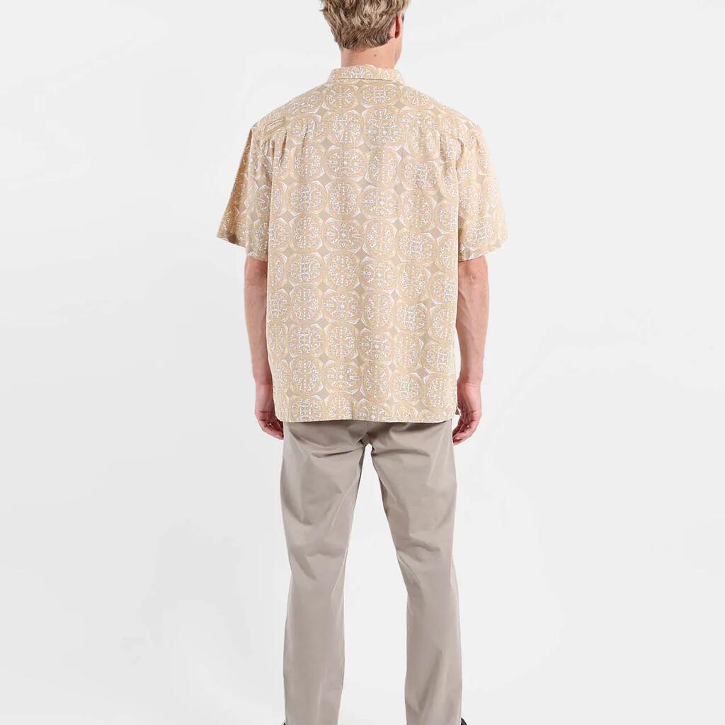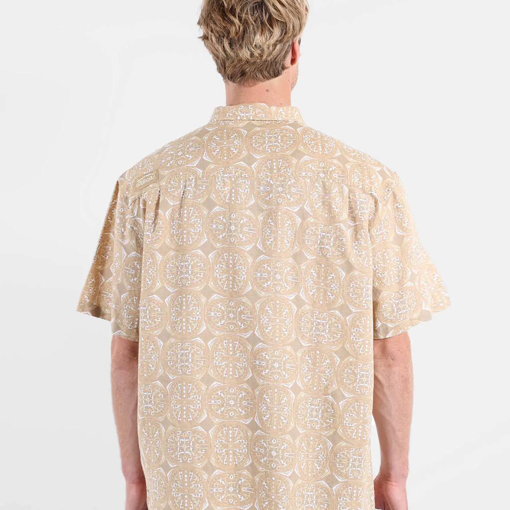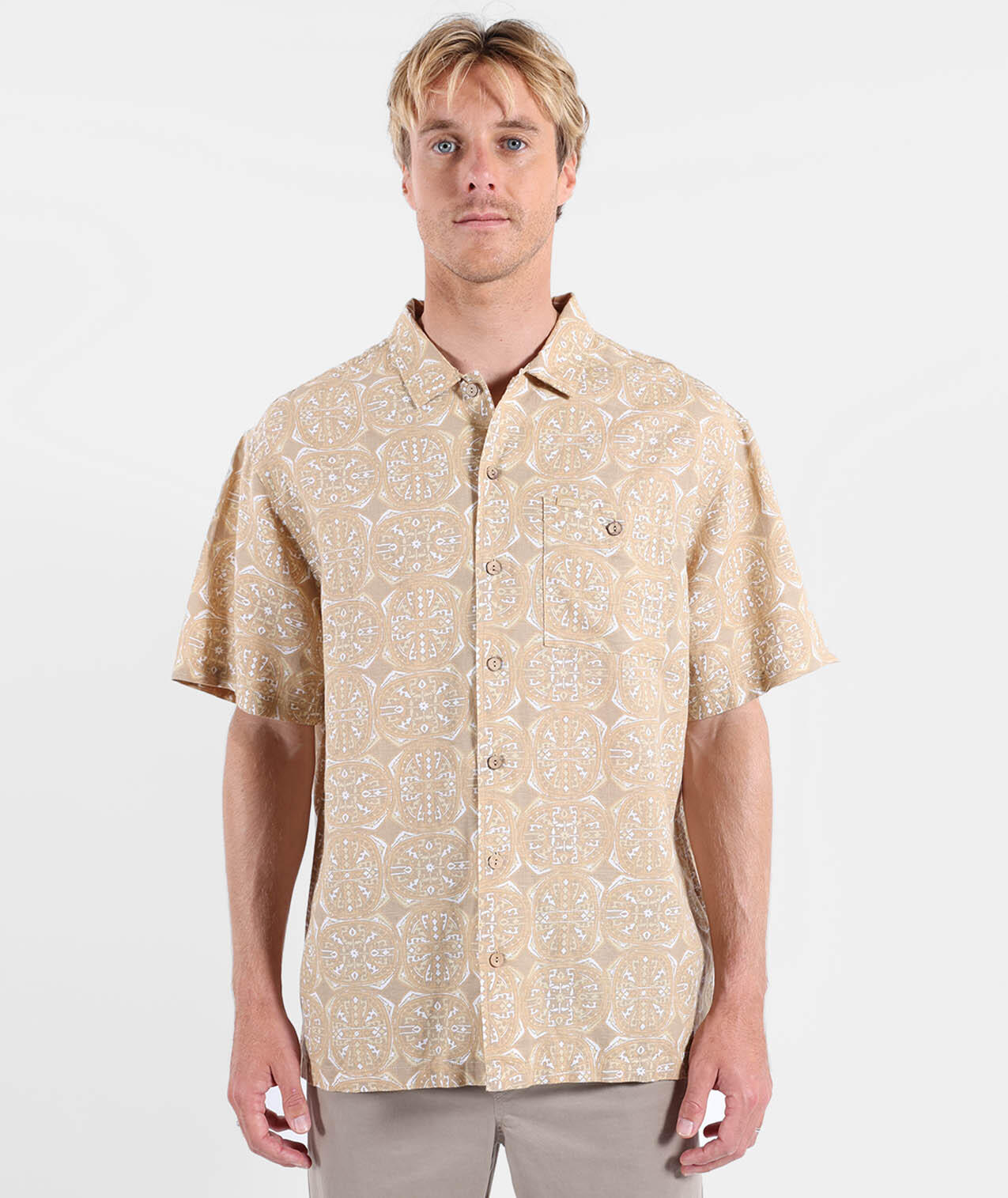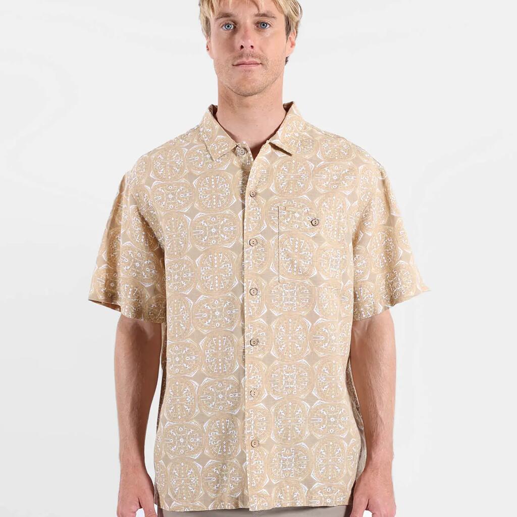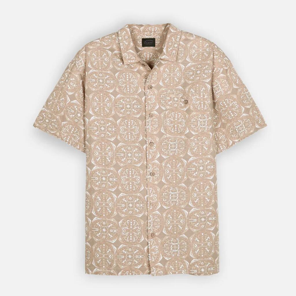 Light short-sleeve shirt in cotton-linen, convertible collar, allover print, buttoned chest patch pocket, and historic patch, washed fabric for softness.
