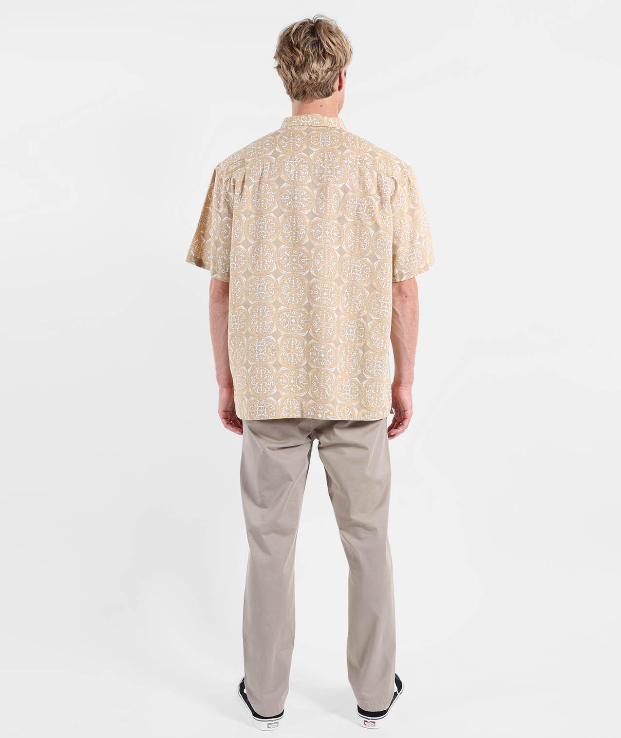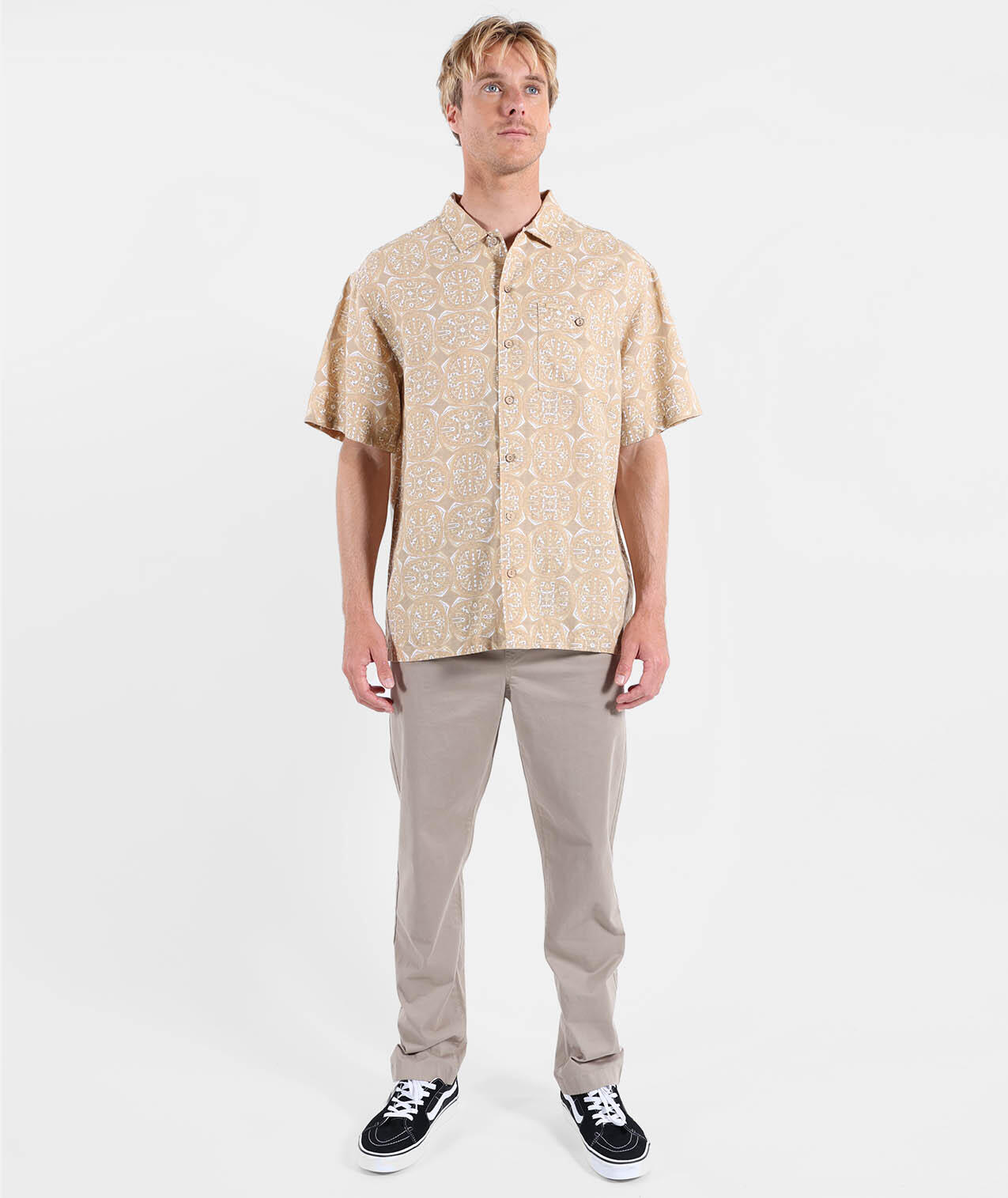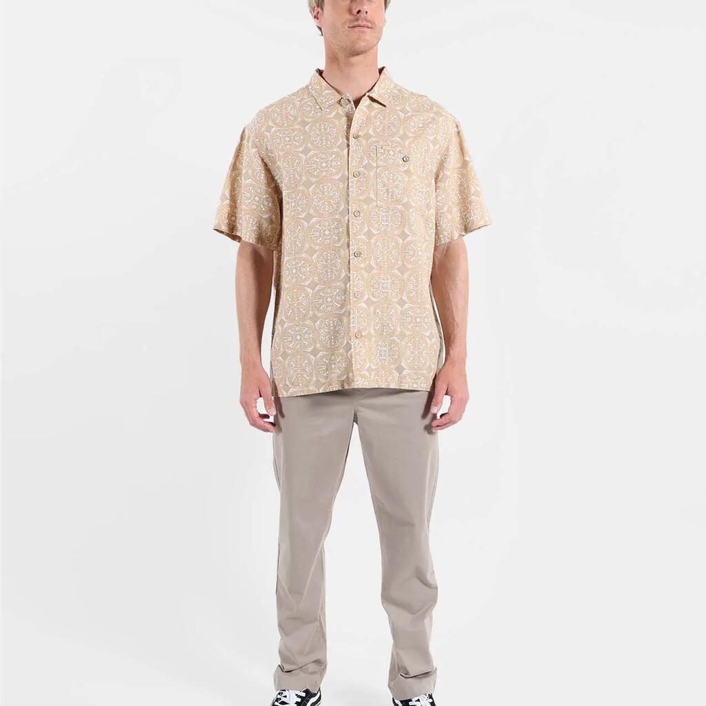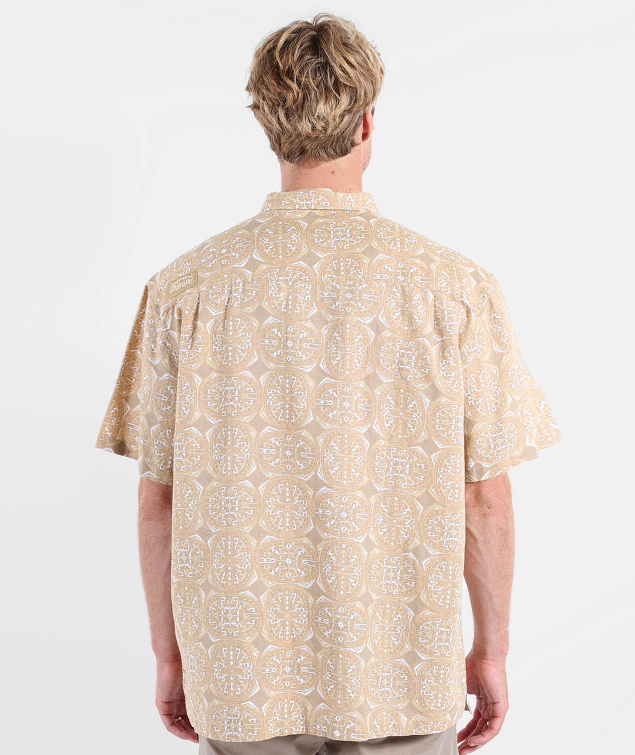 Light short-sleeve shirt in cotton-linen, convertible collar, allover print, buttoned chest patch pocket, and historic patch, washed fabric for softness.