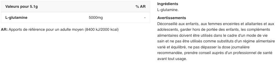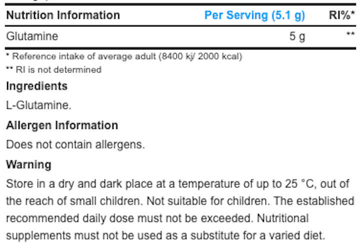 Food supplement based on L-glutamine, intended to support muscle function and the immune system during intense physical activity.
