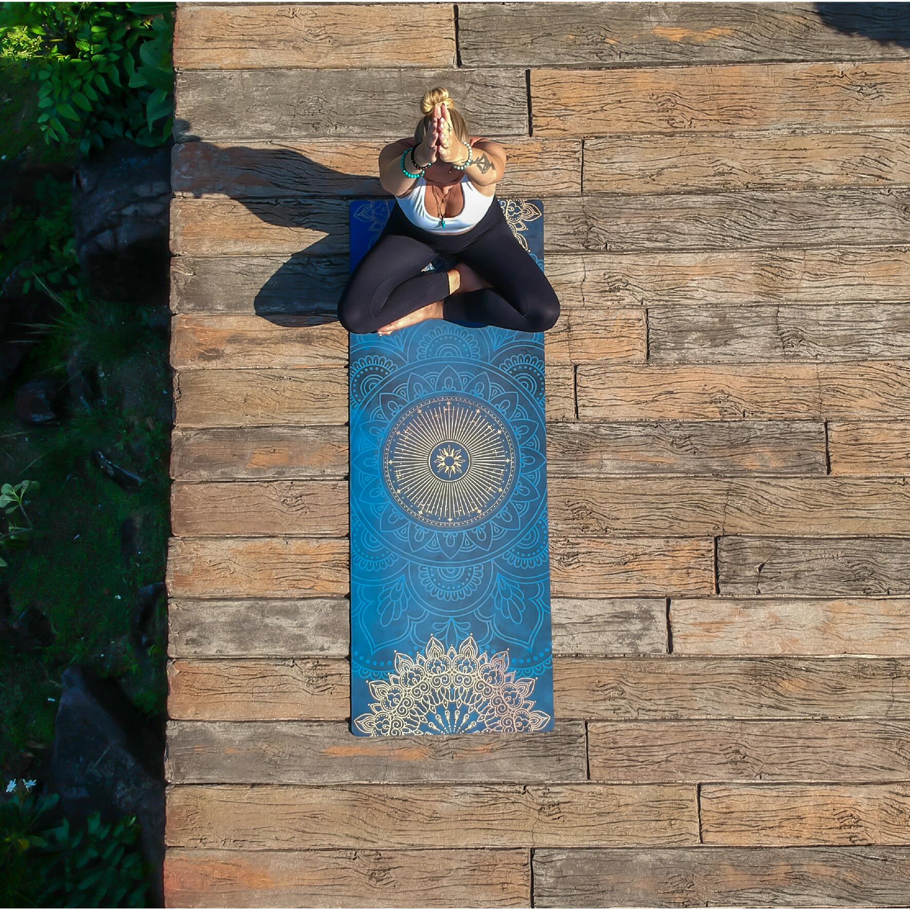 Comfortable yoga mat made from rubber and a recycled microfiber surface. It is extra wide and long (183 x 68 cm) and offers the ideal balance of comfort, cushioning, and slip resistance.