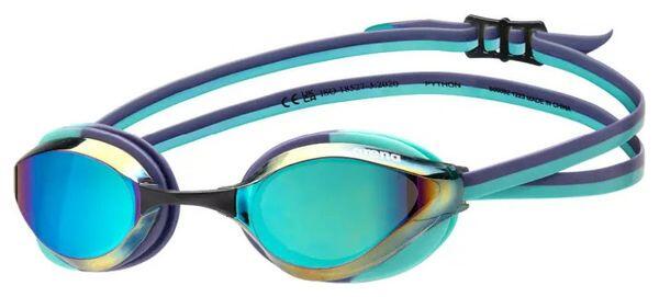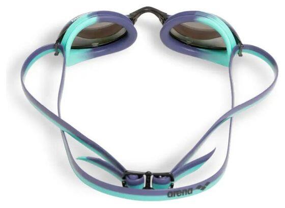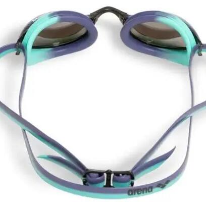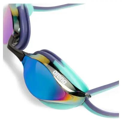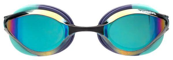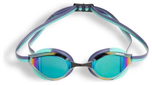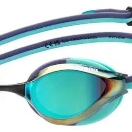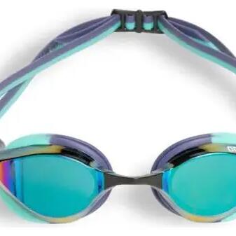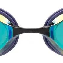 Hydrodynamic mirror goggles with wide field of view and stable fit for focused training and racing performance.