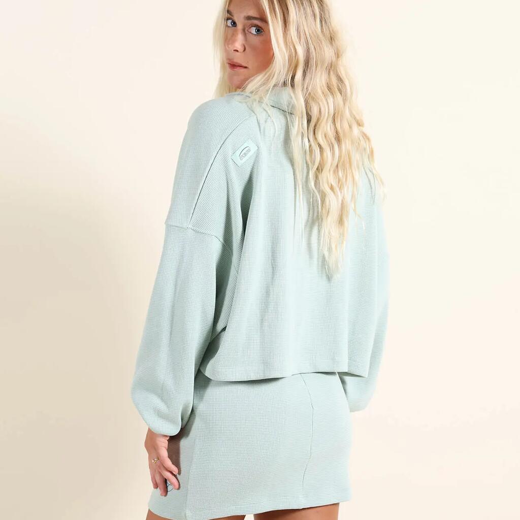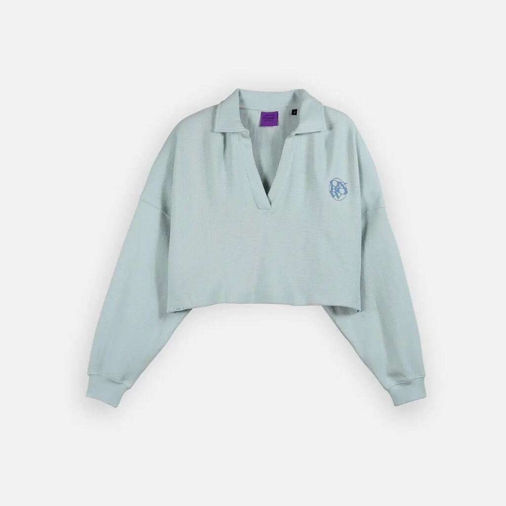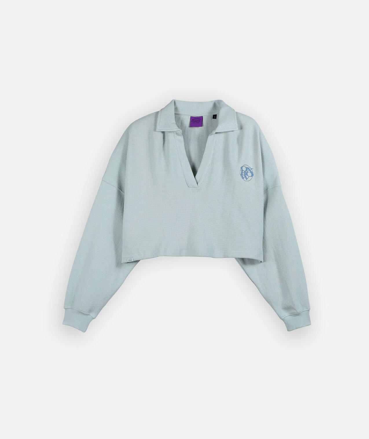 Waffle fabric polo top with collar without buttons, printed logo on chest and ribbed cuffs.