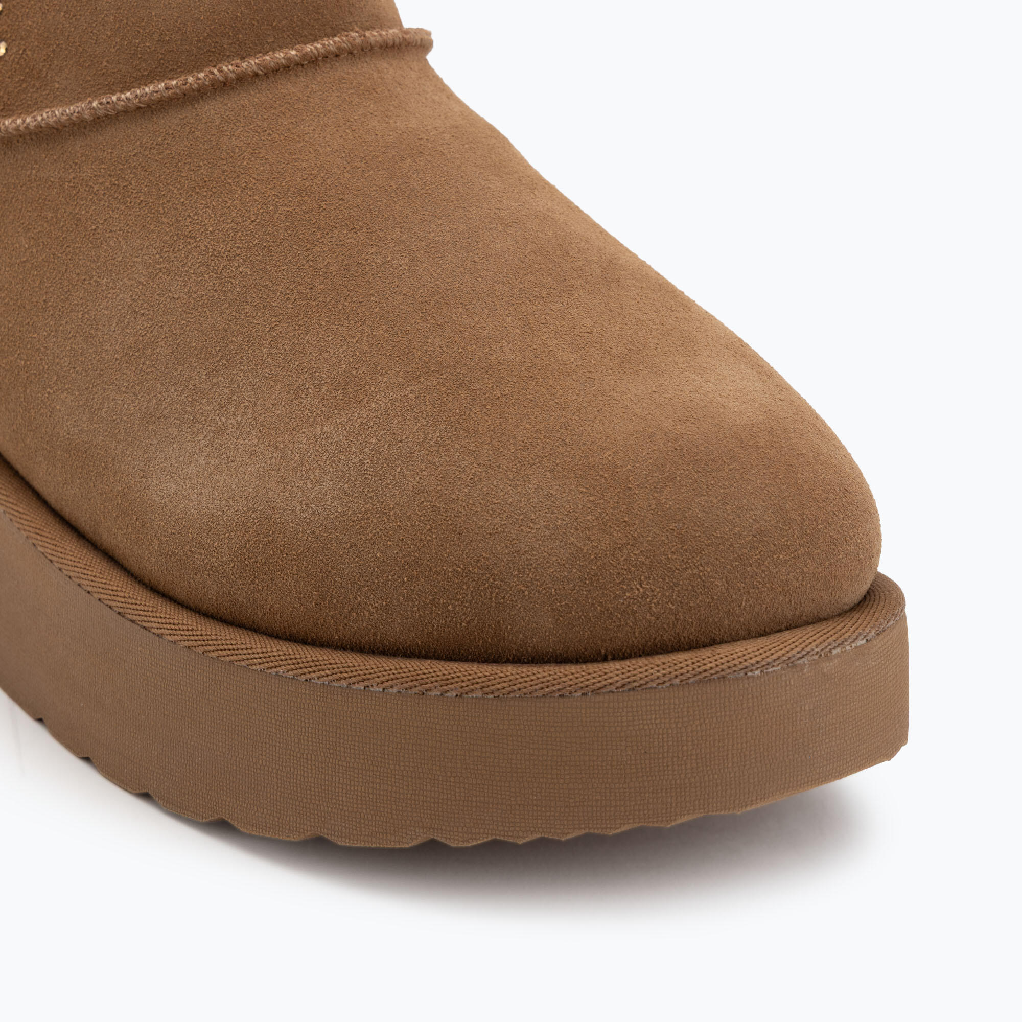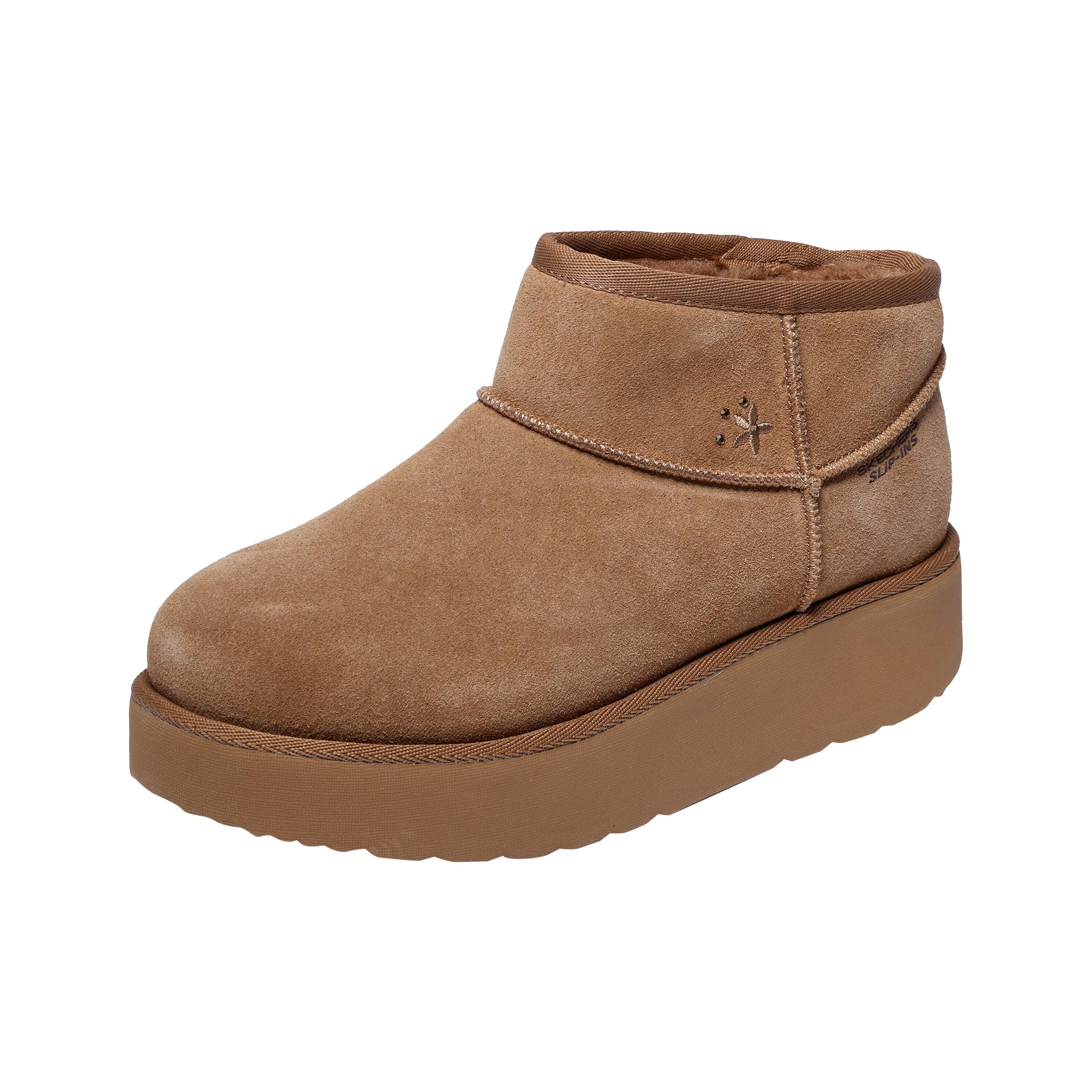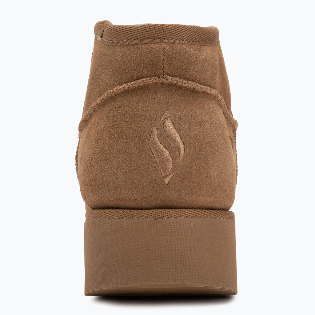 Ankle boots with suede leather upper, wool lining, and memory foam insole offer warmth and comfort. Features slip-on design, water resistance, 2.5-inch shaft, 1.5-inch heel, and rubber sole
