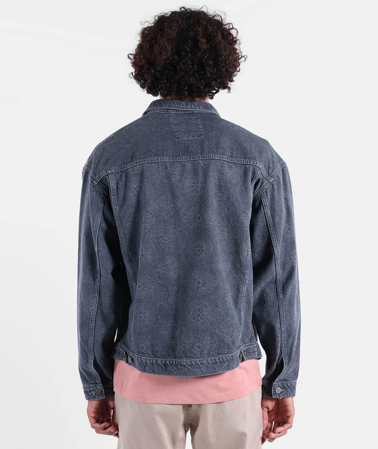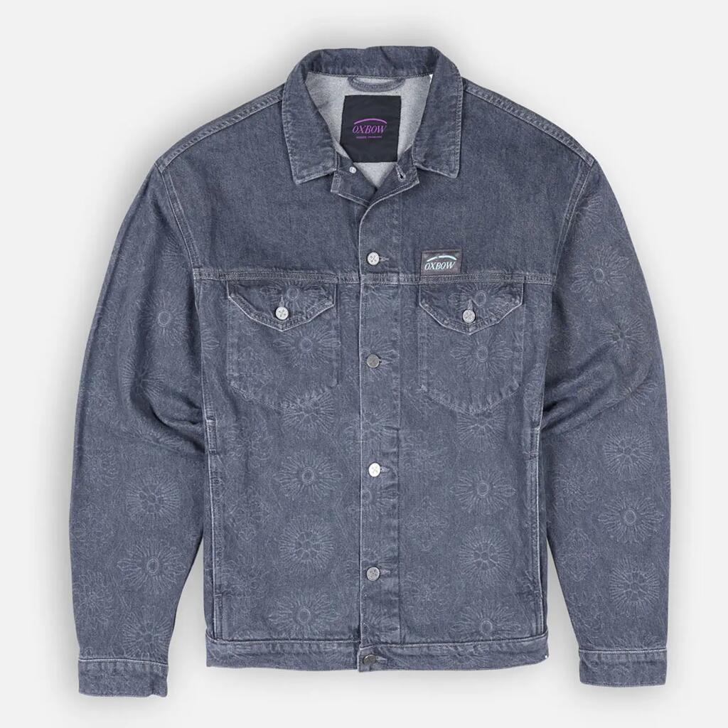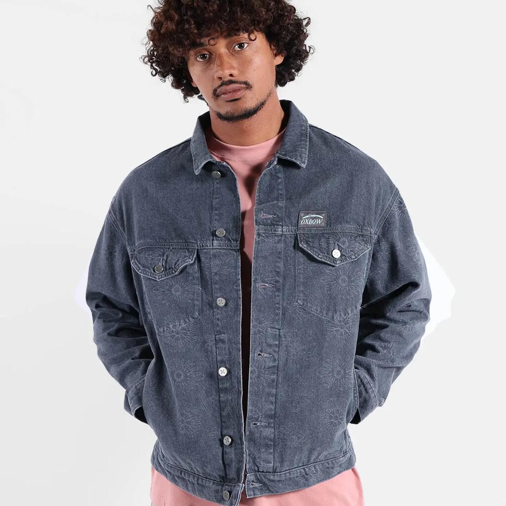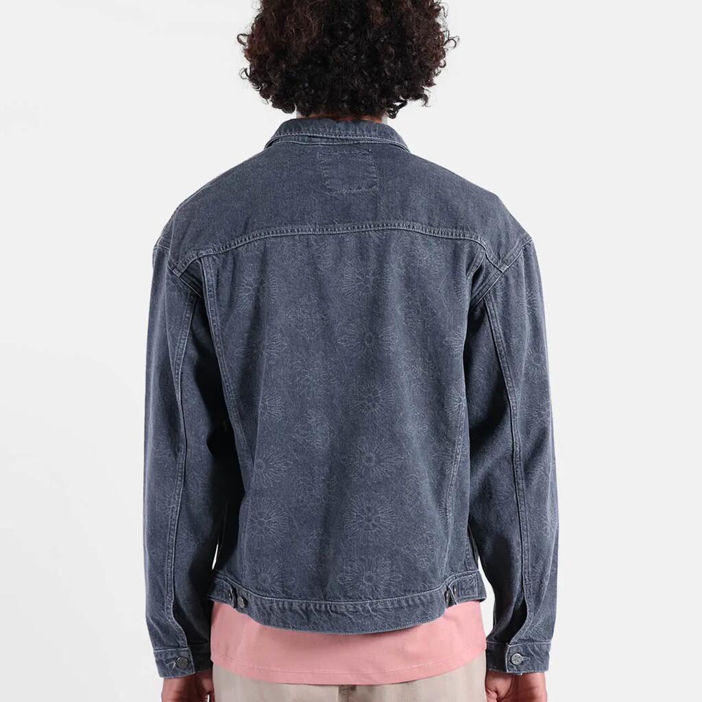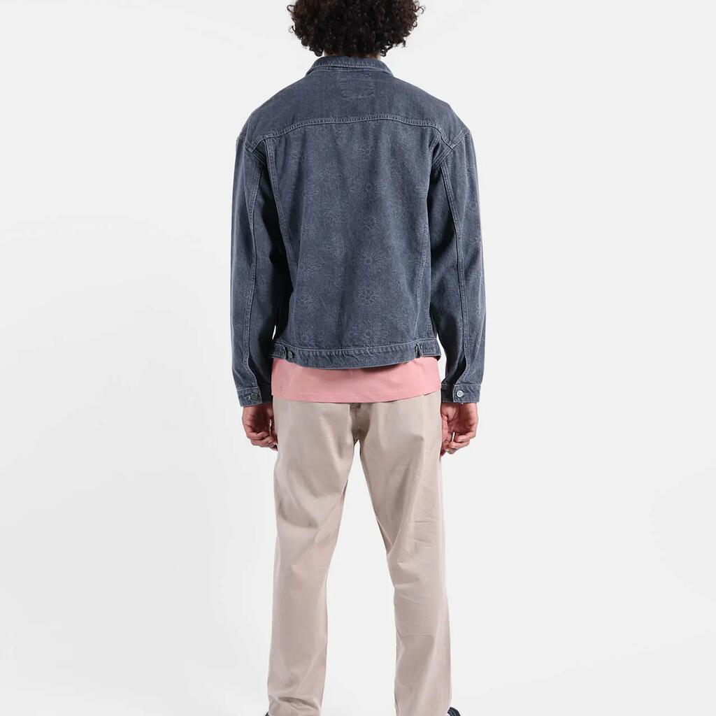 Washed cotton twill trucker jacket with side and chest pockets, tightening buttons, woven label and tone-on-tone print.