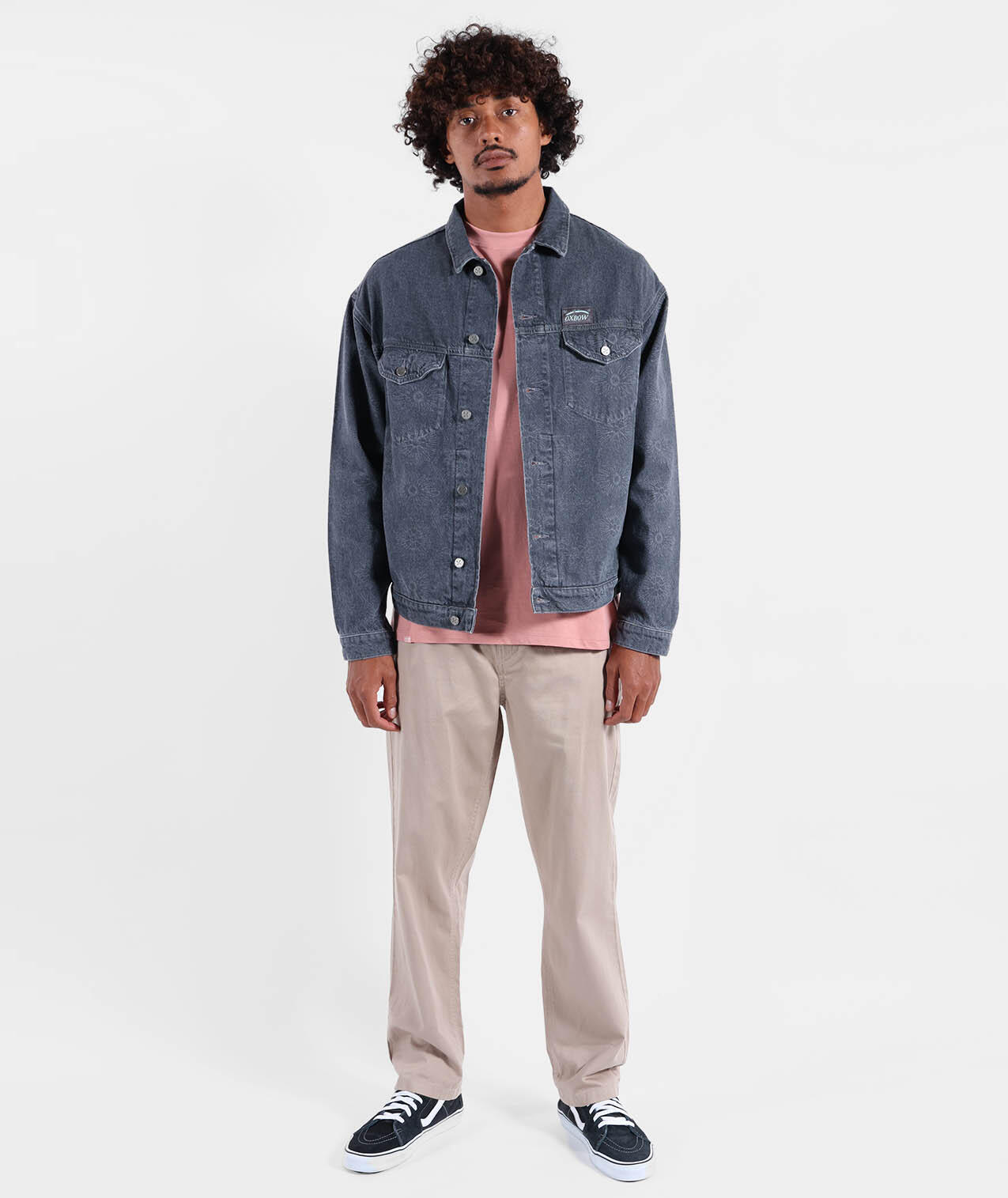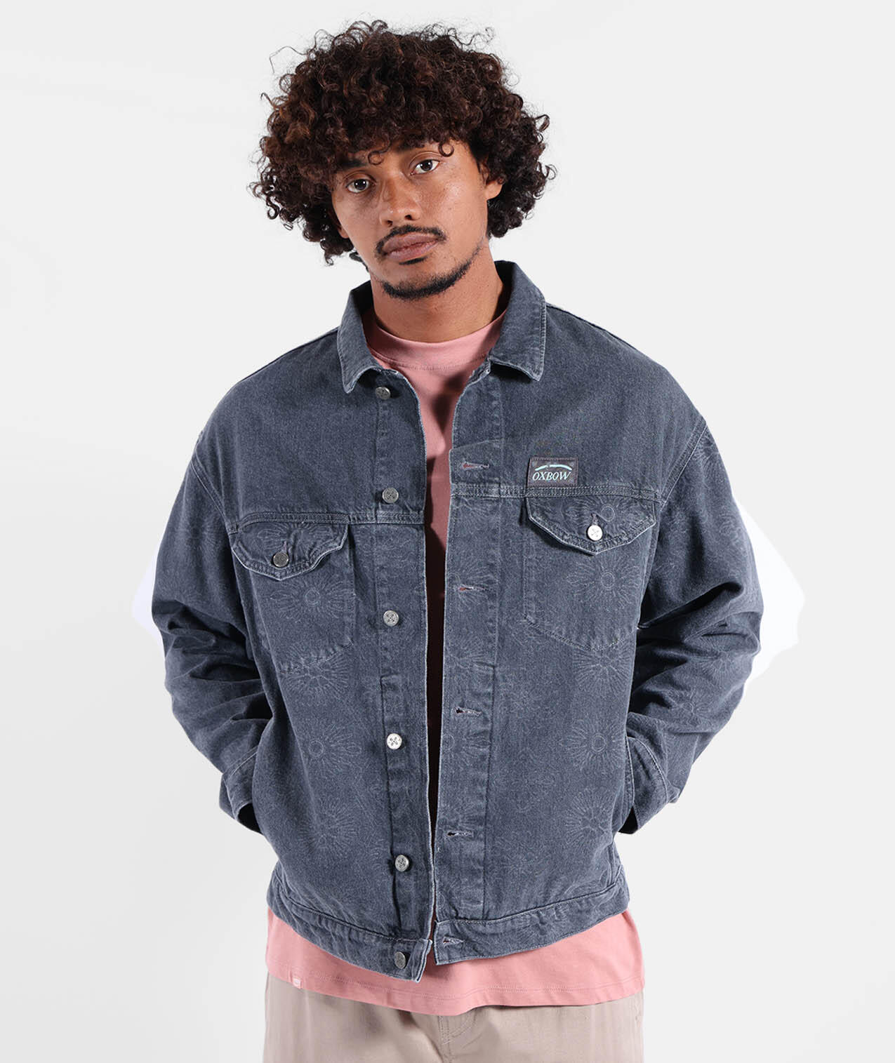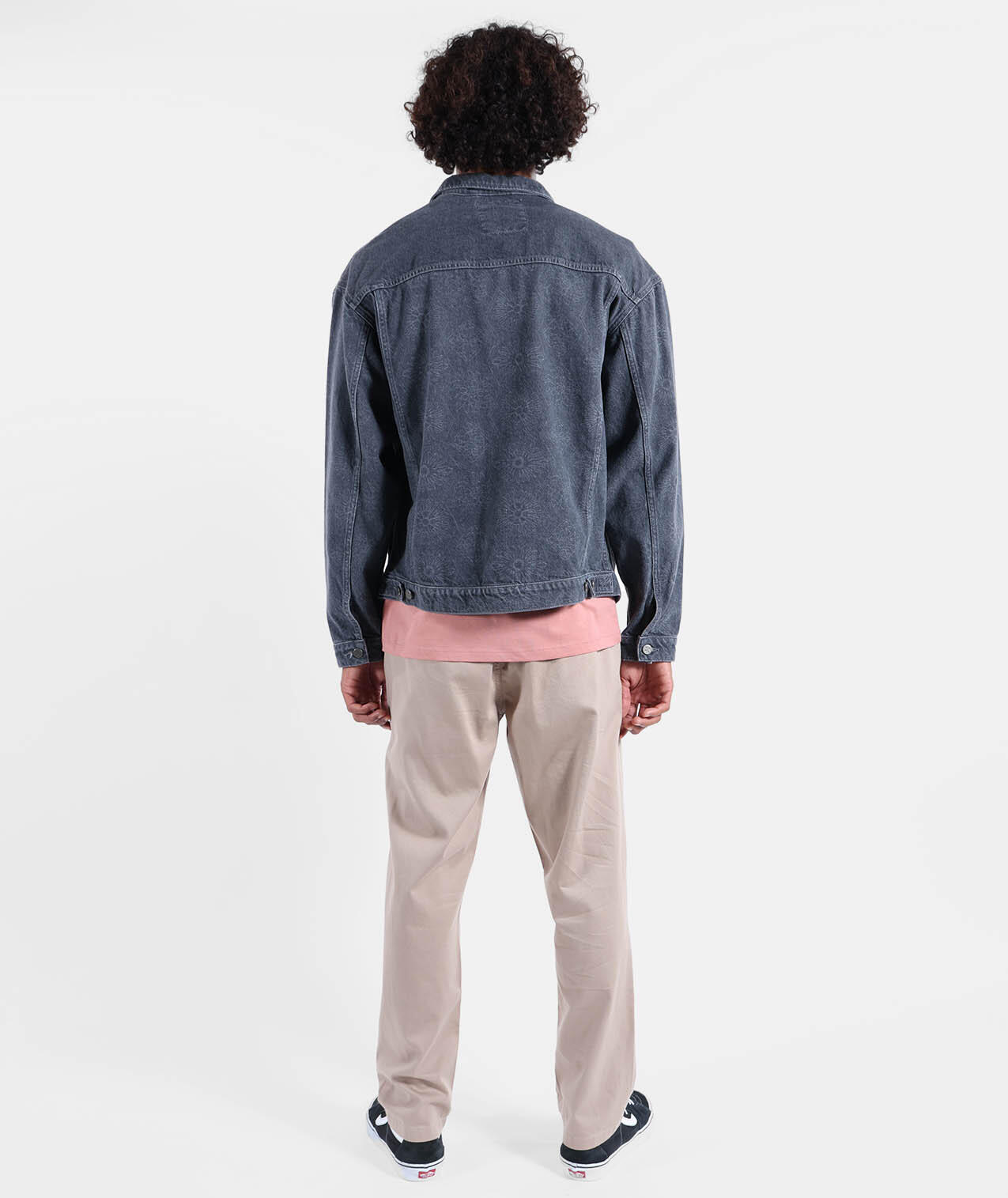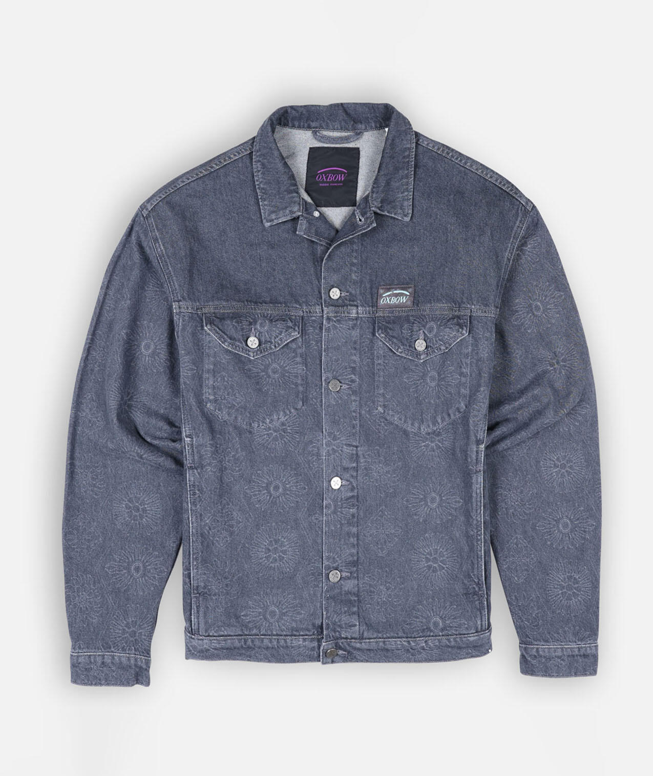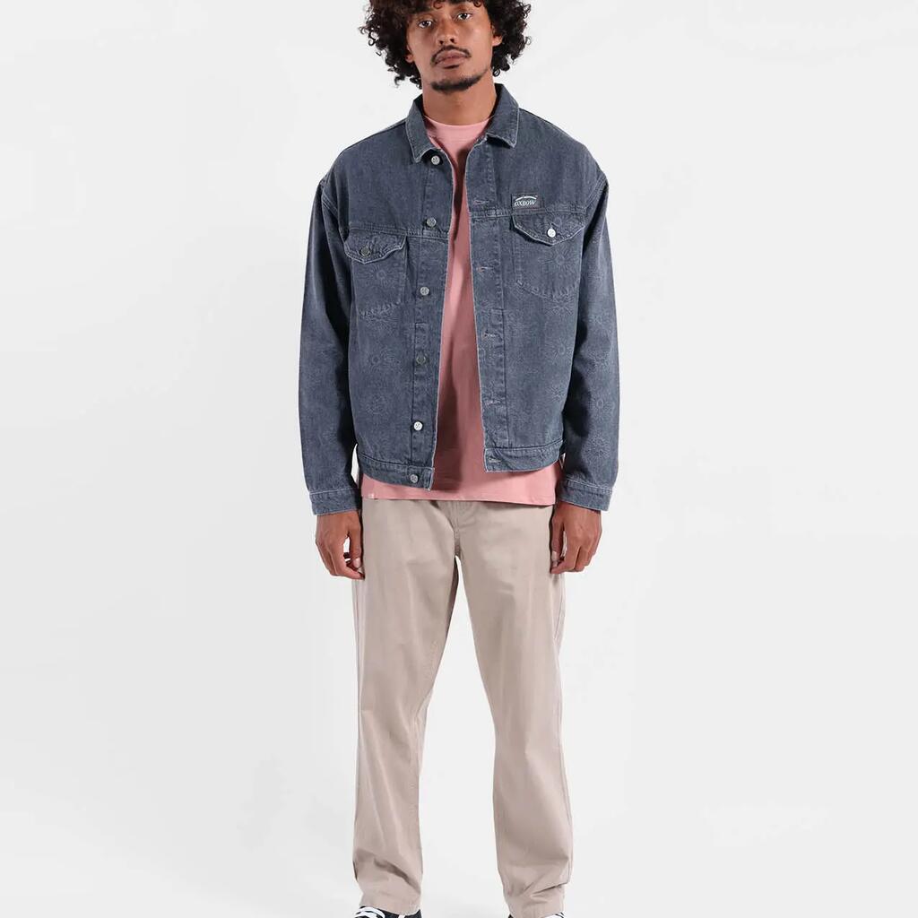 Washed cotton twill trucker jacket with side and chest pockets, tightening buttons, woven label and tone-on-tone print.