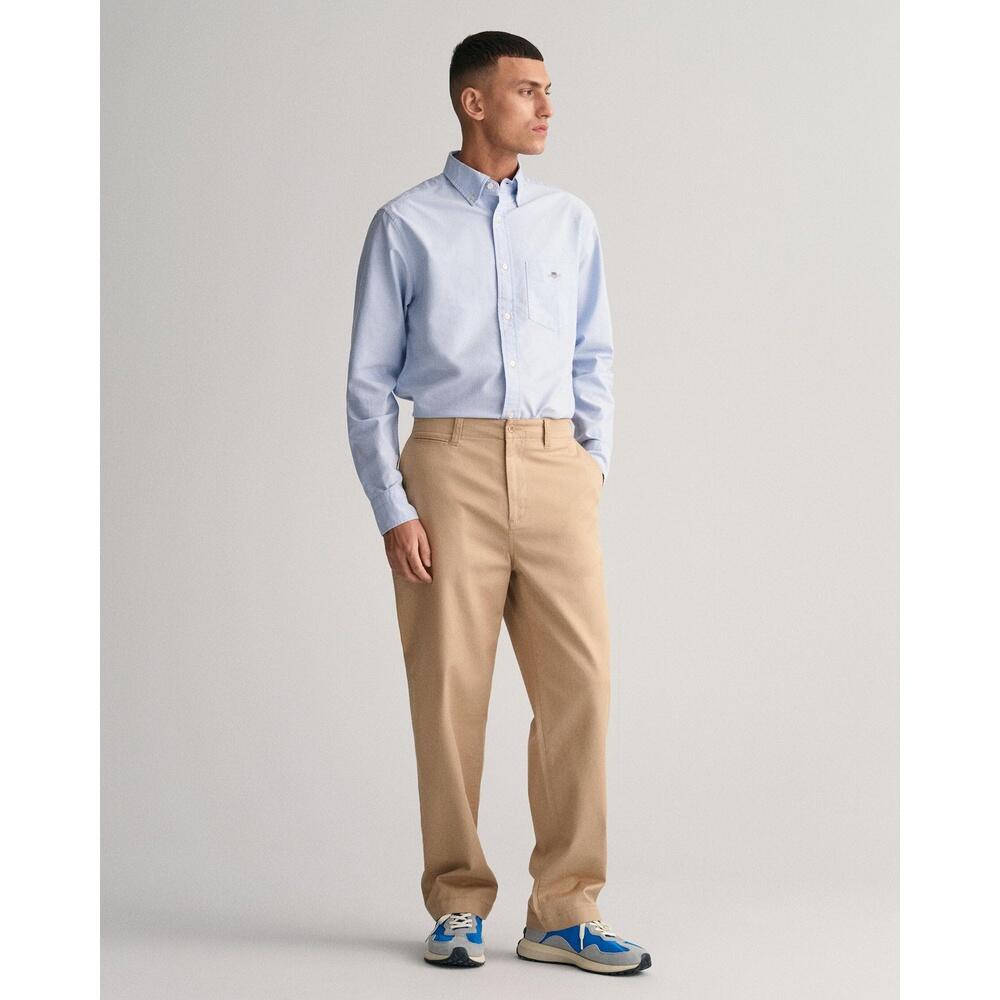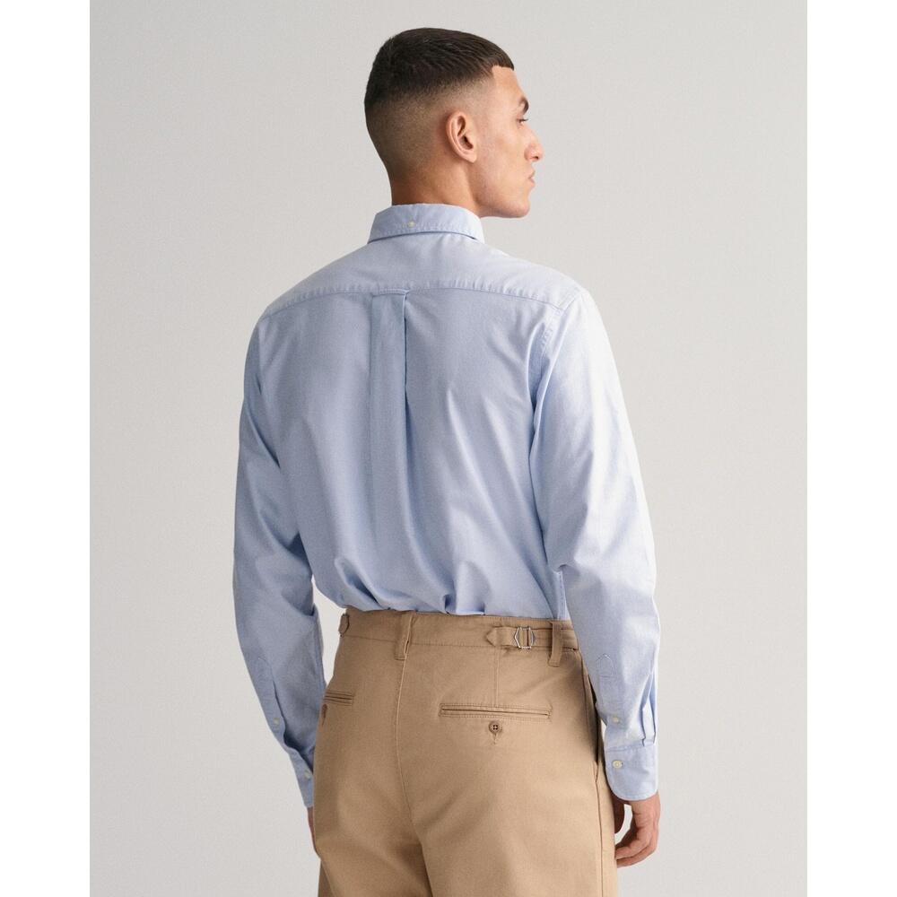 GANT men's regular fit long sleeve Oxford shirt made from durable cotton. Features a chest pocket, button-down collar, curved hem, and adjustable cuffs for versatile style