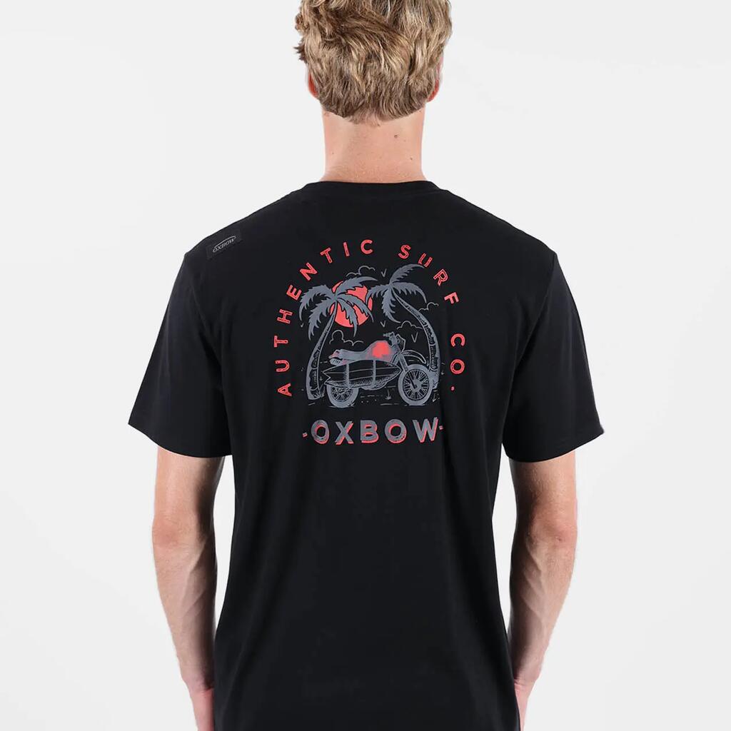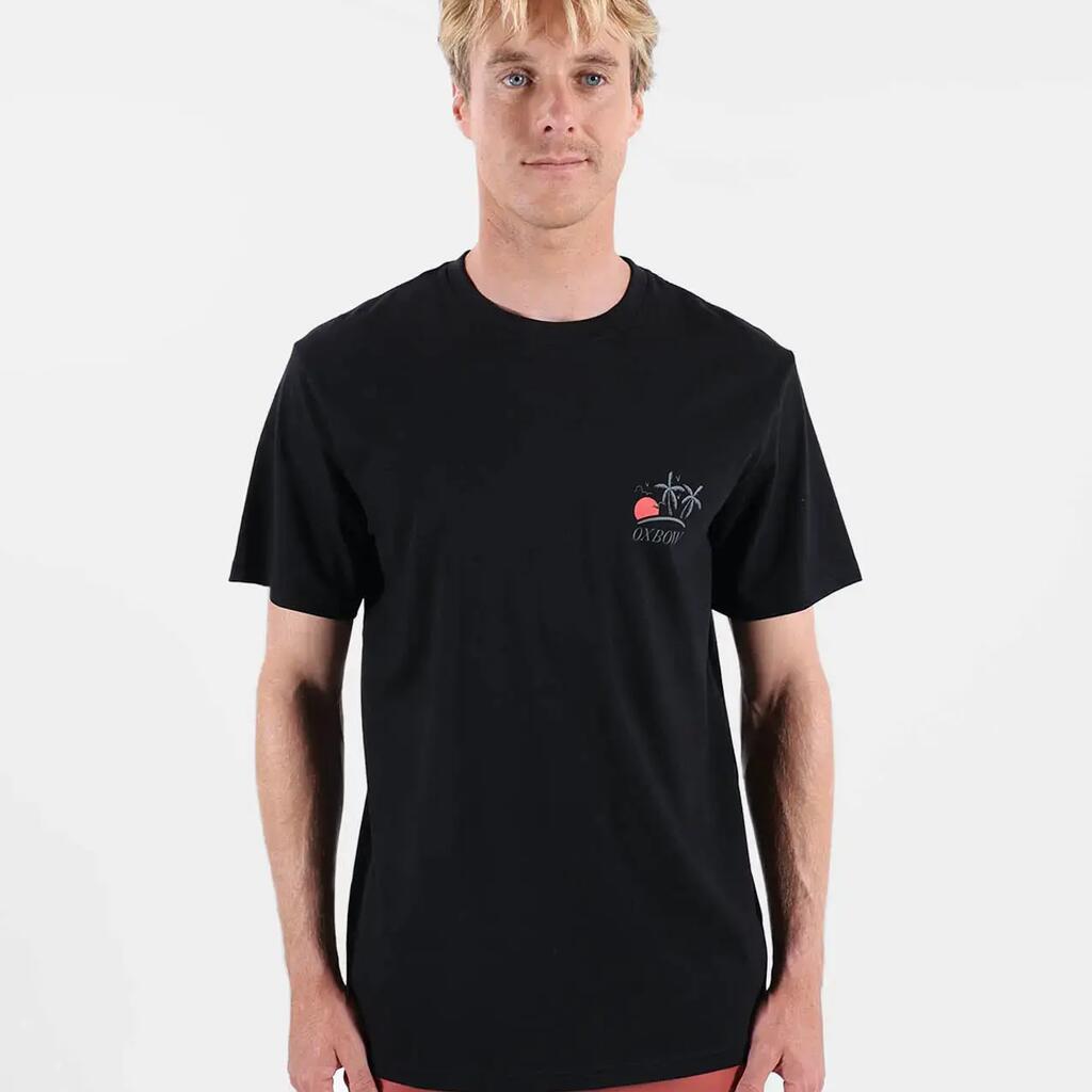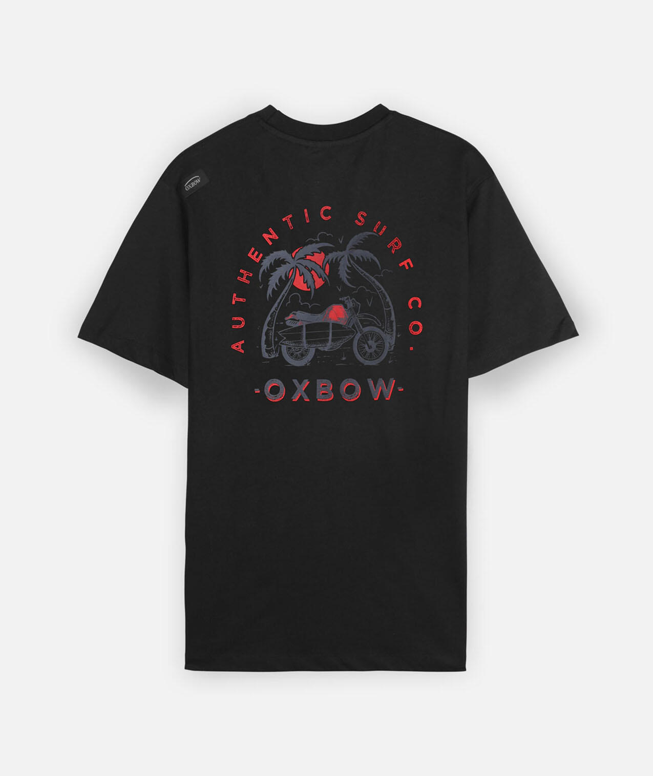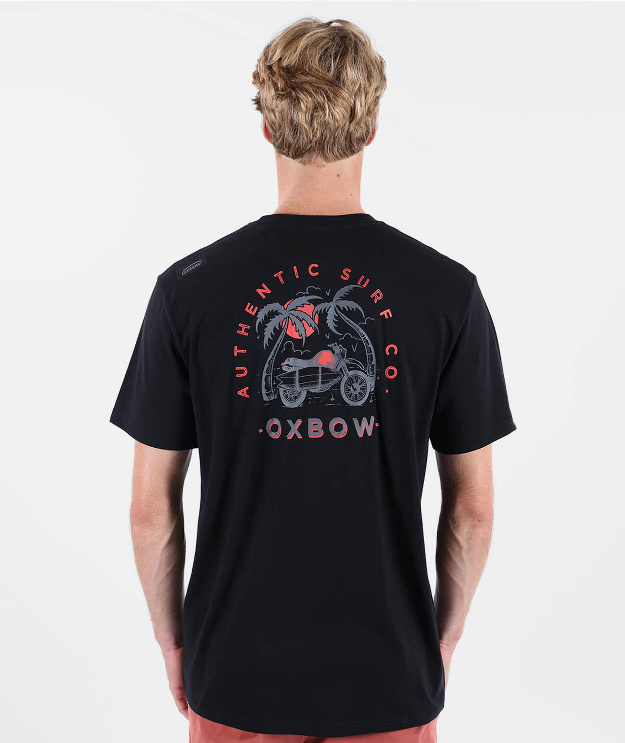 Crew neck tee, printed graphic on back with chest detail, woven label, combed cotton and recycled polyester jersey