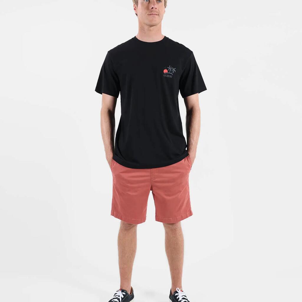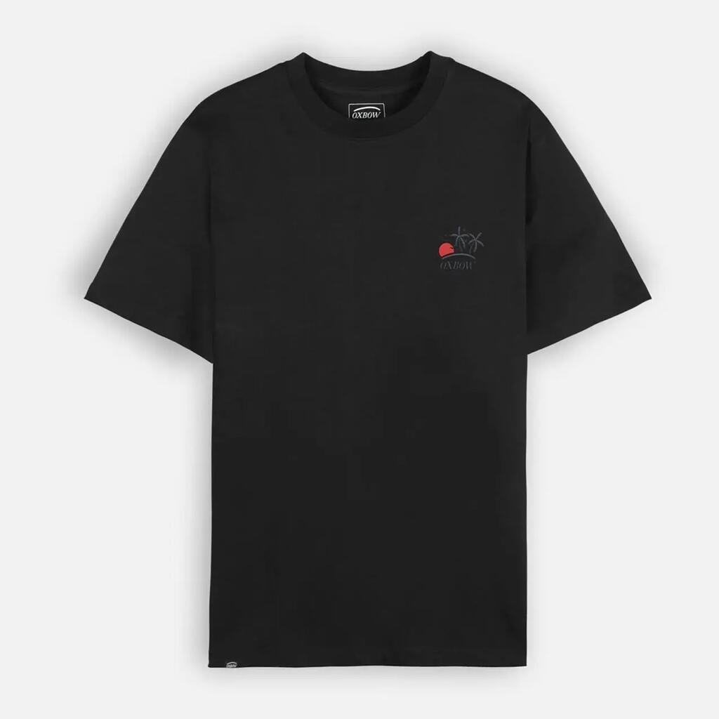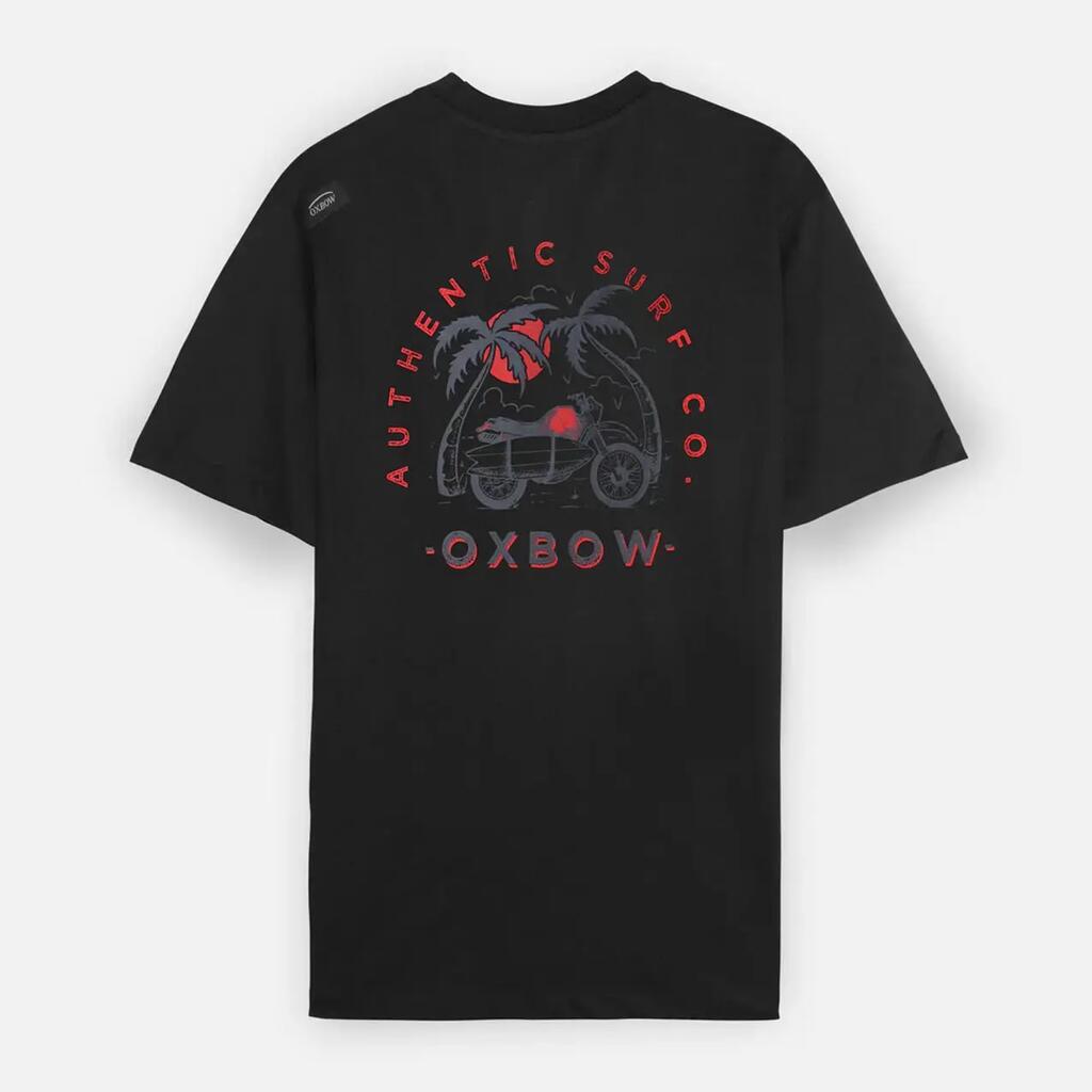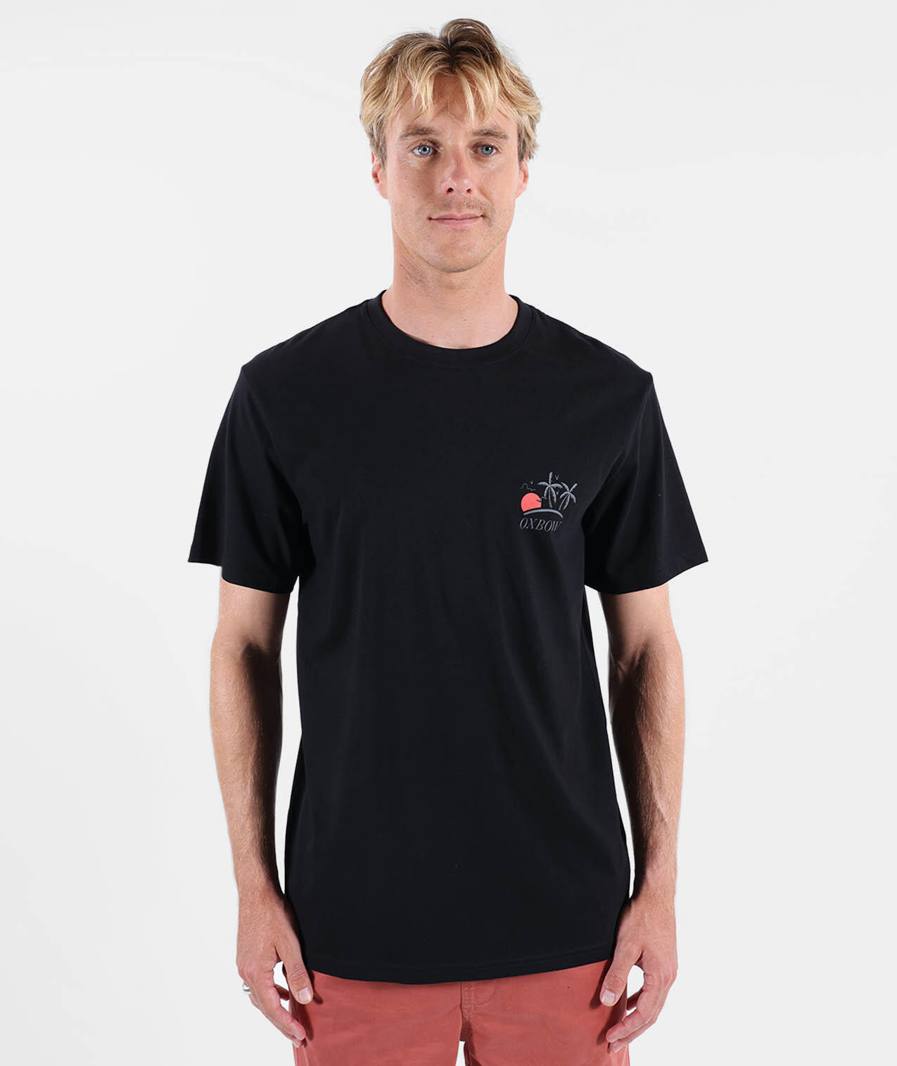 Crew neck tee, printed graphic on back with chest detail, woven label, combed cotton and recycled polyester jersey