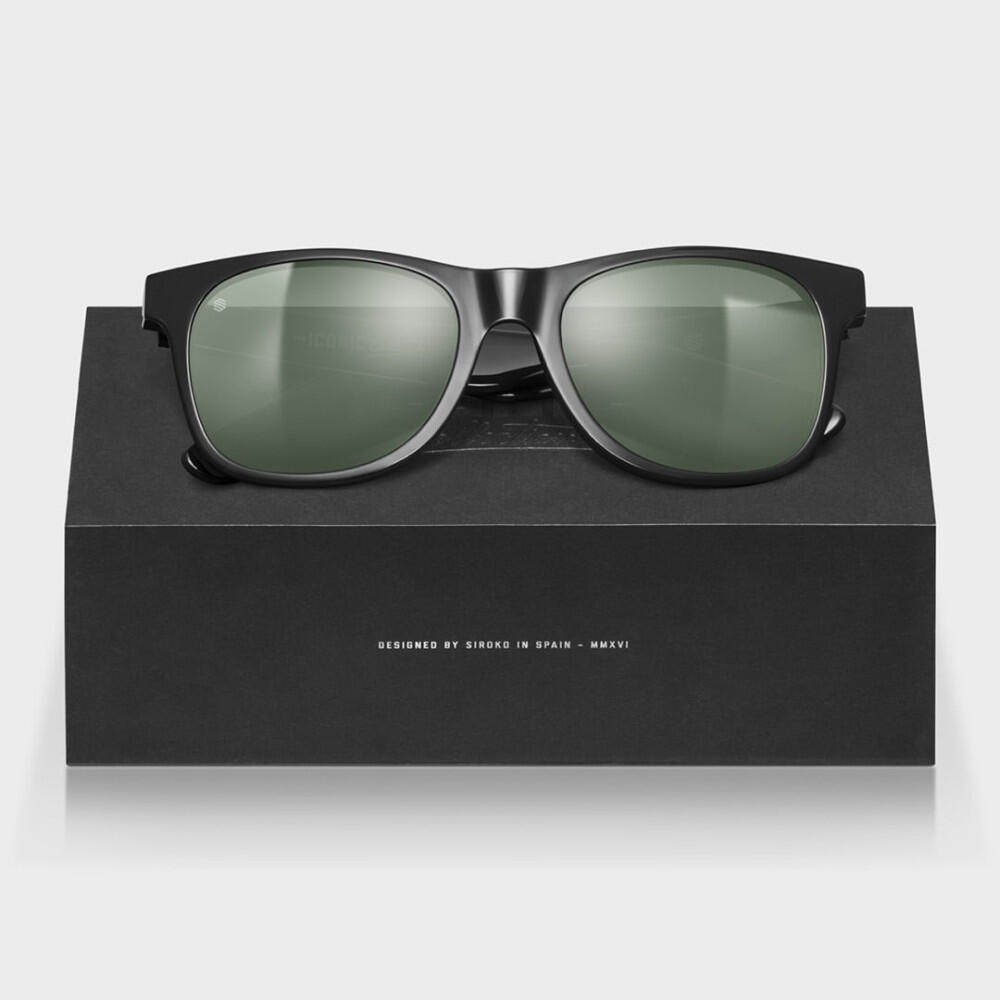 Unisex Siroko Iconic Kyoto sunglasses in black recycled acetate with green mineral lenses, surf‑urban design and case made from recycled materials.