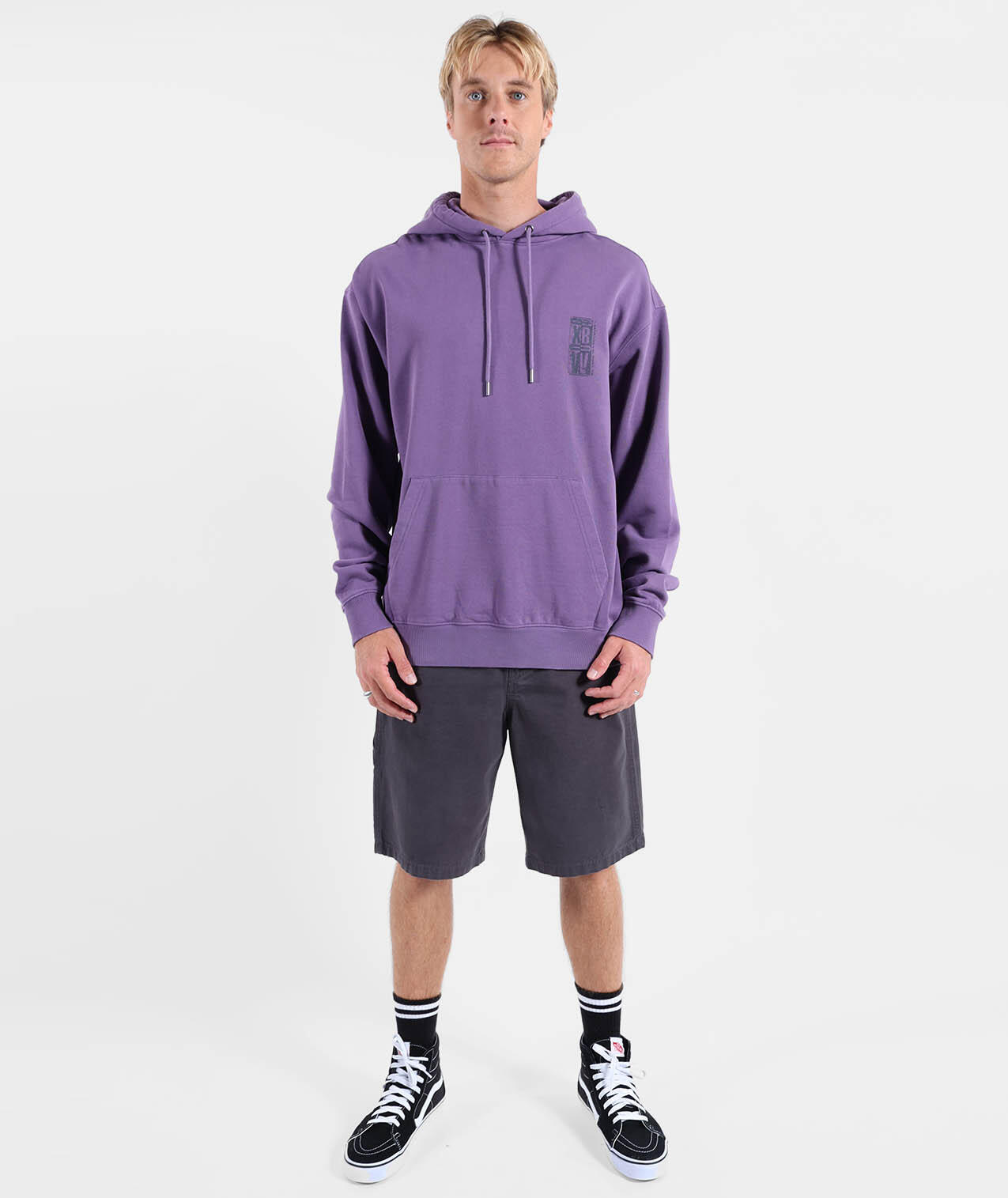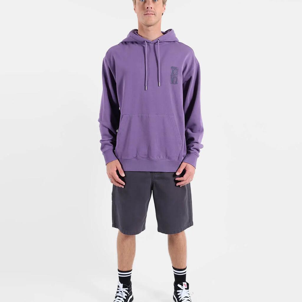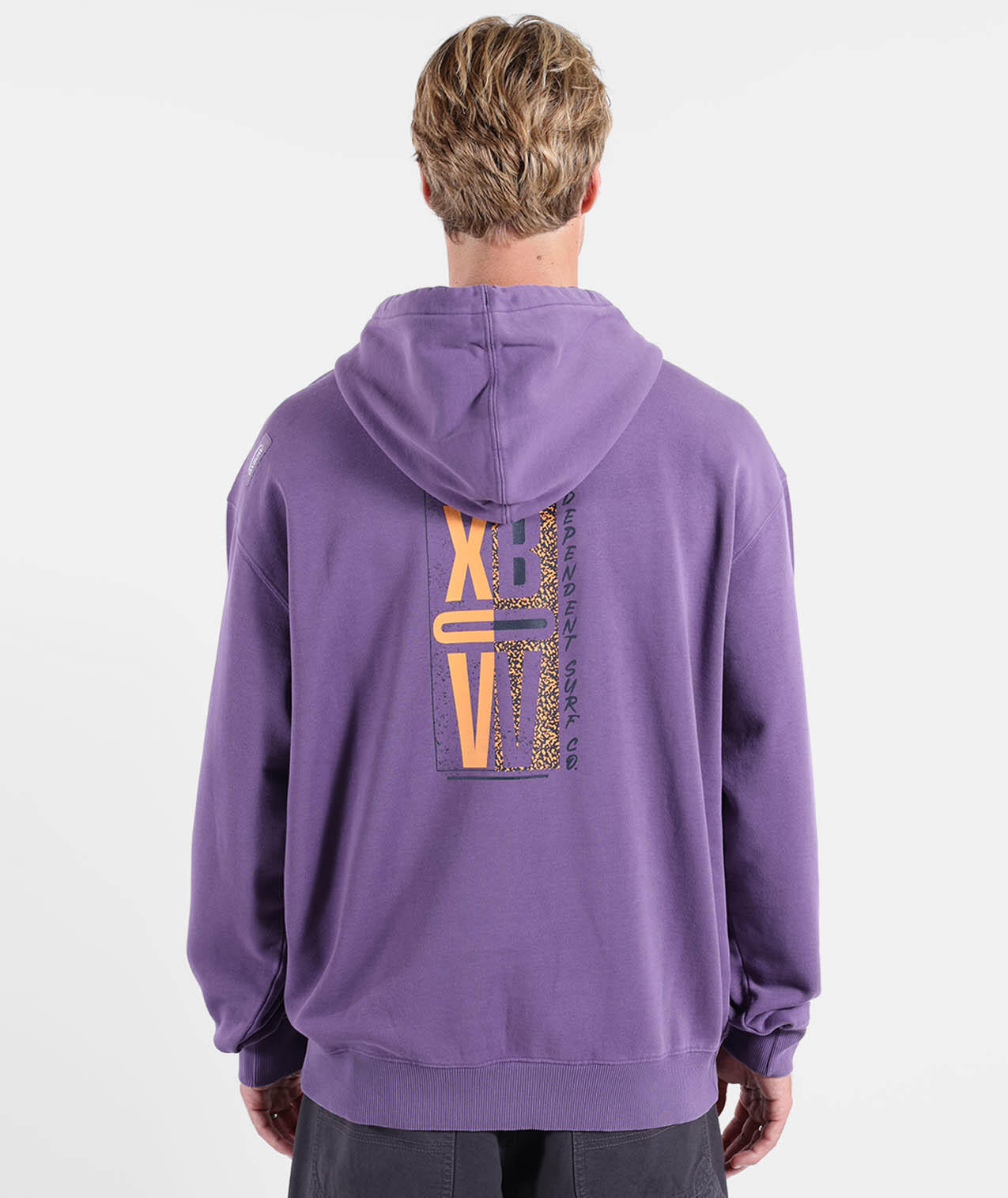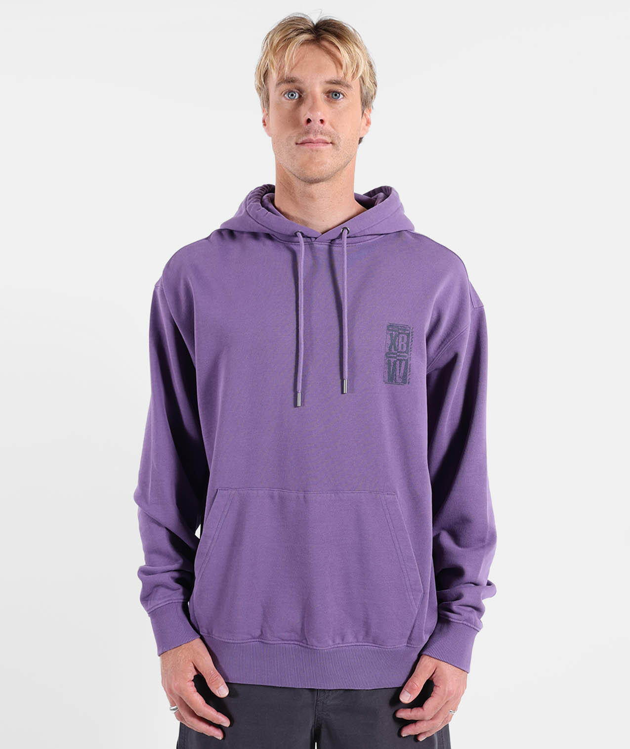 Hooded sweatshirt, ribbed edges, hood with drawstrings, printed graphic on back with chest detail, kangaroo pocket, heavy brushed fleece, dip-dyed and washed for faded colors effect