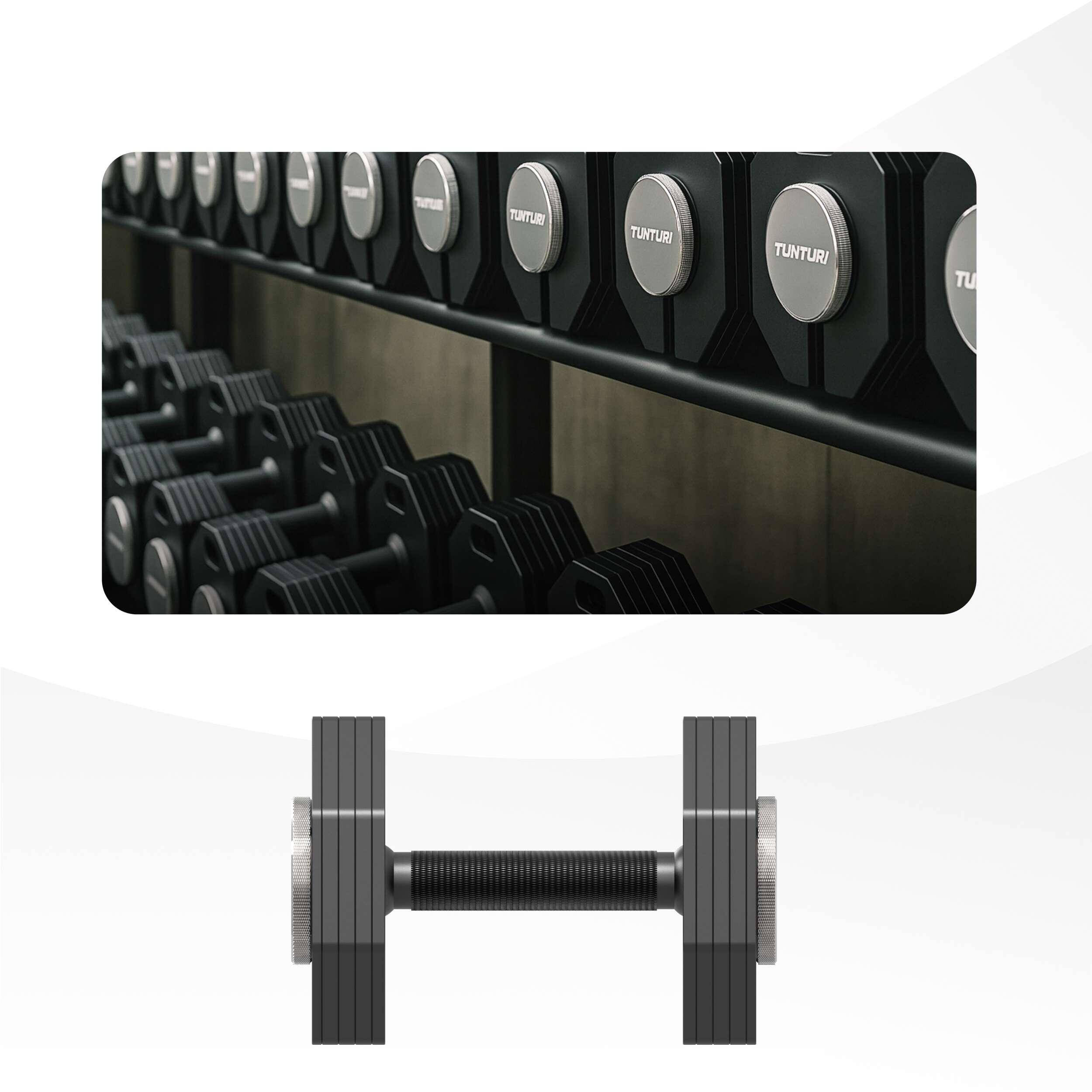 **Maximise your space with the Tunturi Rapid Adjustable Dumbbell (20 kg). A versatile, robust, and easily adjustable dumbbell that elevates every home strength training session.**