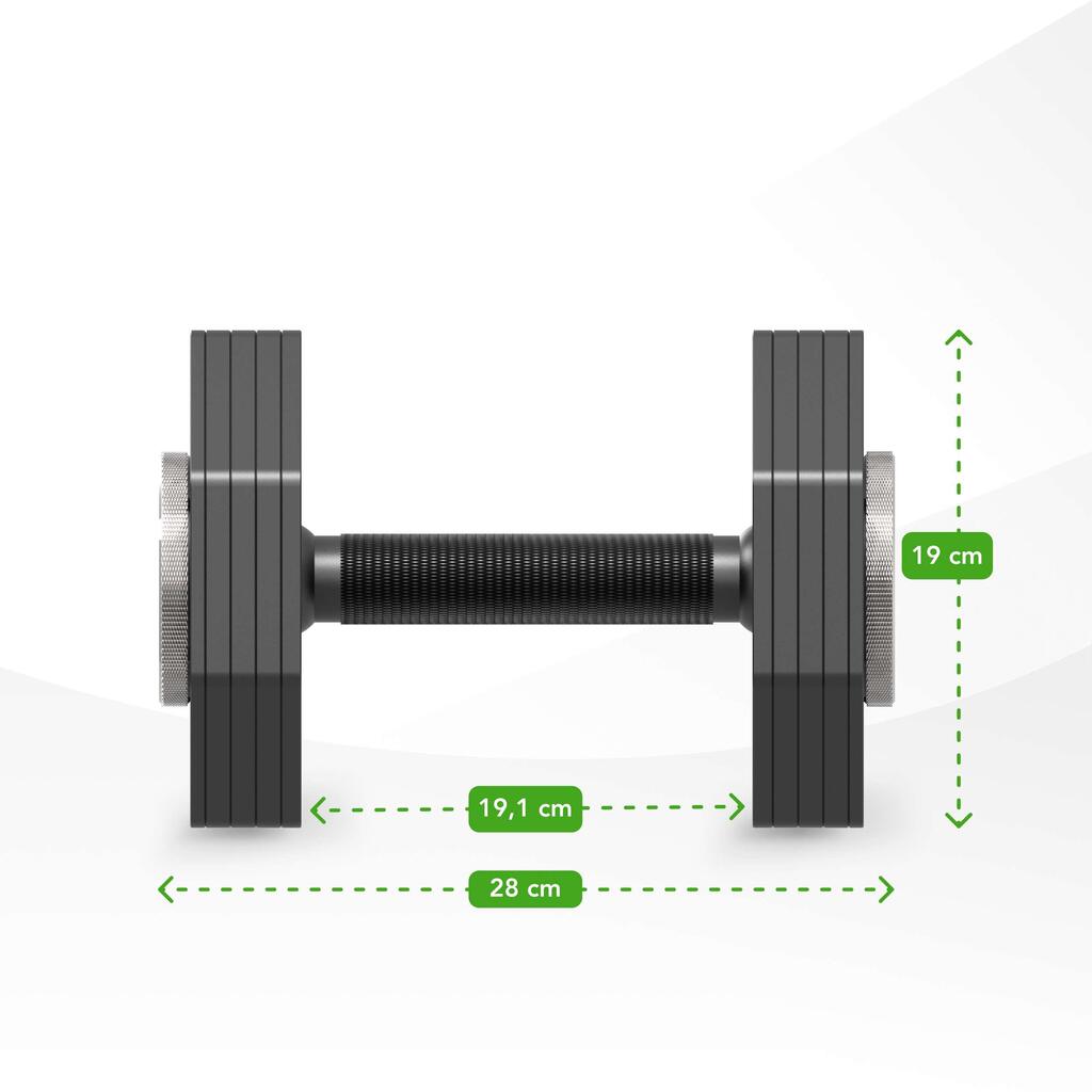 Pure iron – no plastic or concrete. As a result, this dumbbell is narrower and more robust than many other adjustable models. The robust materials ensure you can work out safely and stably for long periods. The knurled handle offers extra grip and feels solid during heavy lifts. The dumbbell withstands intense use: you can drop it on the floor without worry after tough sets.