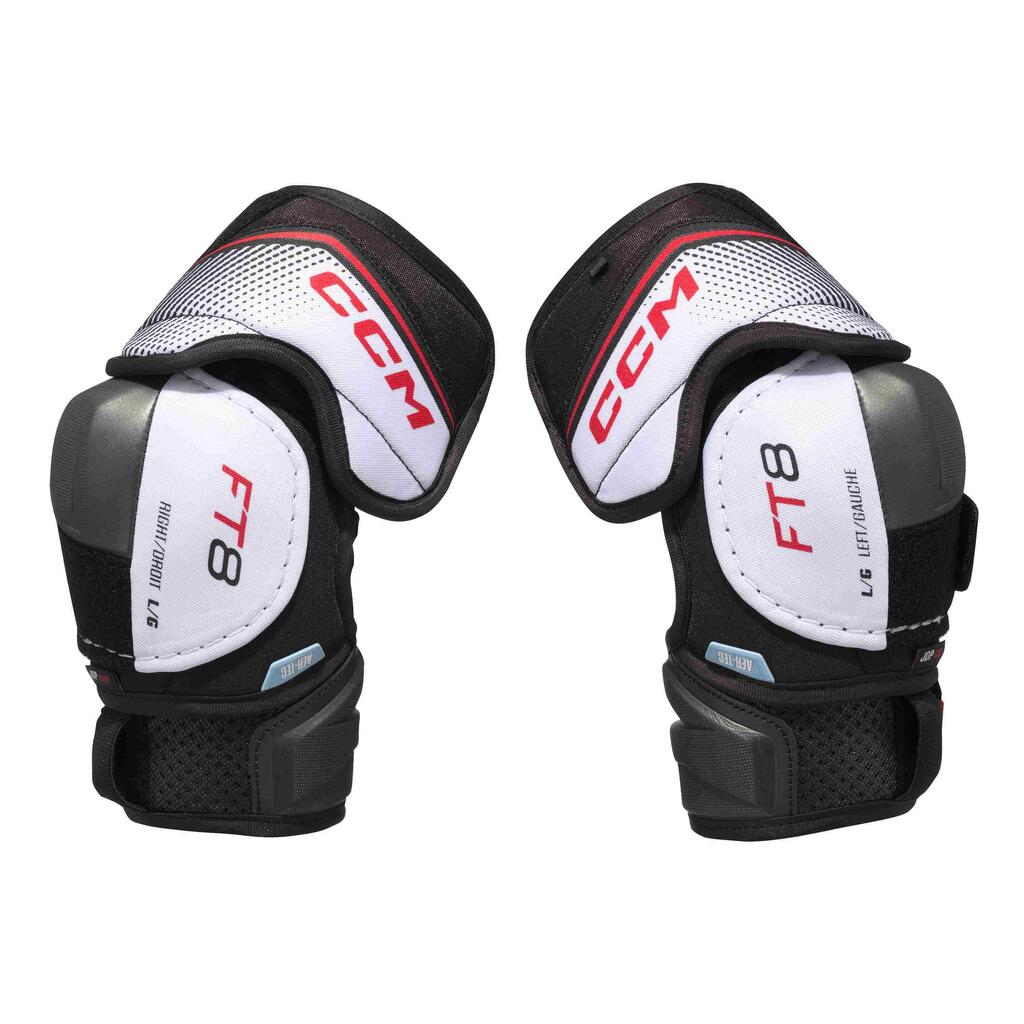 The CCM JETSPEED FT8 elbow pads deliver high-level protection, breathability, and full mobility. Key features include: 3-Piece Flexmotion Design: Follows the elbow’s pure movement. AER-TEC Thermoregulation System: Ensures breathability and cooling. Molded PE JDP Cap with Exposed EVA Foam Cover: Disperses impact energy. Reinforced High-Density Foam Forearm Guard: Provides lightweight, elite protection.
