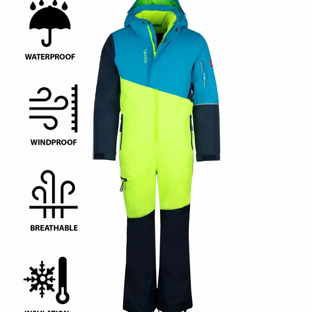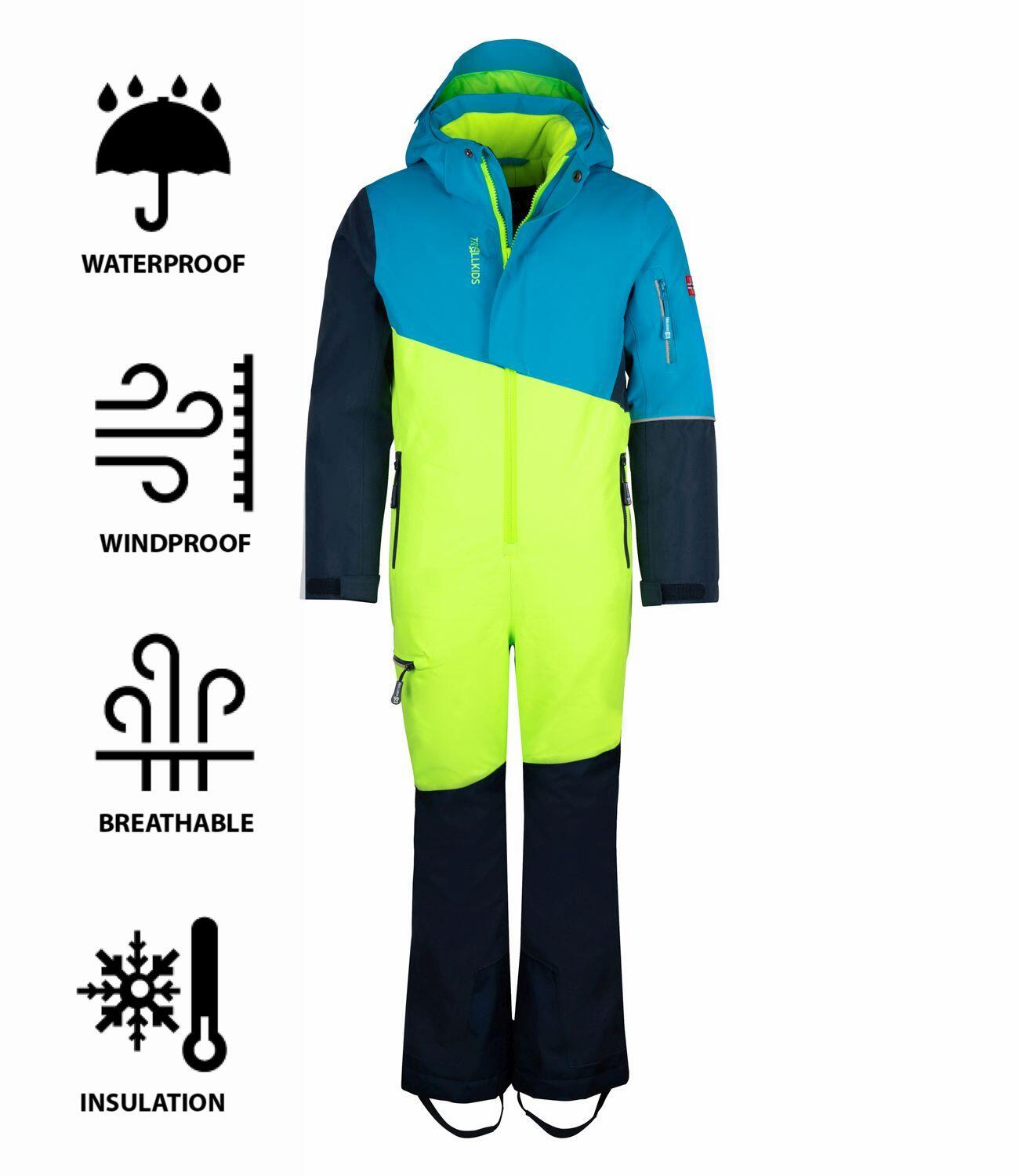 Hallingdal kids' snow suit, waterproof and breathable (5,000 mm / 5,000 g), fleece lining, detachable hood, adjustable cuffs and ankles with zip pockets and reflective details