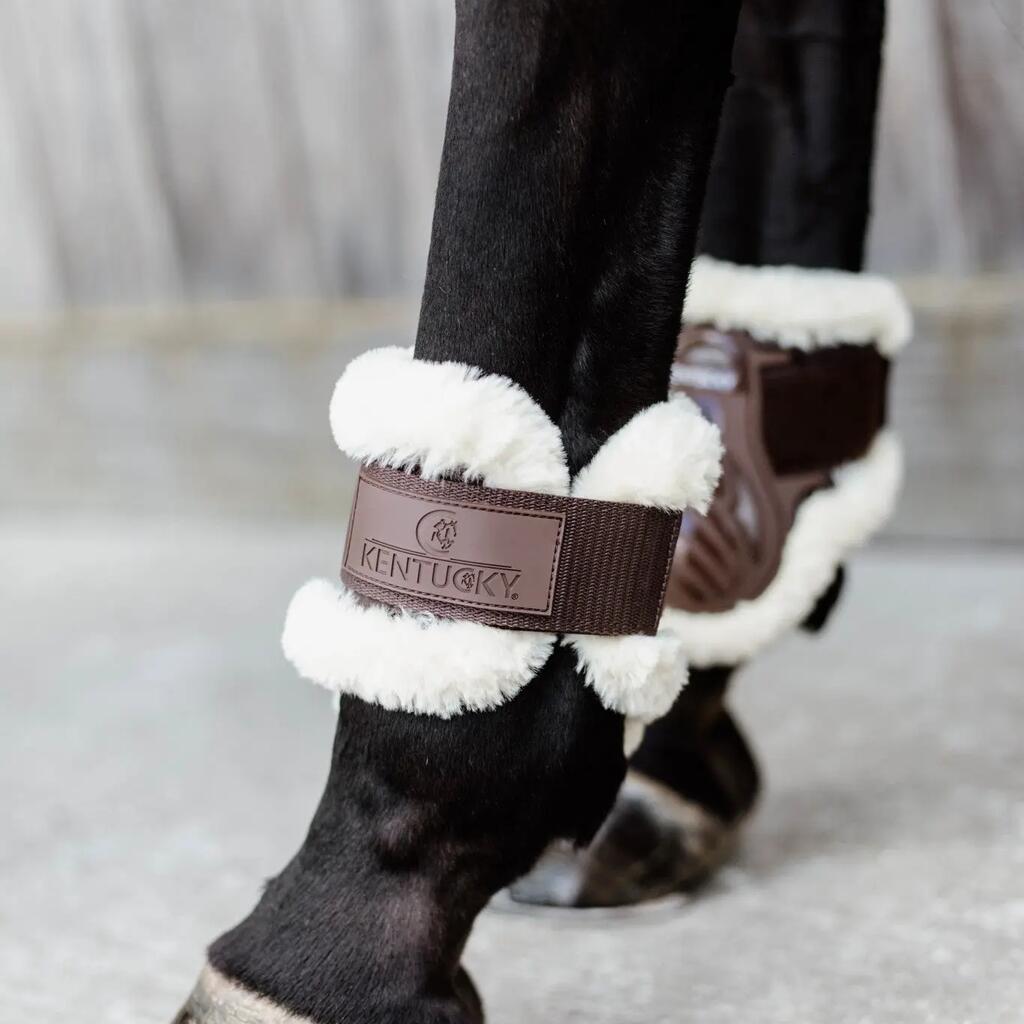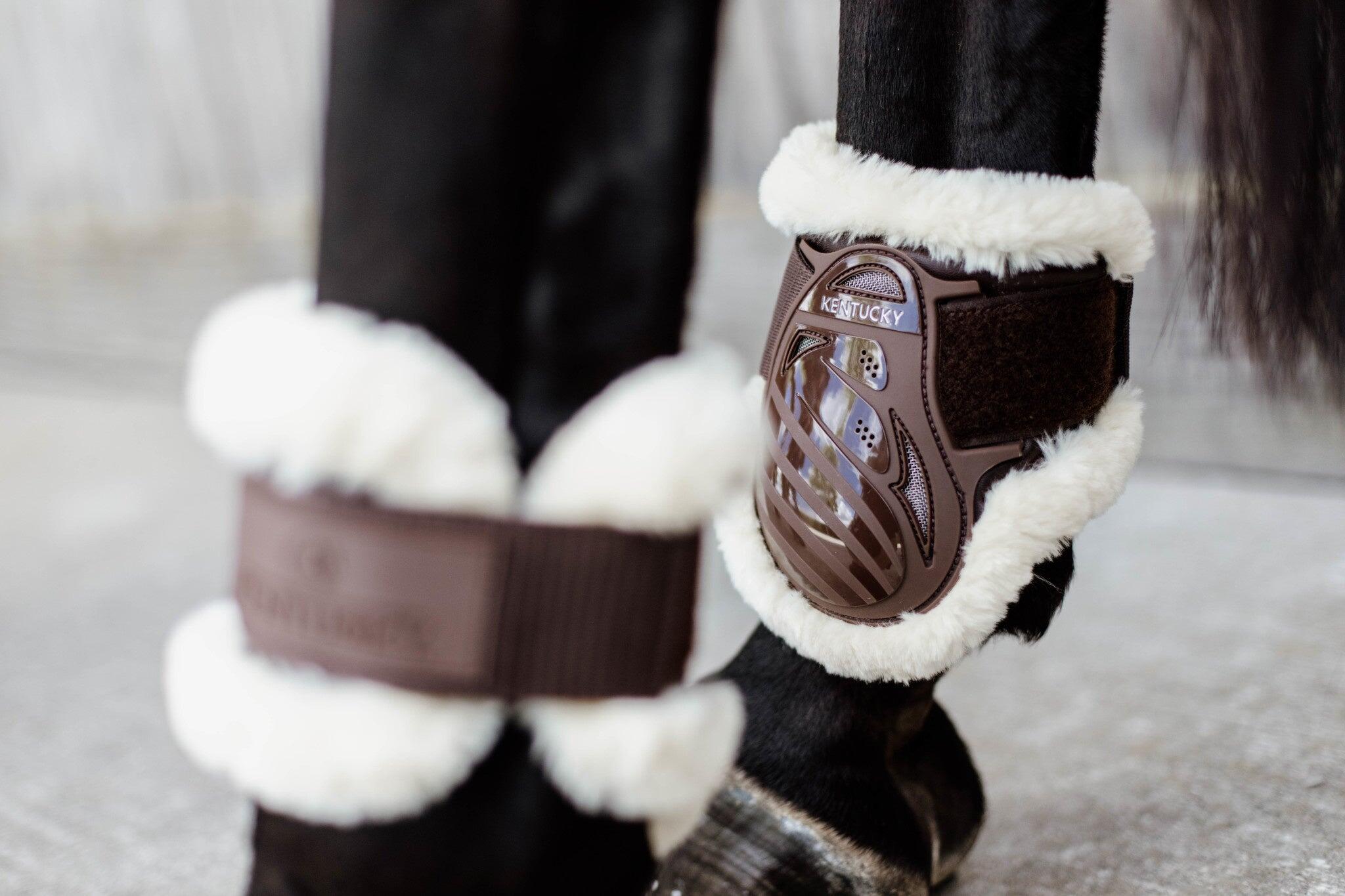 The young horse fetlock guards with sheepskin are made from a solid TPU shell with multiple ventilation holes and a large ventilation triangle.