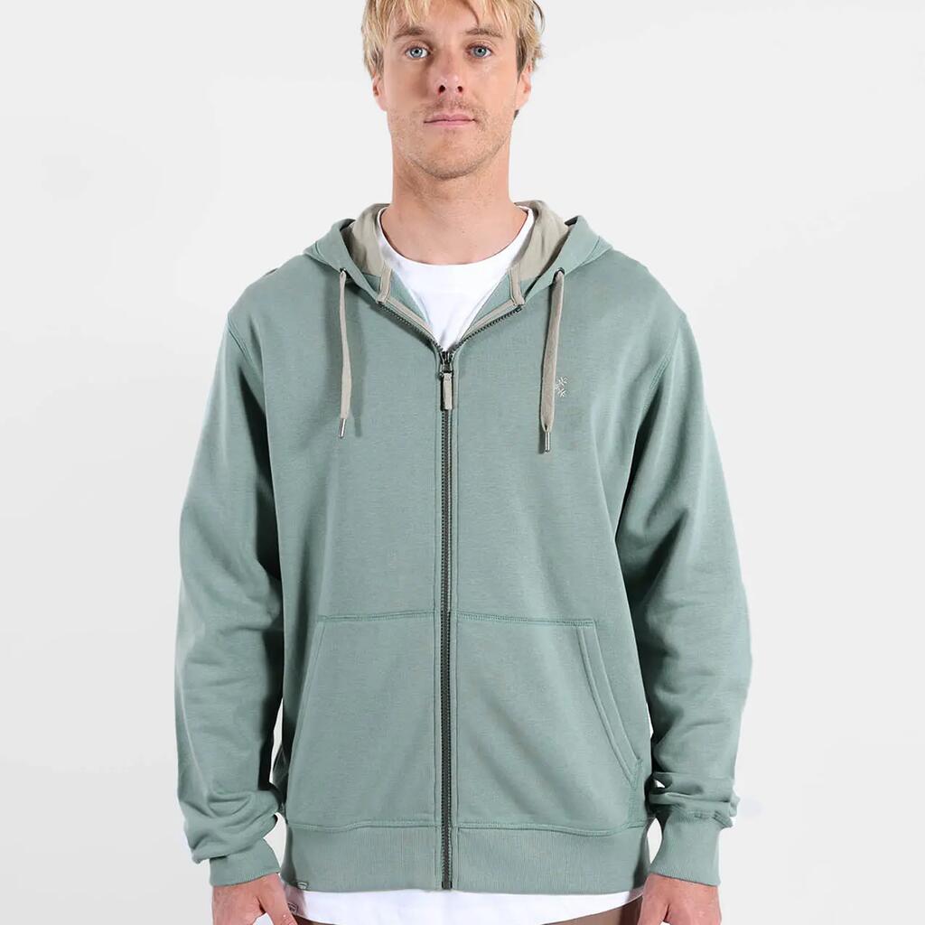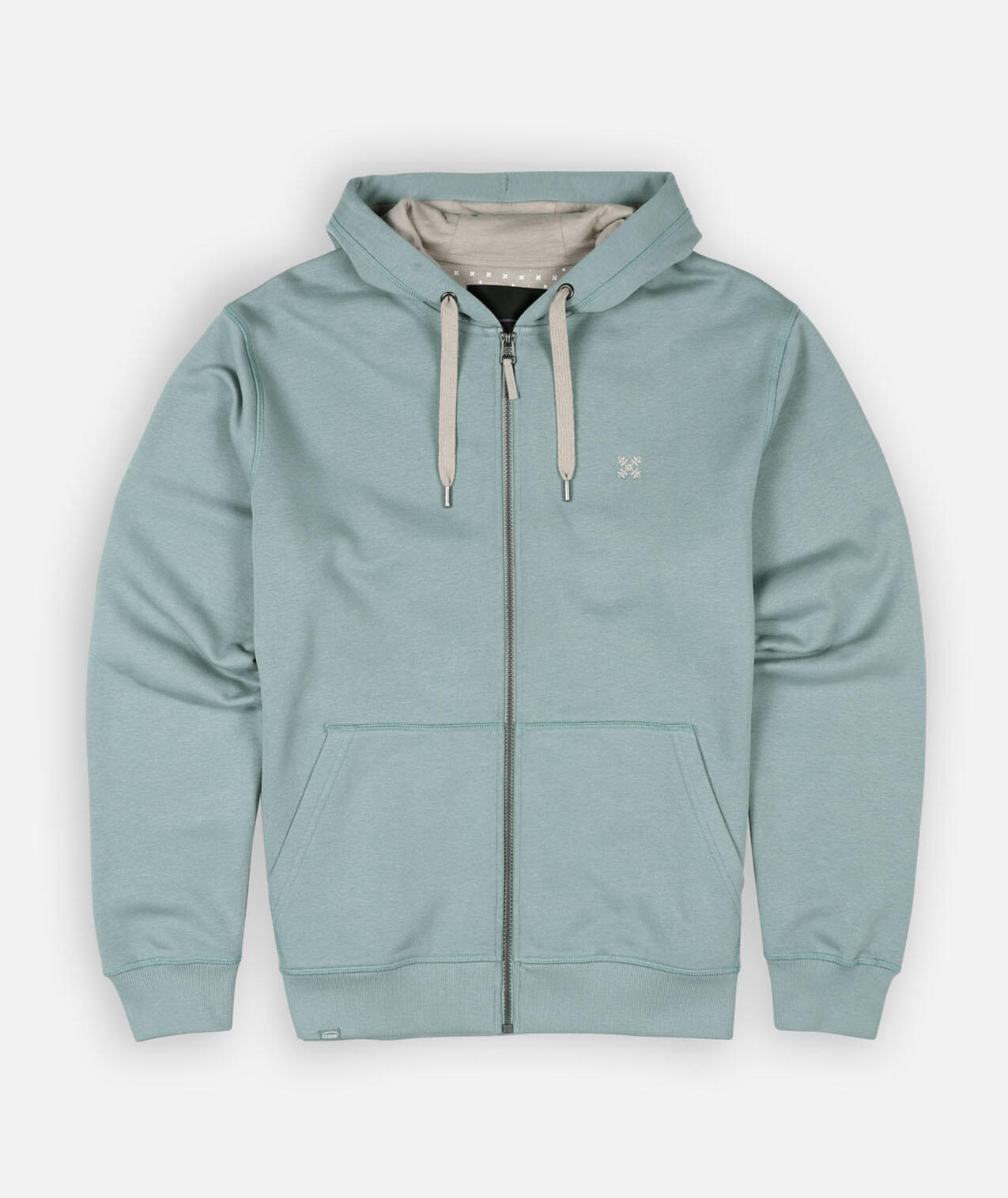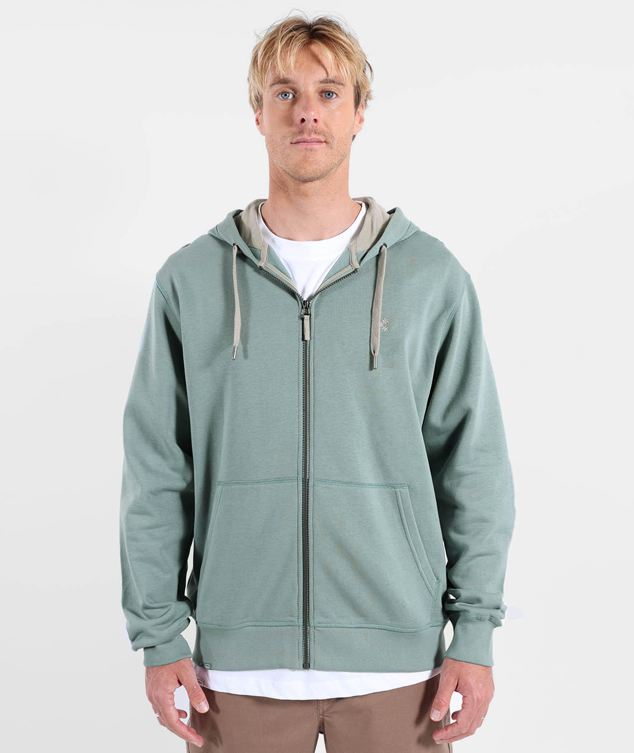 Fully zipped hooded sweatshirt, ribbed edges, contrast drawstring at hood, printed half-moon, contrast inner hood lining, kangaroo pocket, brushed fleece