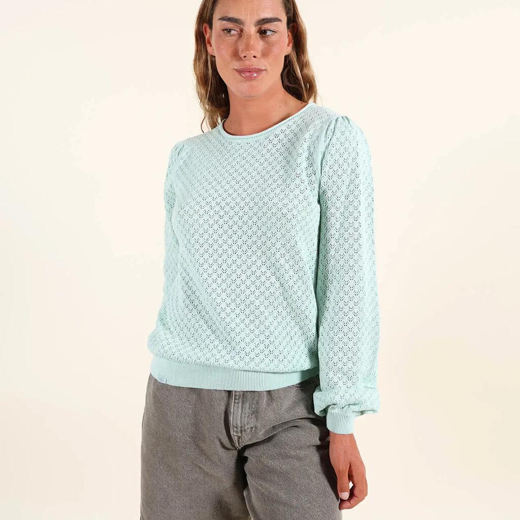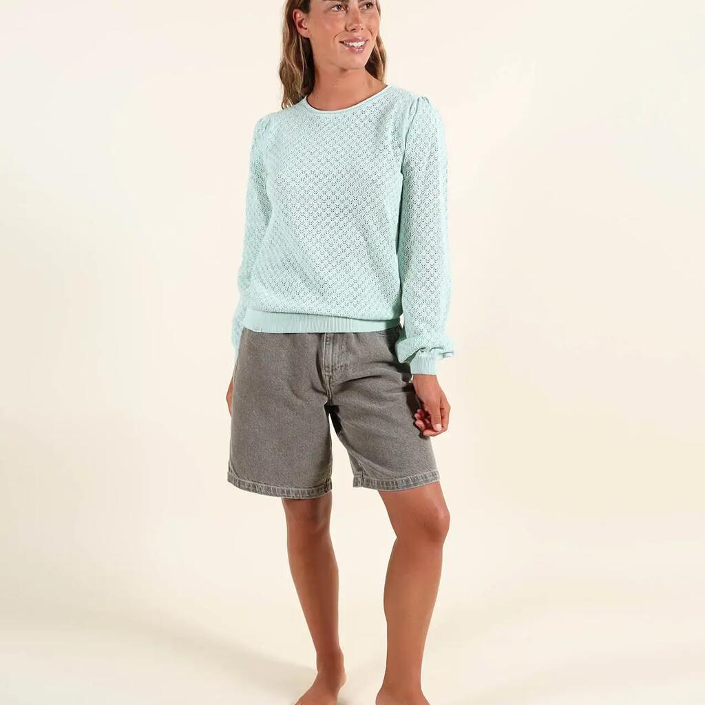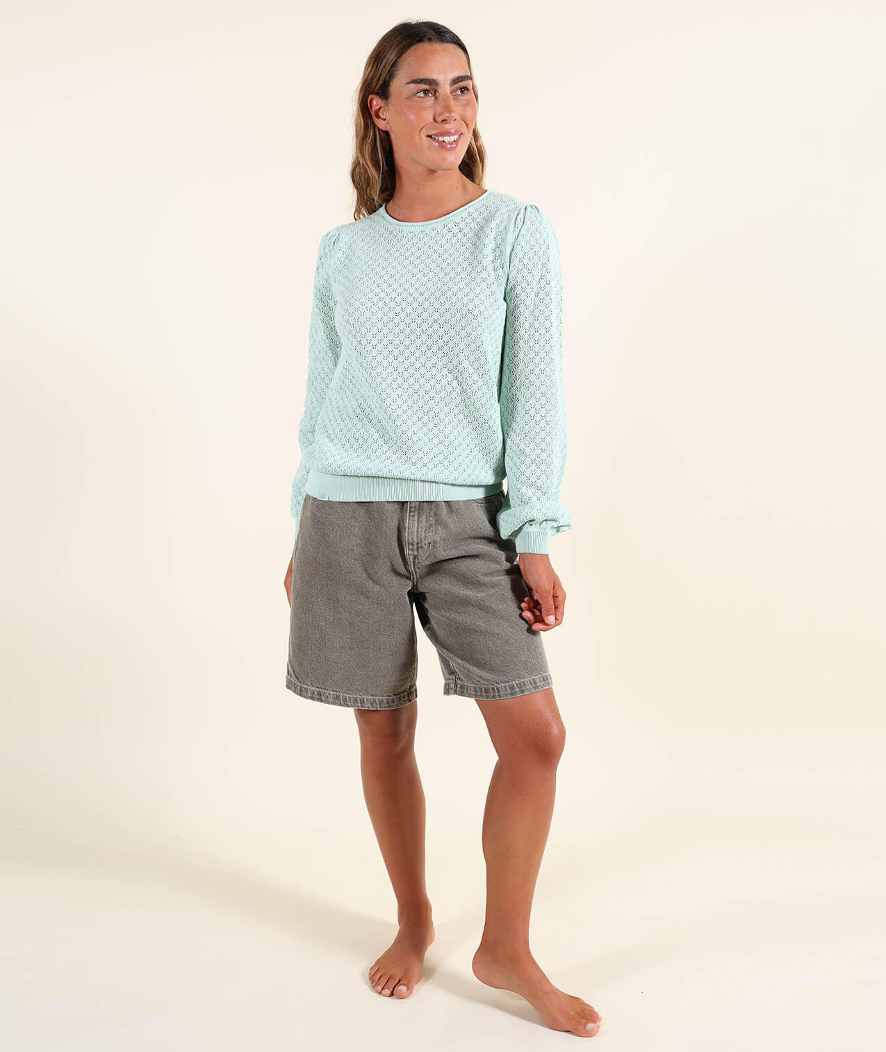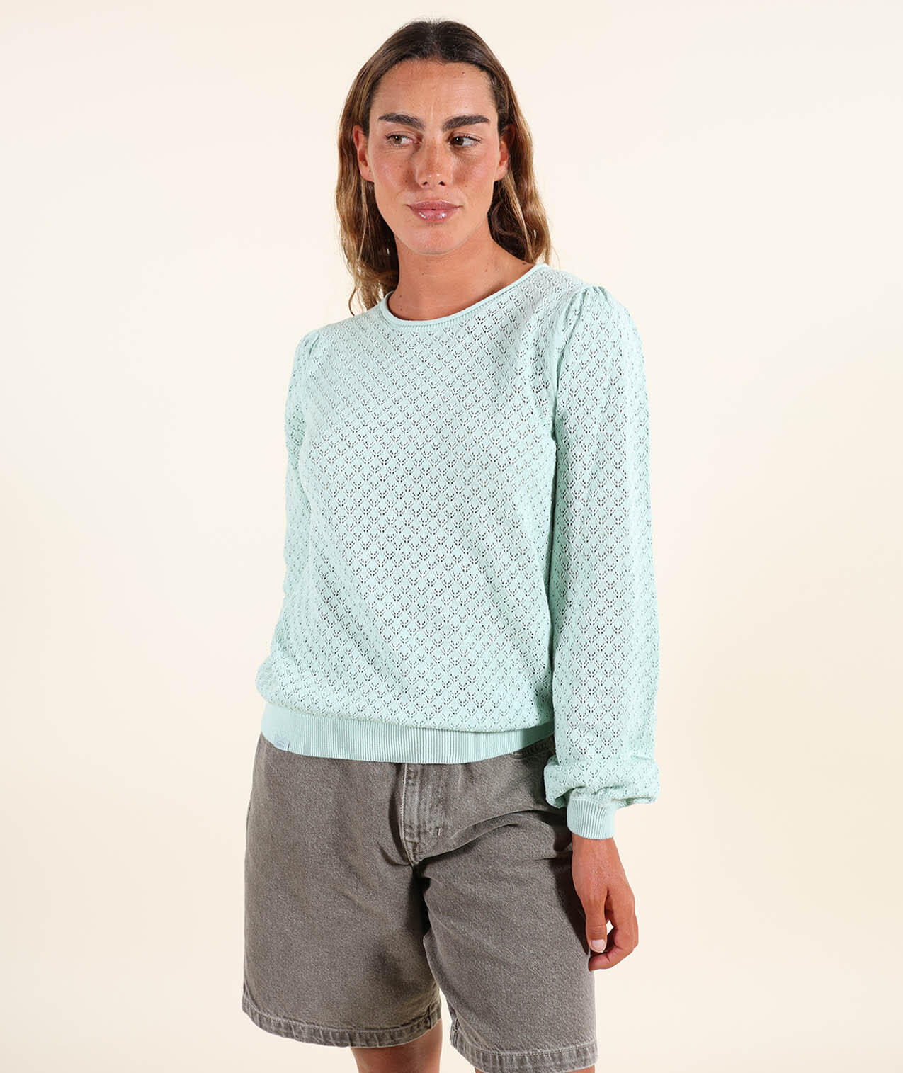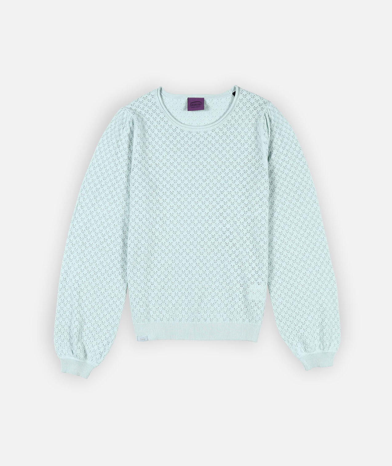 Lightweight gauge 12 sweater with round neck and fancy open stitch, embroidered patch on chest and Oxbow label on shoulder.