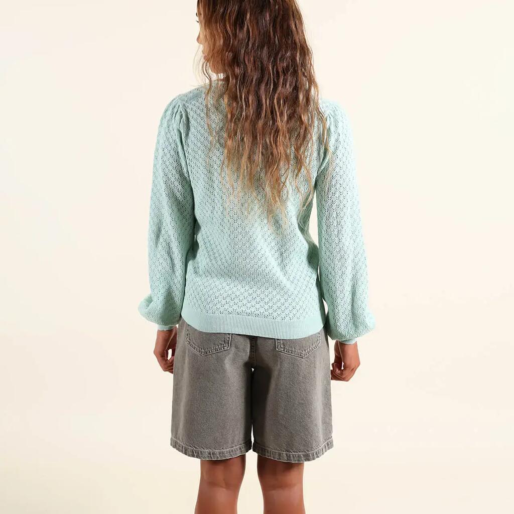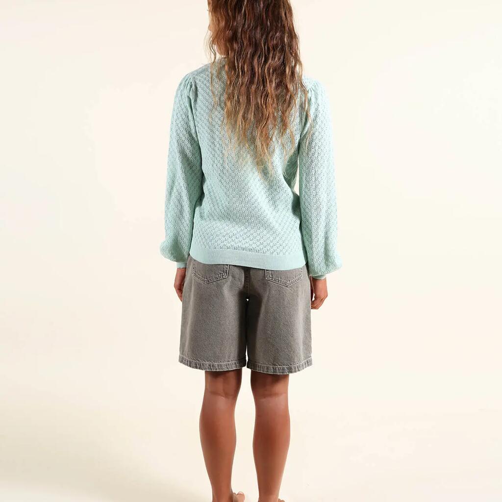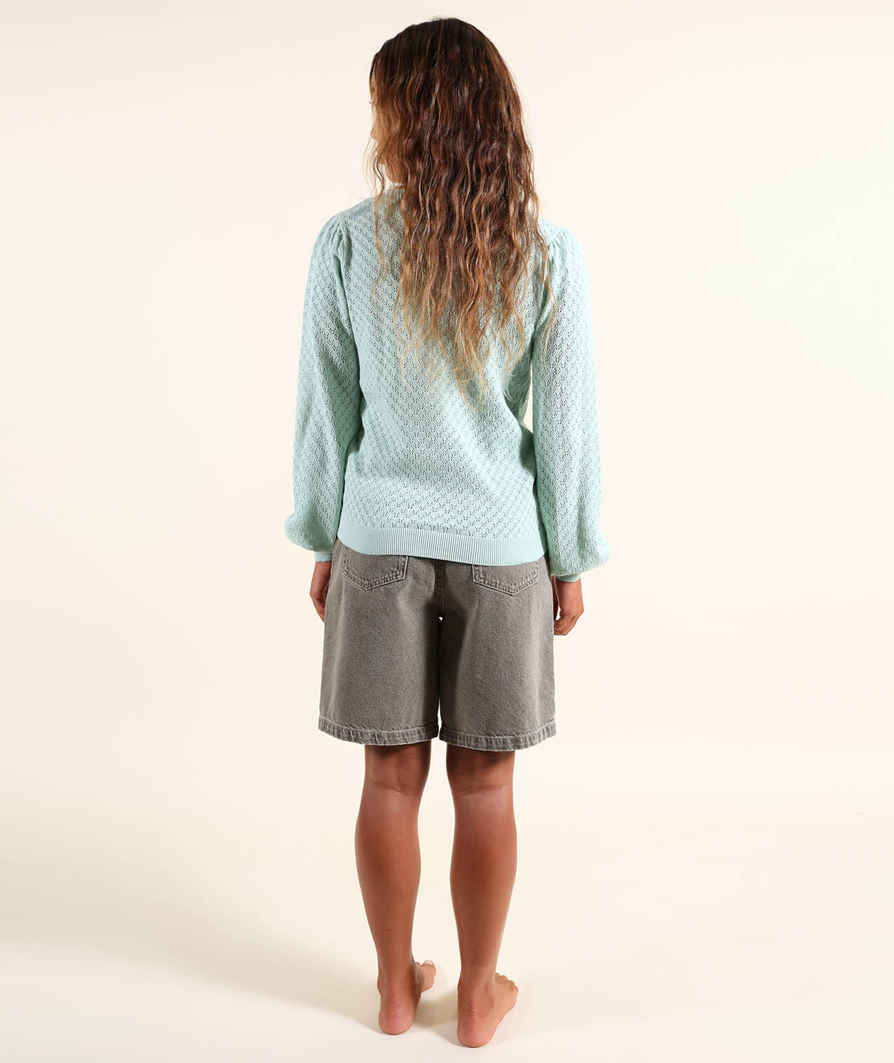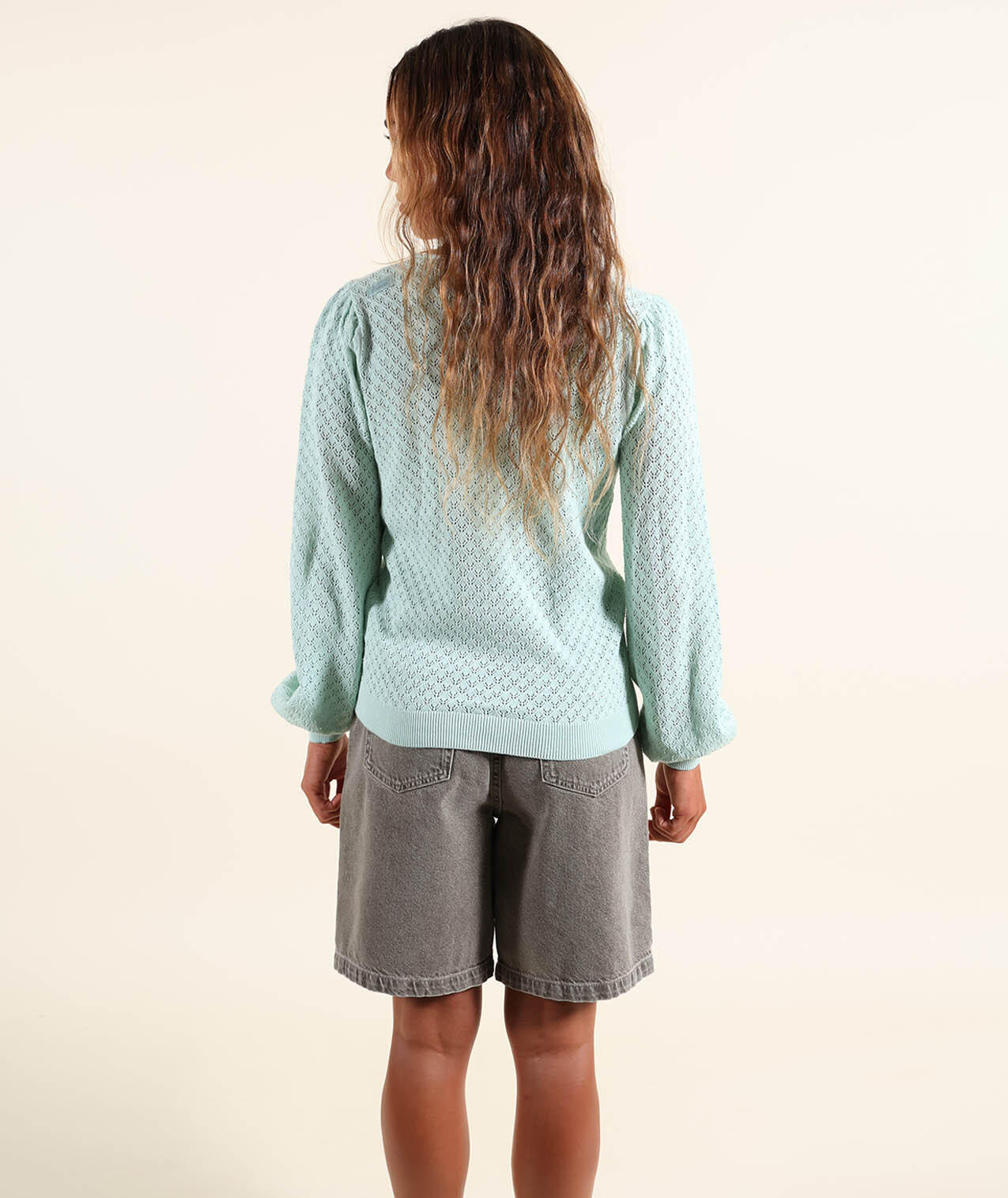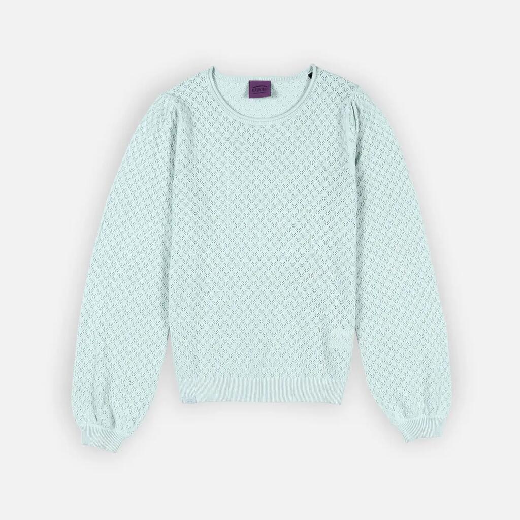 Lightweight gauge 12 sweater with round neck and fancy open stitch, embroidered patch on chest and Oxbow label on shoulder.