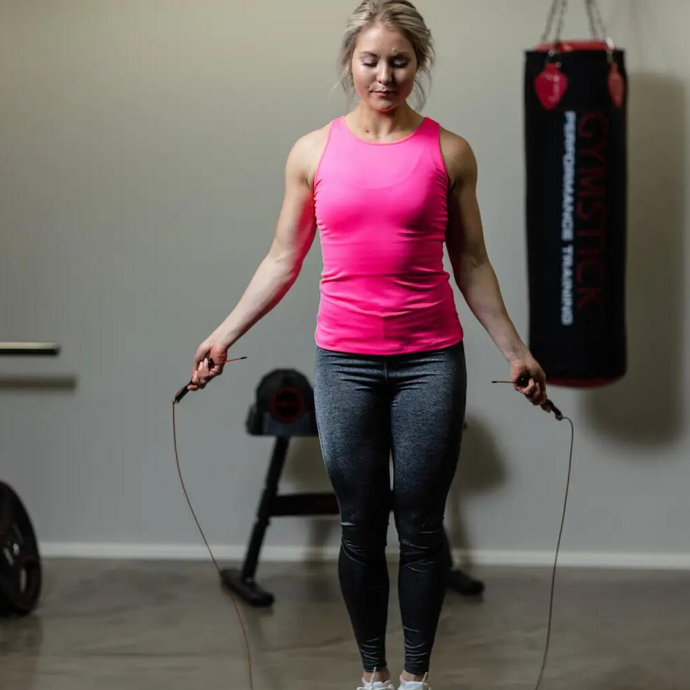 This durable jump rope has a perfectly weighted steel cable as rope and non-slip ergonomic handles.