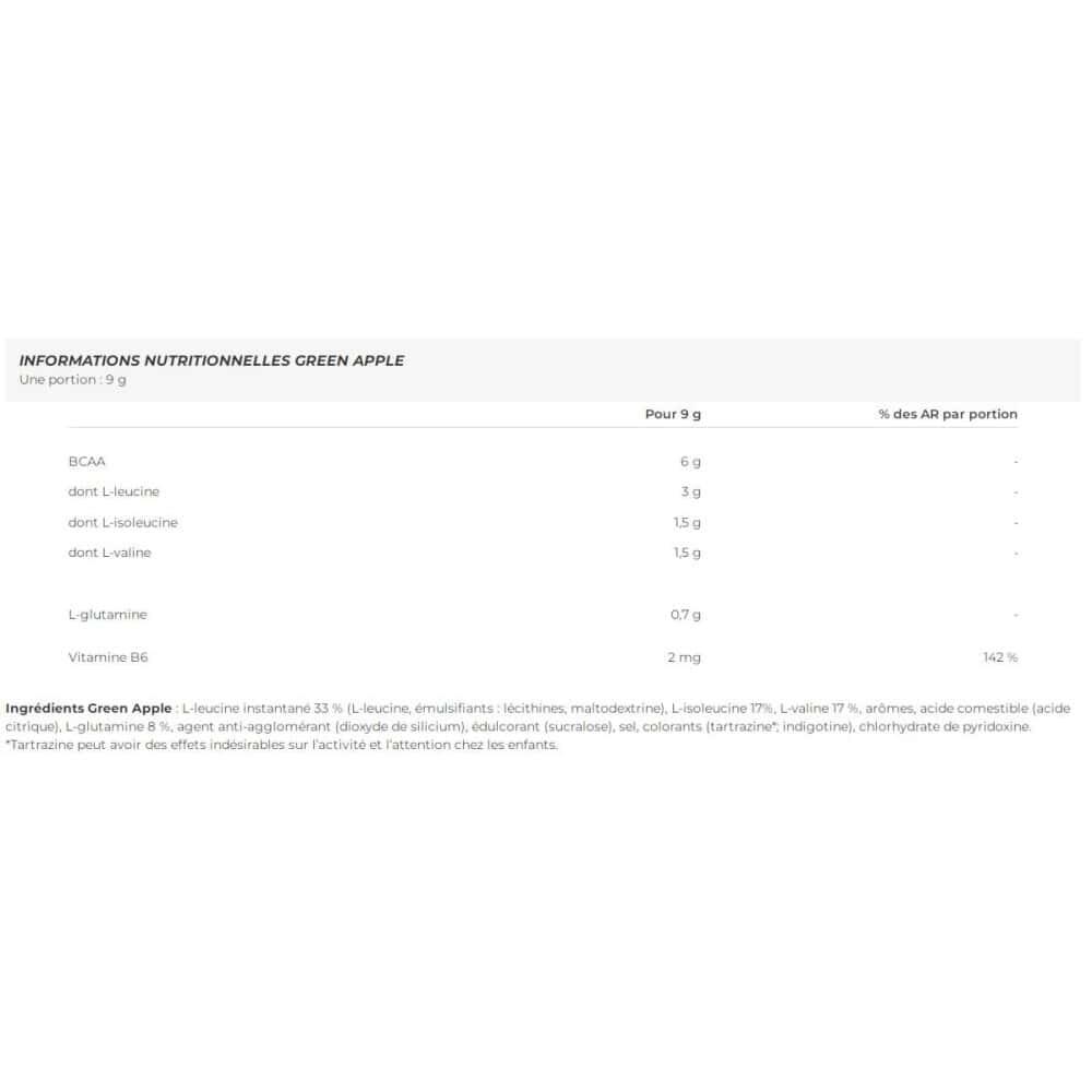 Green Apple ingredients: L-leucine instant 33% (L-leucine, emulsifiers: lecithin, maltodextrin), L-isoleucine 17%, L-valine 17%, flavourings, edible acid (citric acid), L-glutamine 8%, anti-caking agent (silicon dioxide), sweetener (sucralose), salt, colourings (tartrazine*, indigotine), pyridoxine hydrochloride. *Tartrazine may have adverse effects on activity and attention in children.Orangeingredients: L-leucine instant 33% (L-leucine, emulsifiers: lecithin, maltodextrin), L-isoleucine 17%, L-valine 17%, flavourings, edible acid (citric acid), L-glutamine 8%, anti-caking agent (silicon dioxide), sweetener (sucralose), salt, colourings (tartrazine Allura Red AC)*, pyridoxine hydrochloride. *Tartrazine and Rouge allura AC may have adverse effects on activity and attention in children.Ingredients PineappleMango: L-leucine instant 33% (L-leucine, emulsifiers: lecithin, maltodextrin), L-isoleucine 17%, L-valine 17%, flavours, L-glutamine 8%, edible acid (citric acid), anti-caking agent (silicon dioxide), sweetener (sucralose), salt, pyridoxine hydrochloride, colourings (tartrazine, allura red AC).Ingredients Ice Tea Peach : L-leucine instant 33% (L-leucine, emulsifiers: lecithin, maltodextrin), L-isoleucine 17%, L-valine 17%, flavourings, L-glutamine 8%, edible acid (citric acid), black tea instant (Camellia sinensis leaf extract), anti-caking agent (silicon dioxide), sweetener (sucralose), salt, pyridoxine hydrochloride.