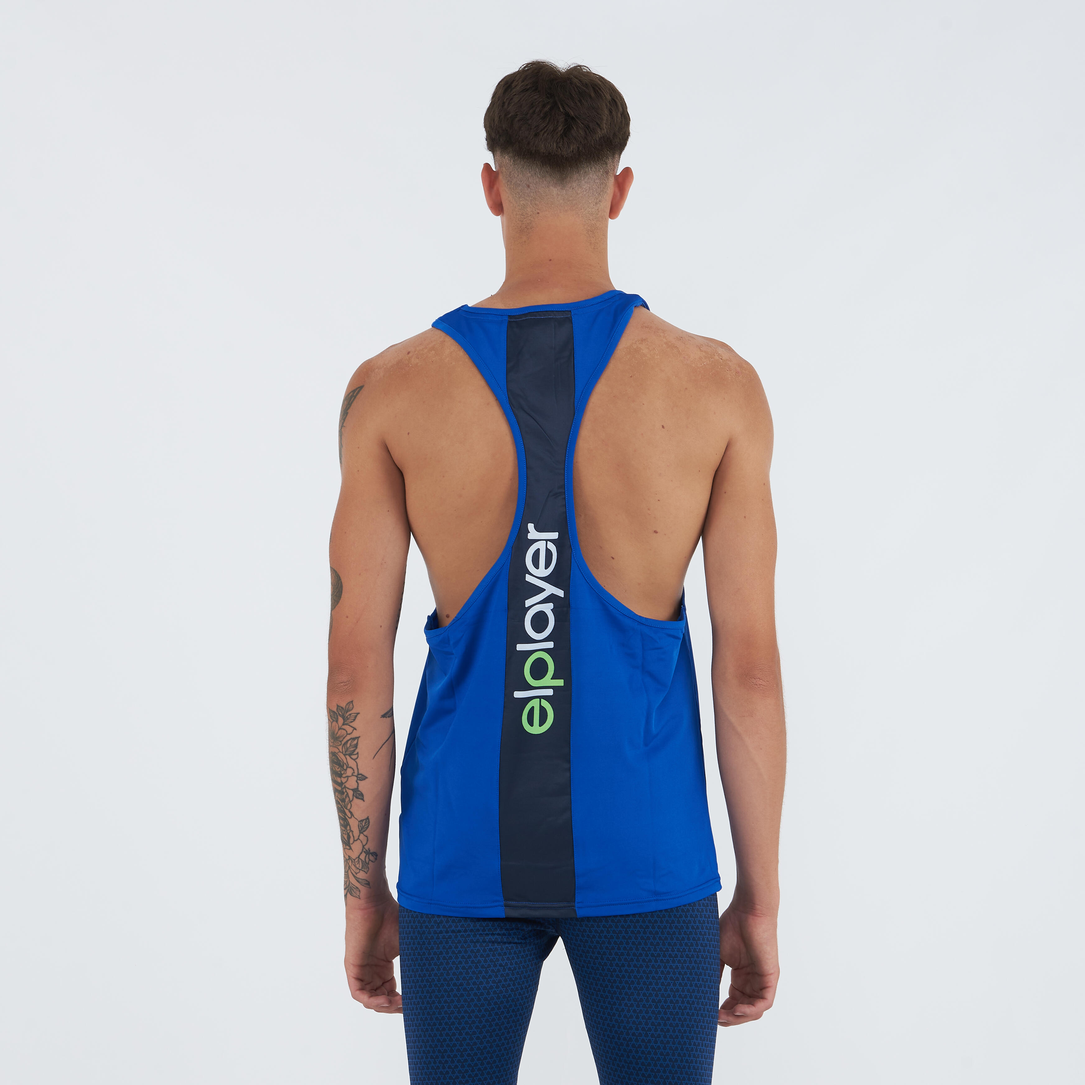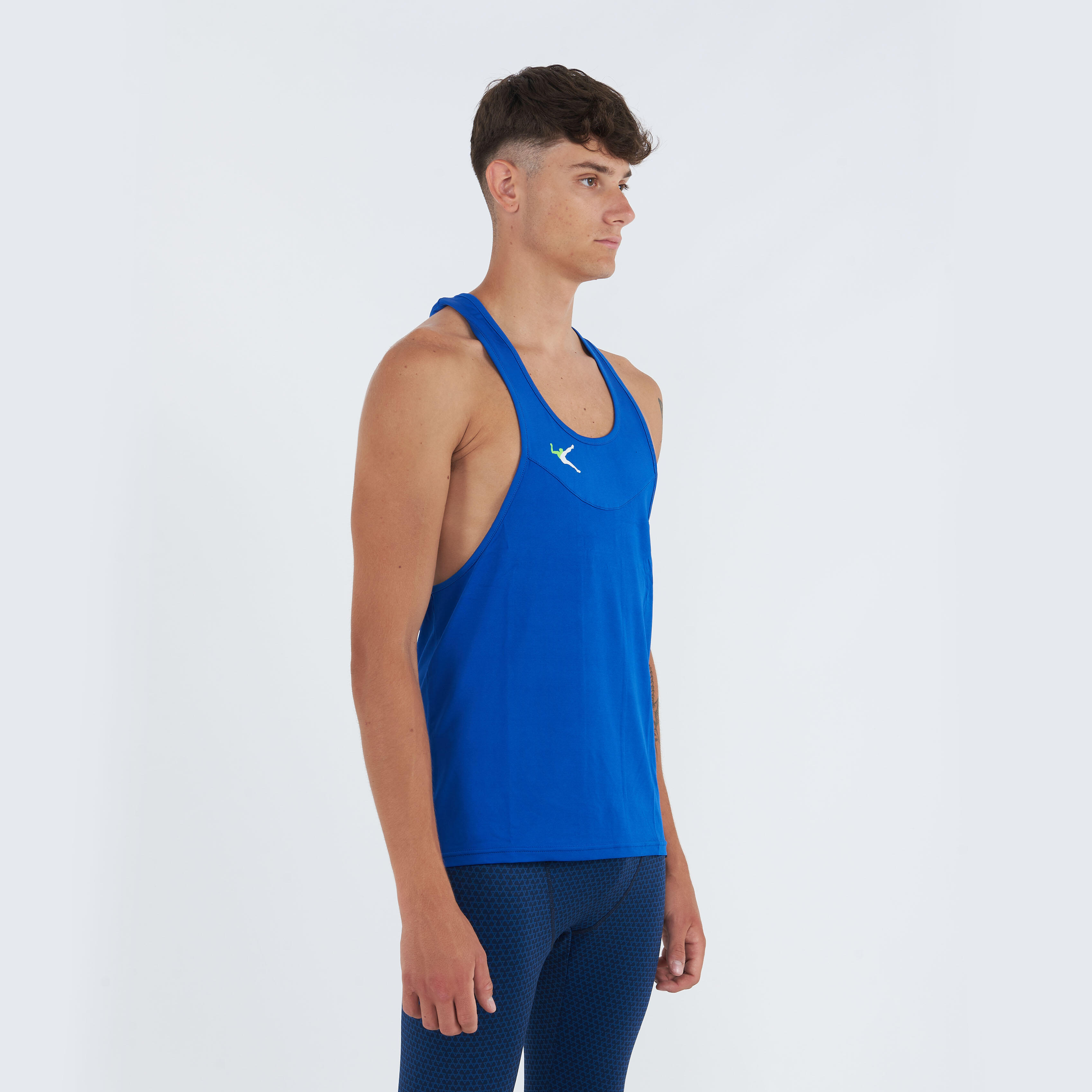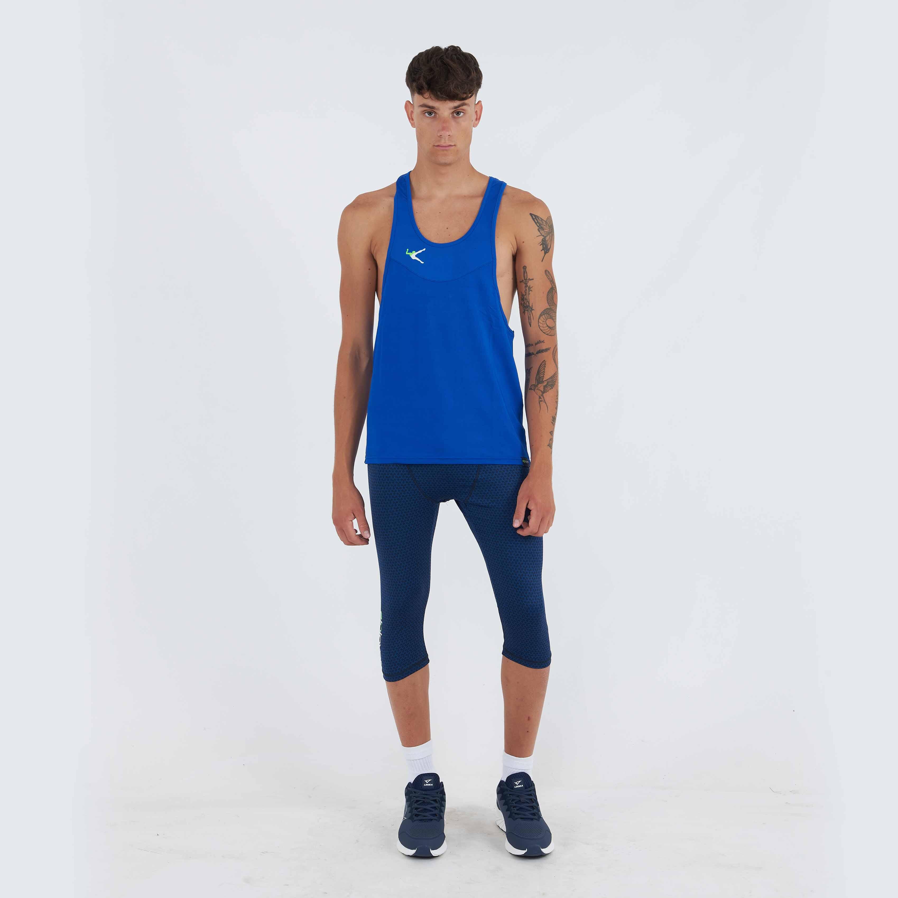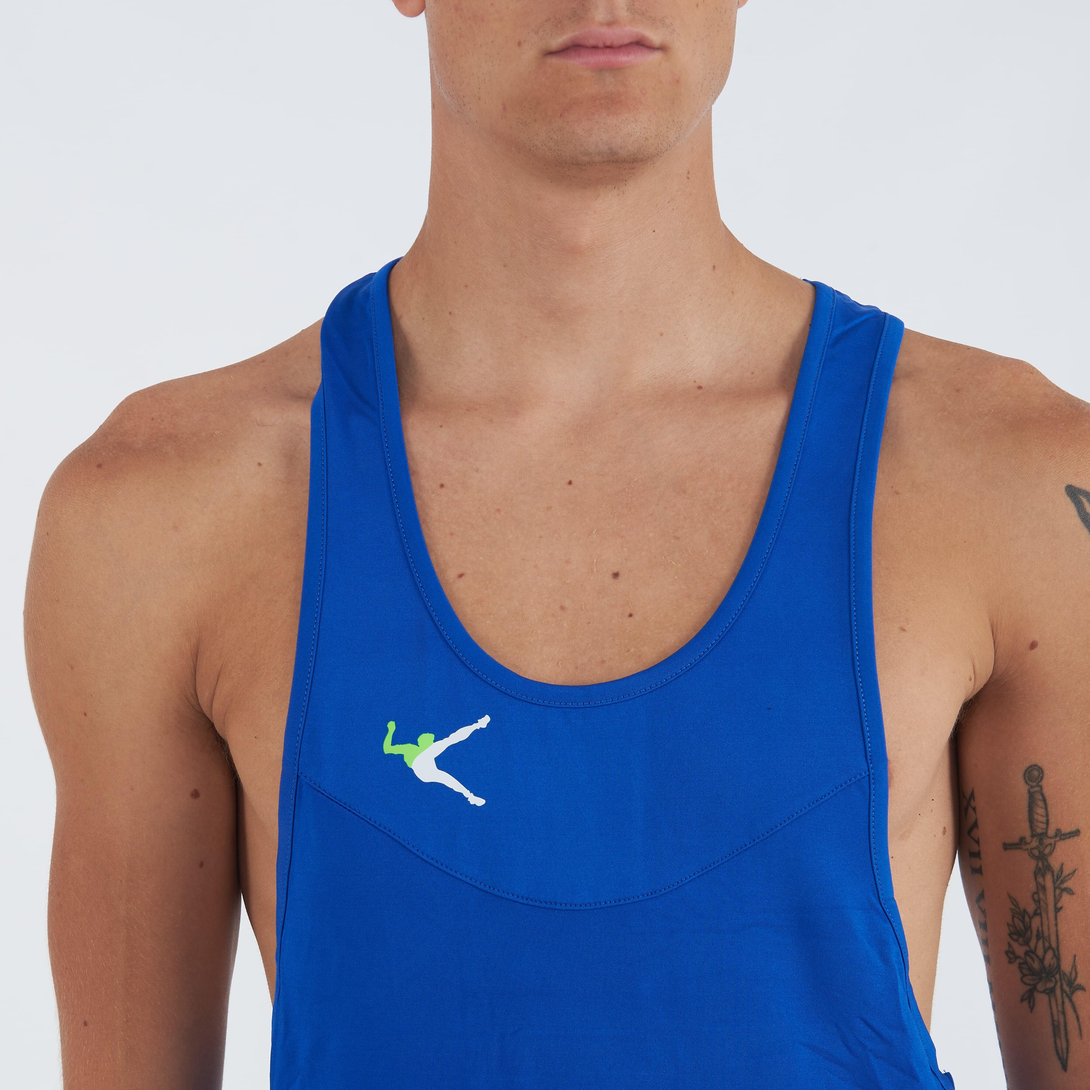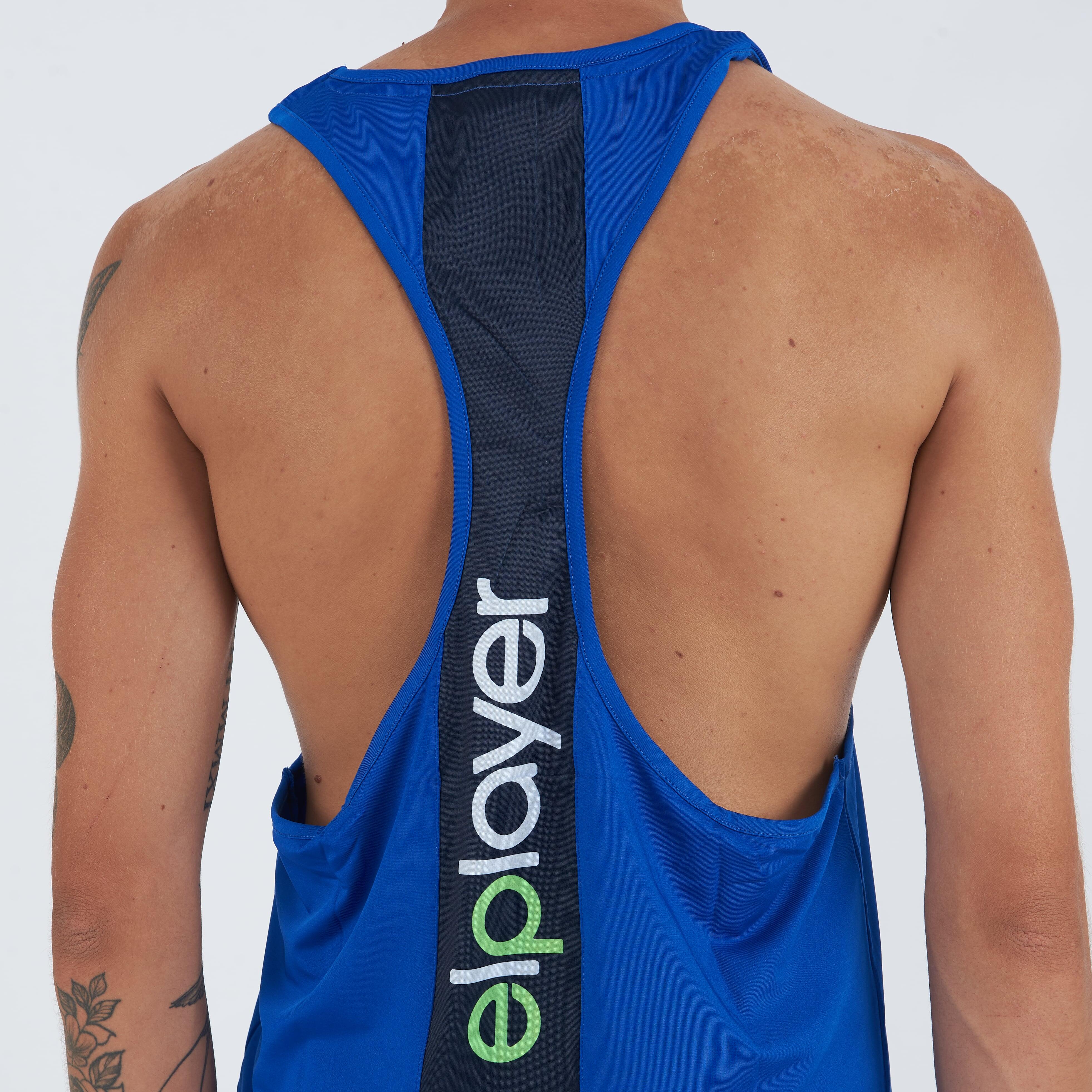 Lightweight breathable polyester training tank top with deep round neck and rower back with central insert.