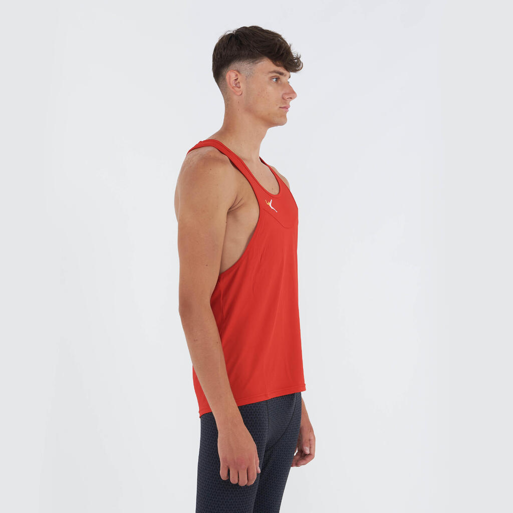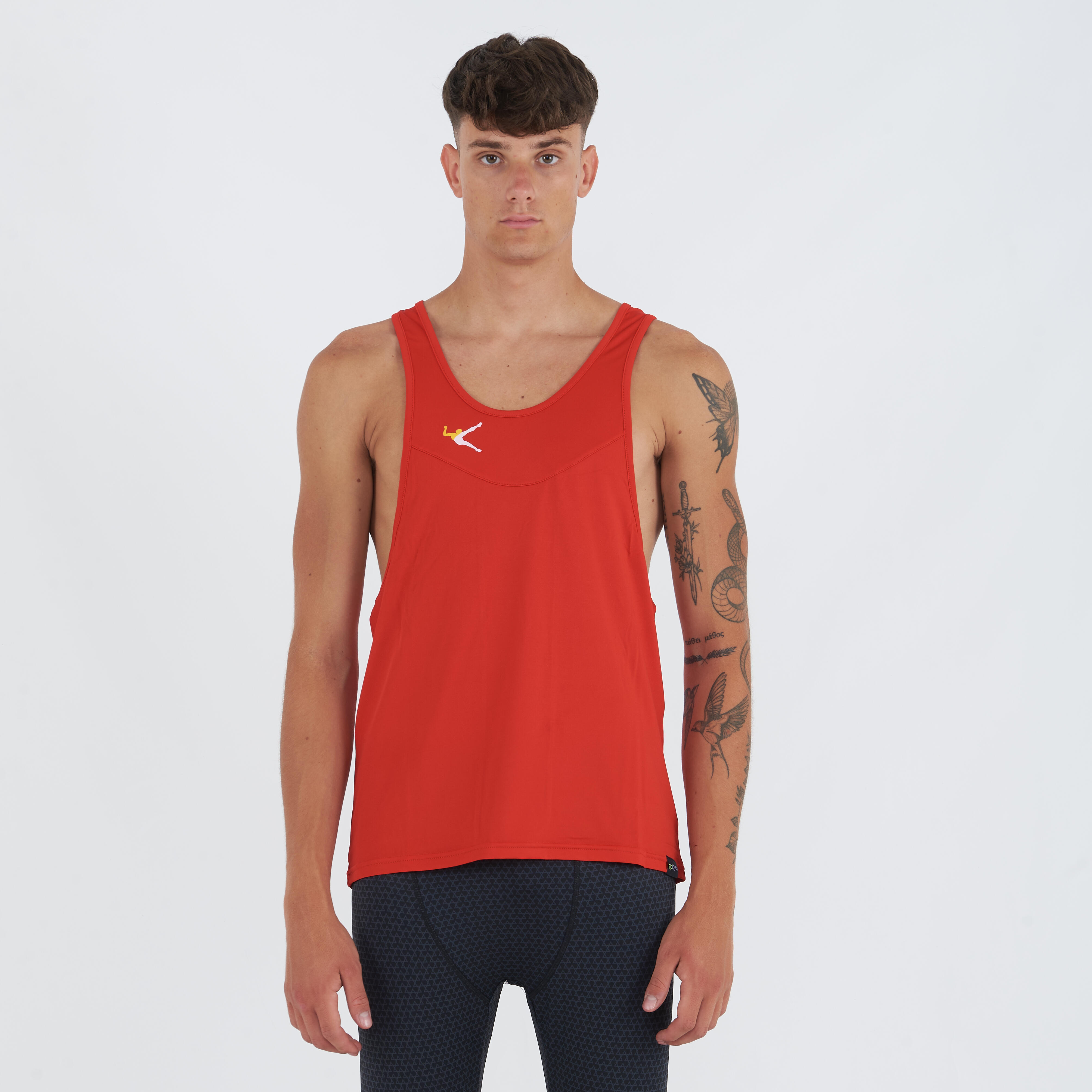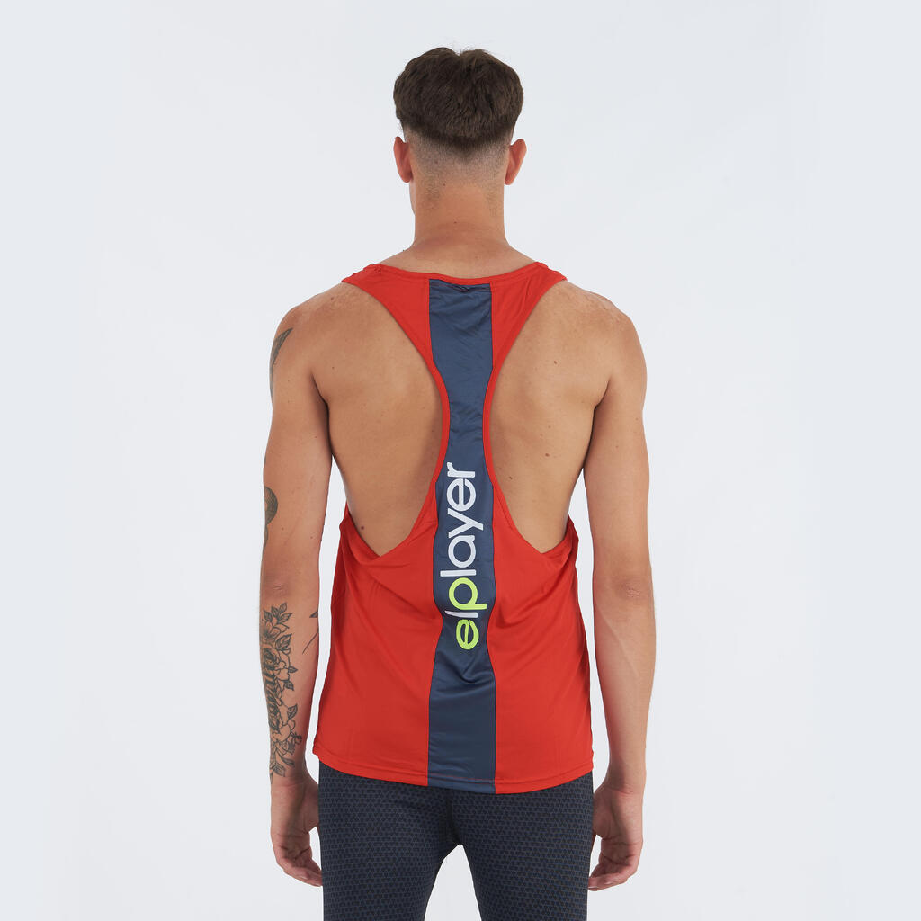 Lightweight breathable polyester training tank top with deep round neck and rower back with central insert.