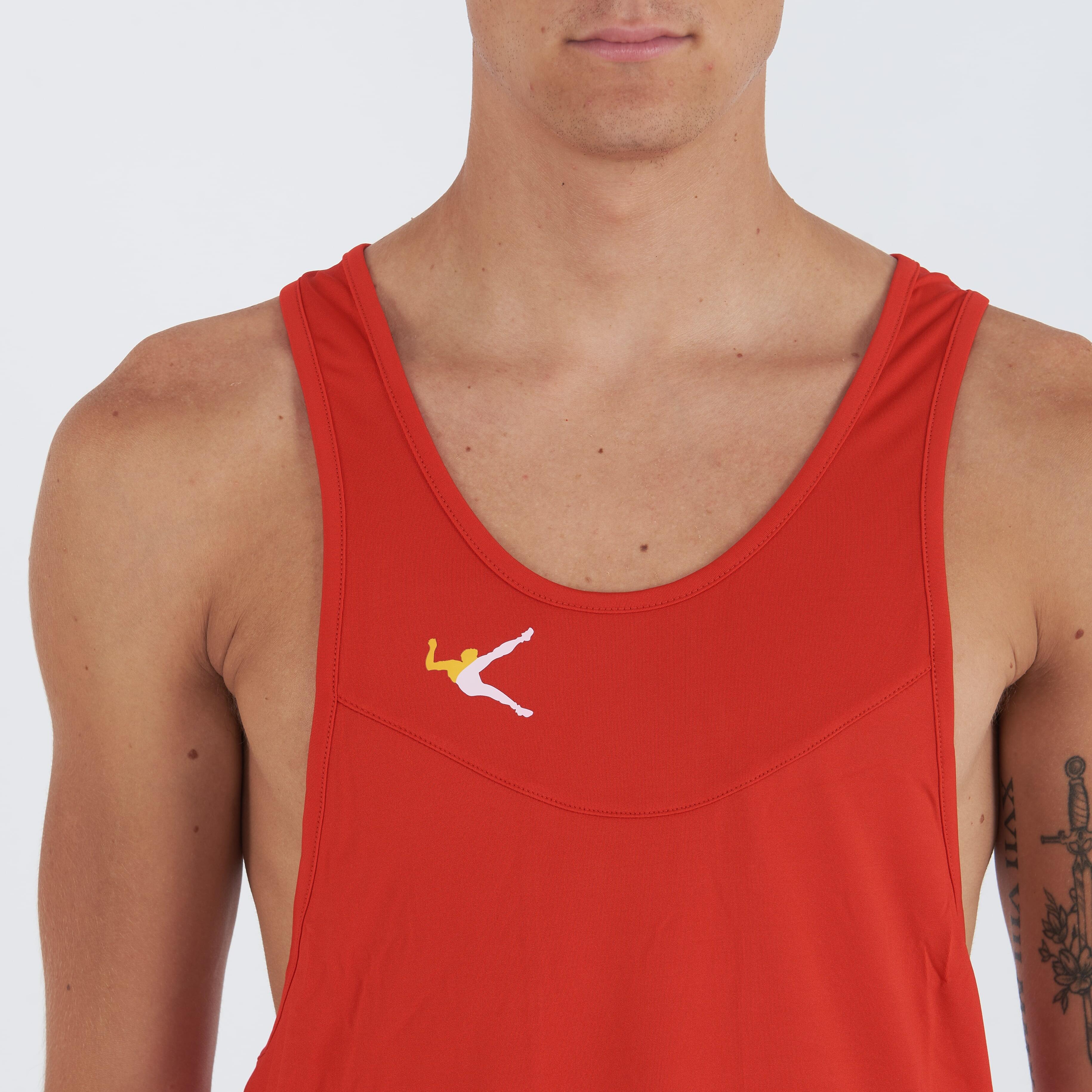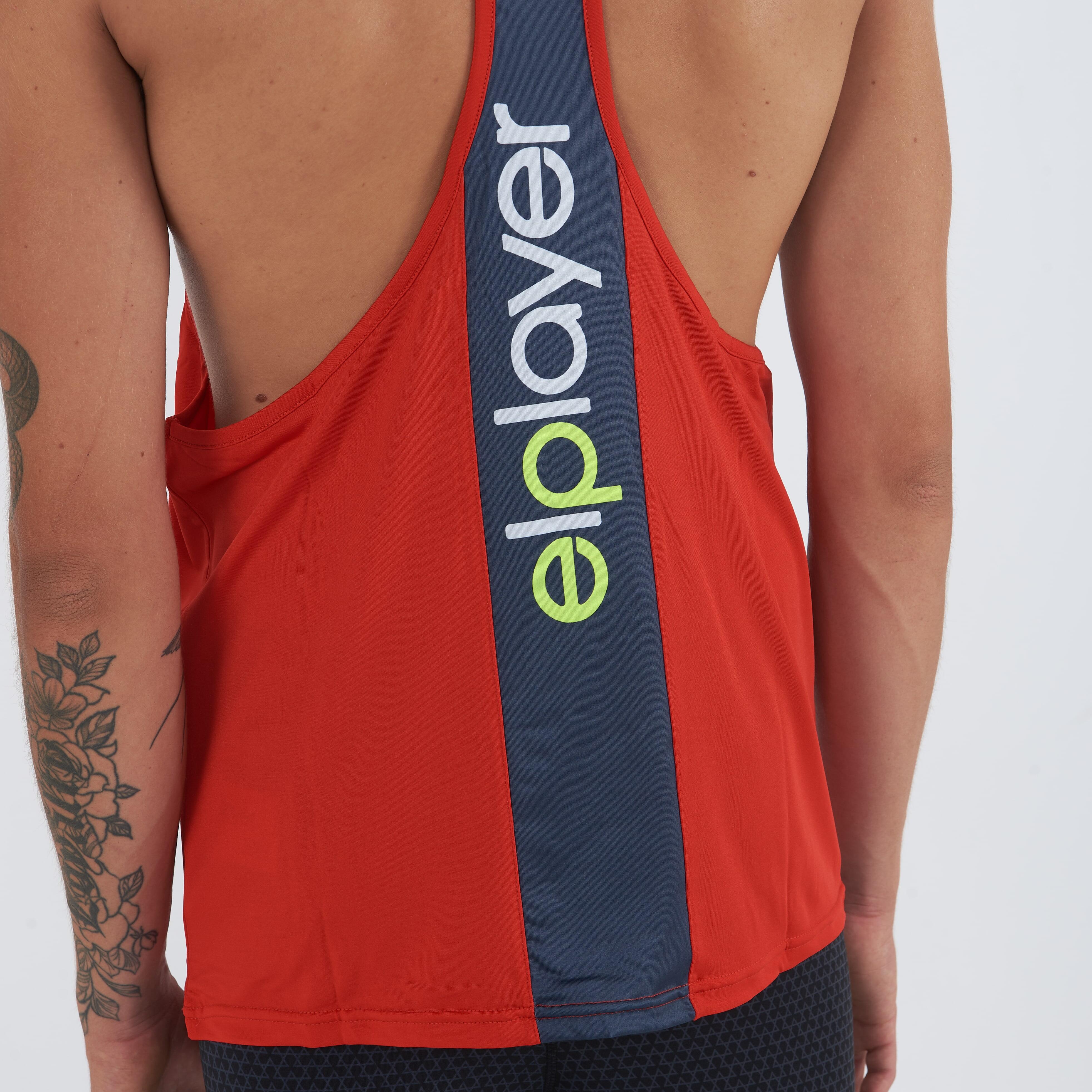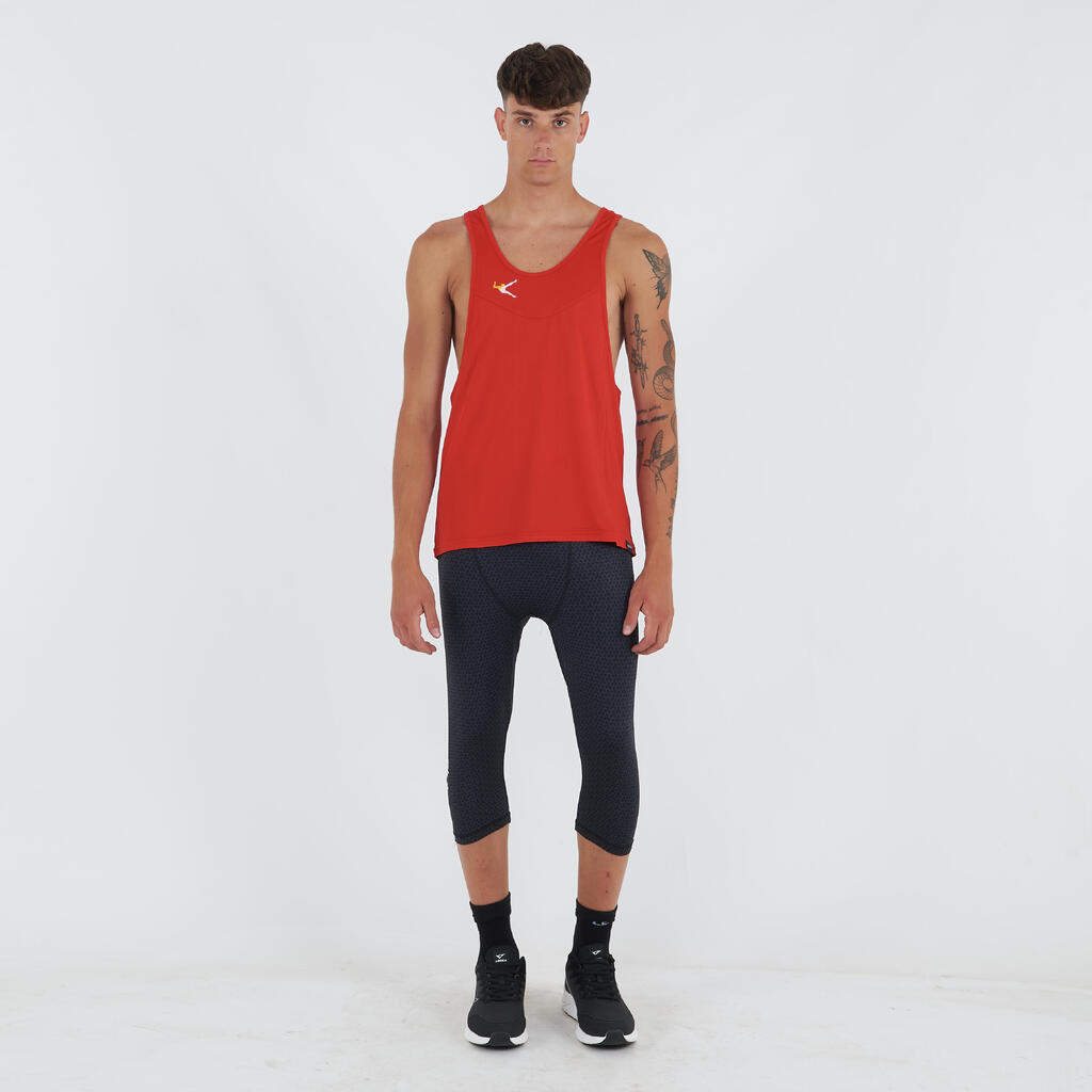 Lightweight breathable polyester training tank top with deep round neck and rower back with central insert.