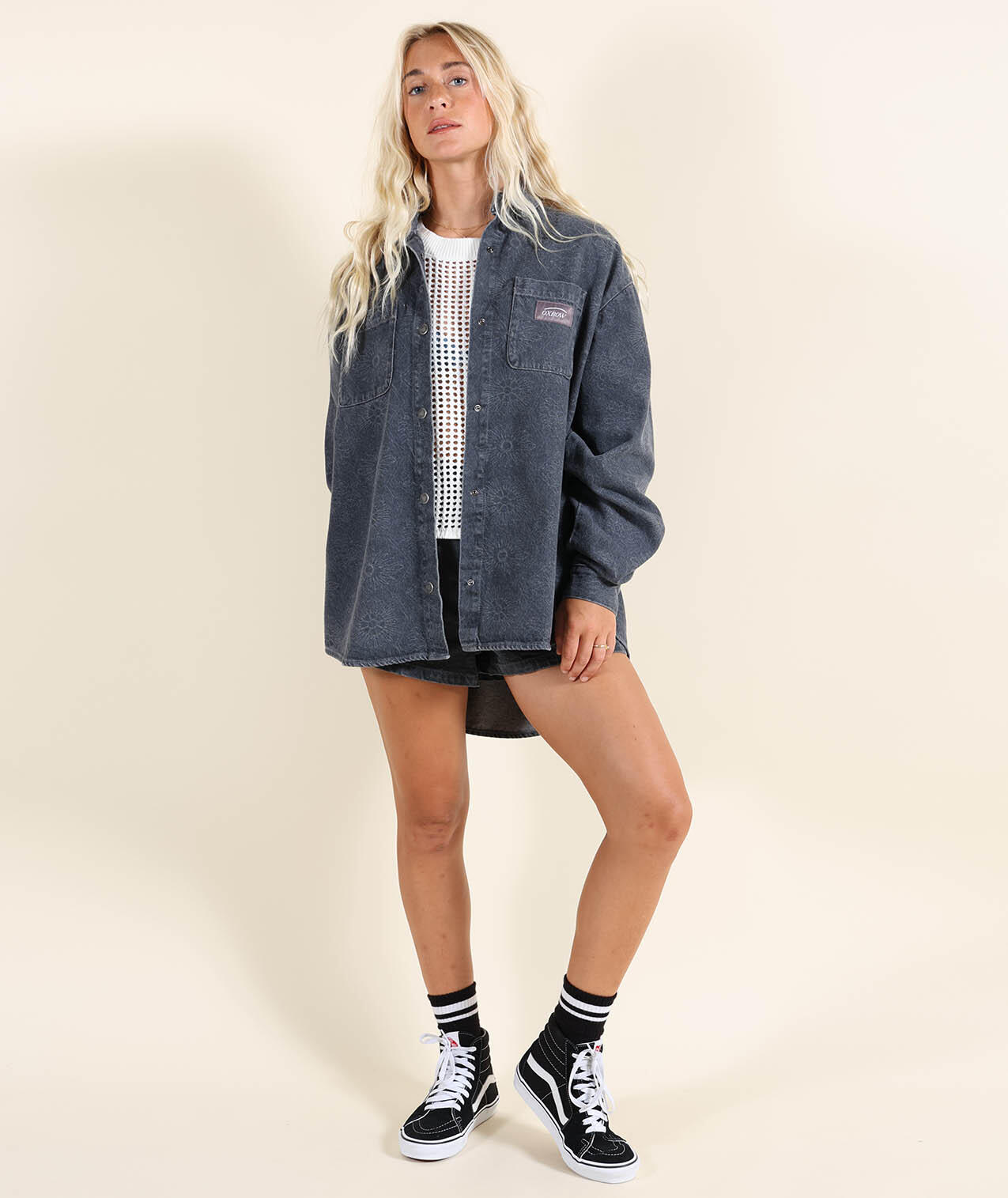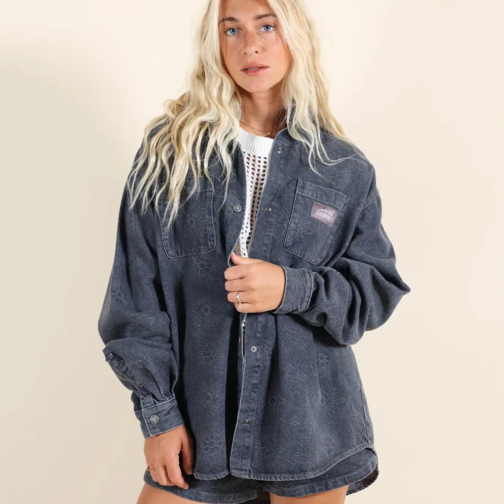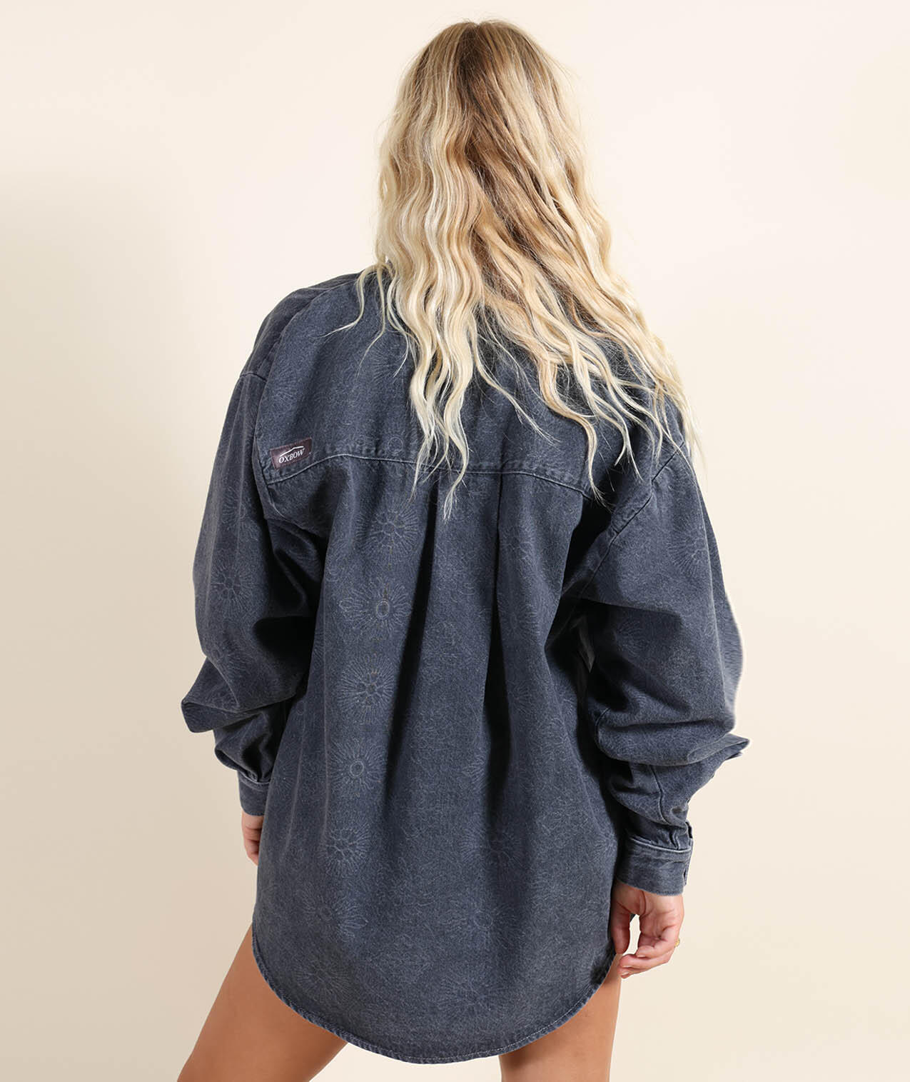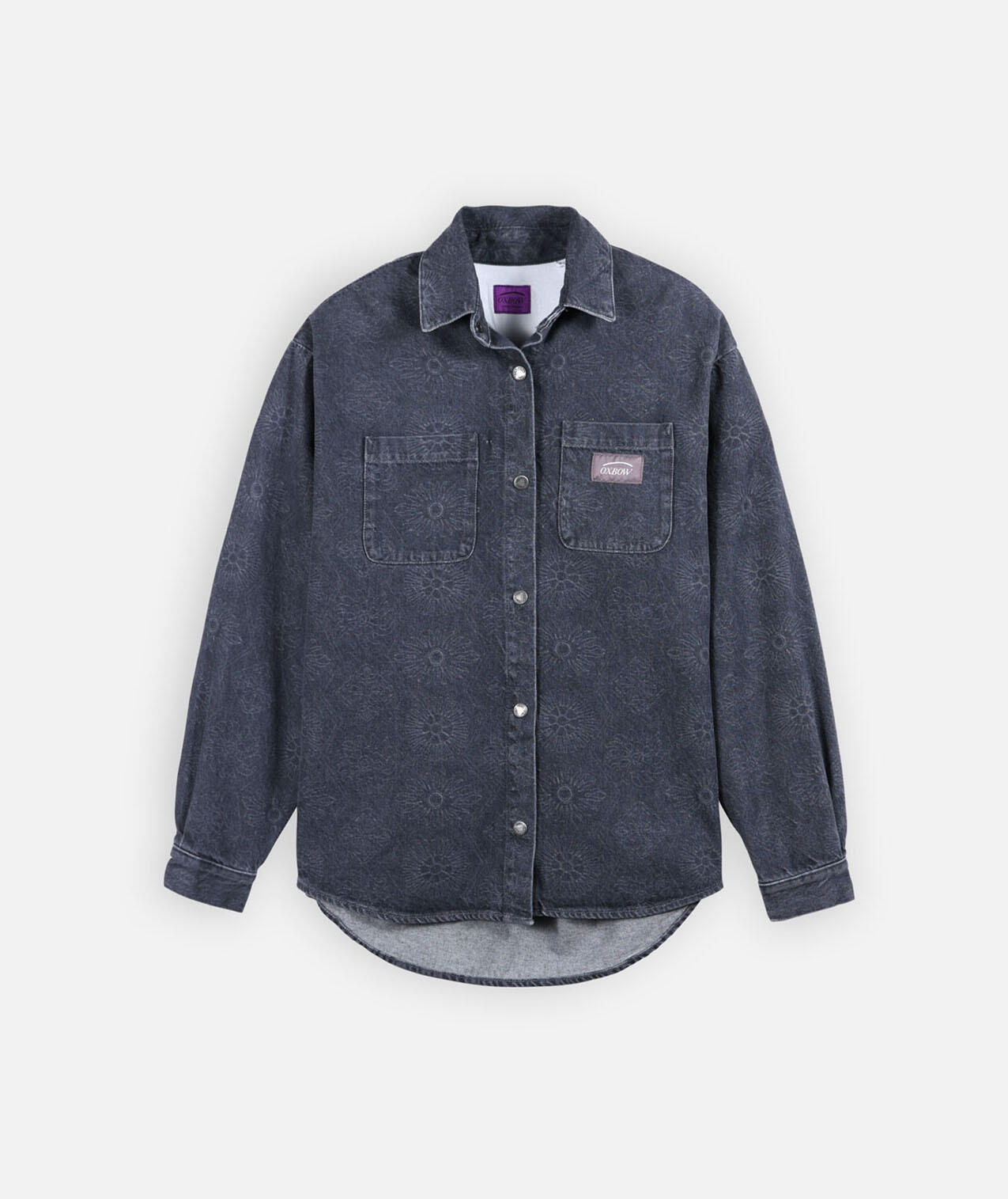 Oversized long sleeve printed denim shirt, unprinted pocket and collar, Oxbow woven labels on shoulder and chest pocket.