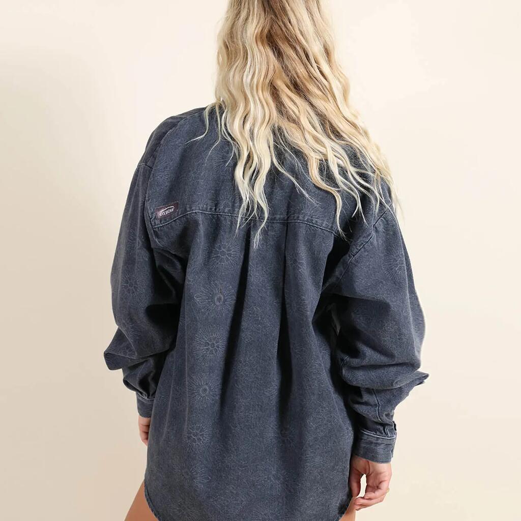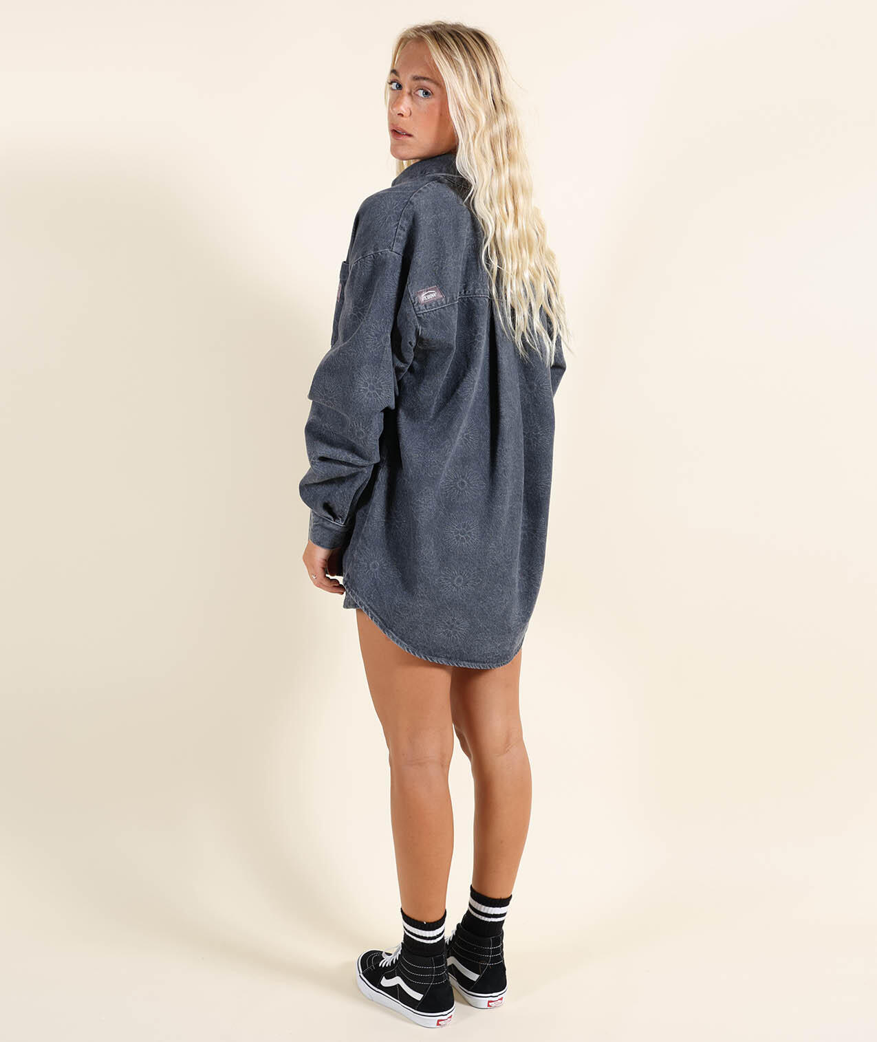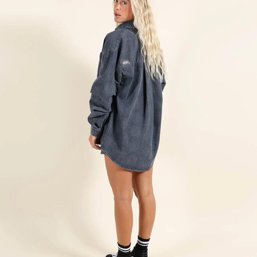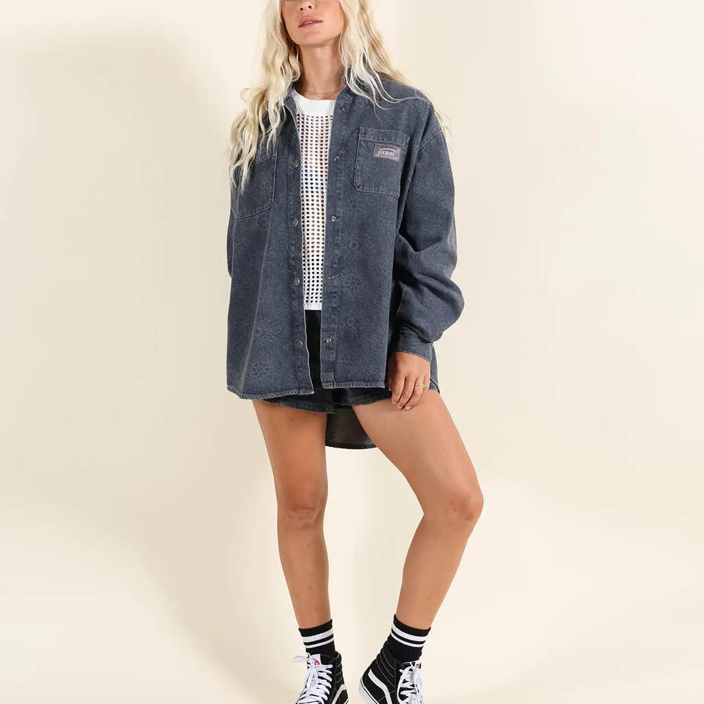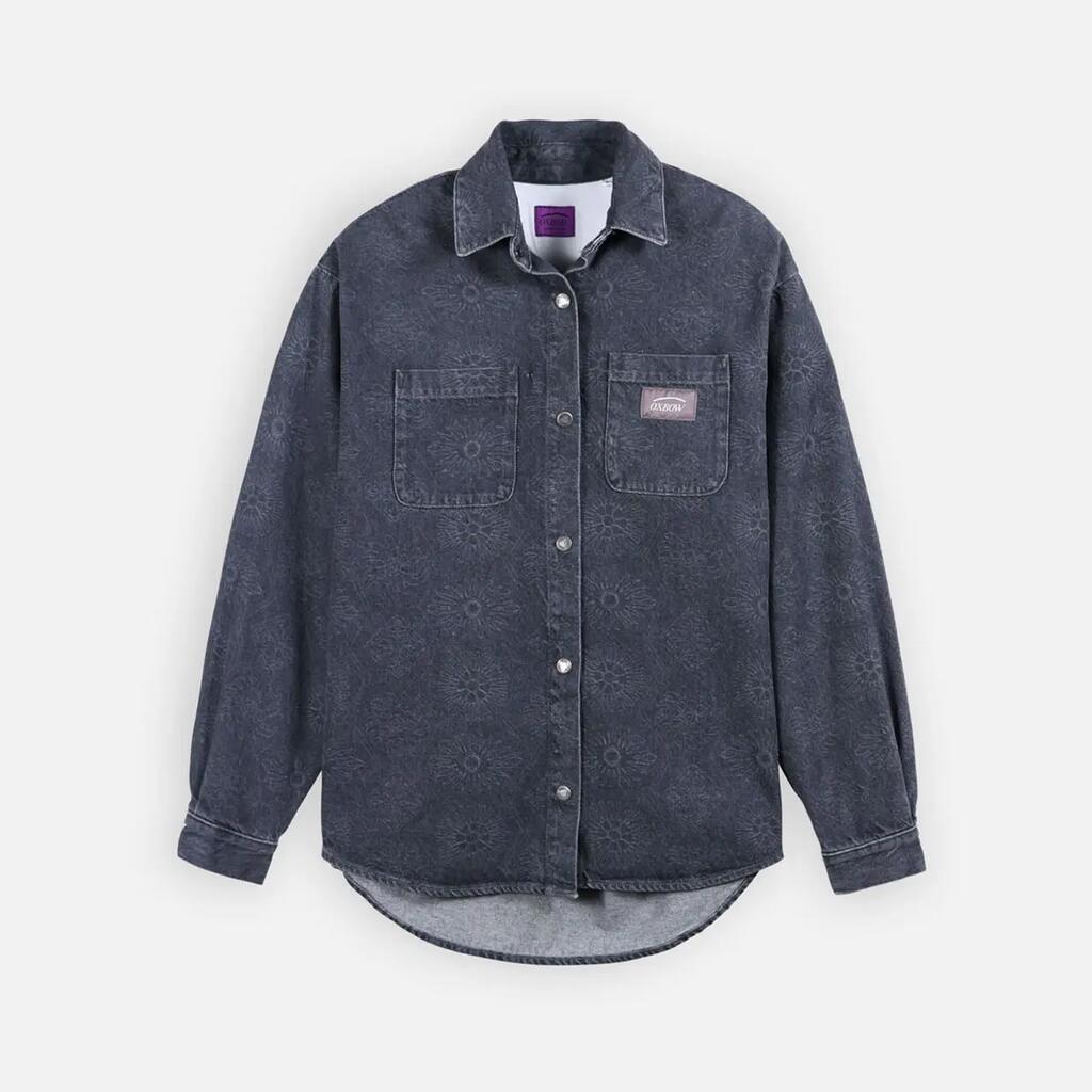 Oversized long sleeve printed denim shirt, unprinted pocket and collar, Oxbow woven labels on shoulder and chest pocket.