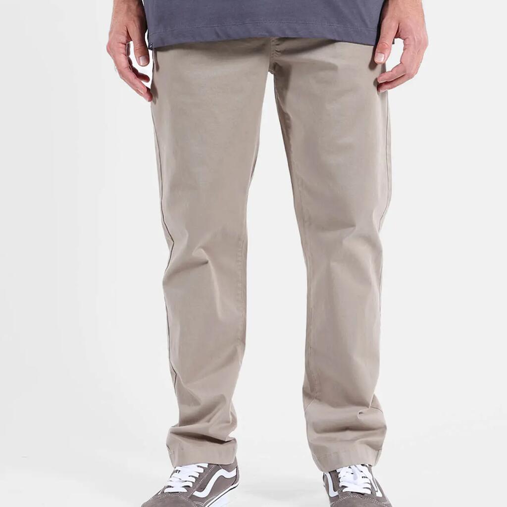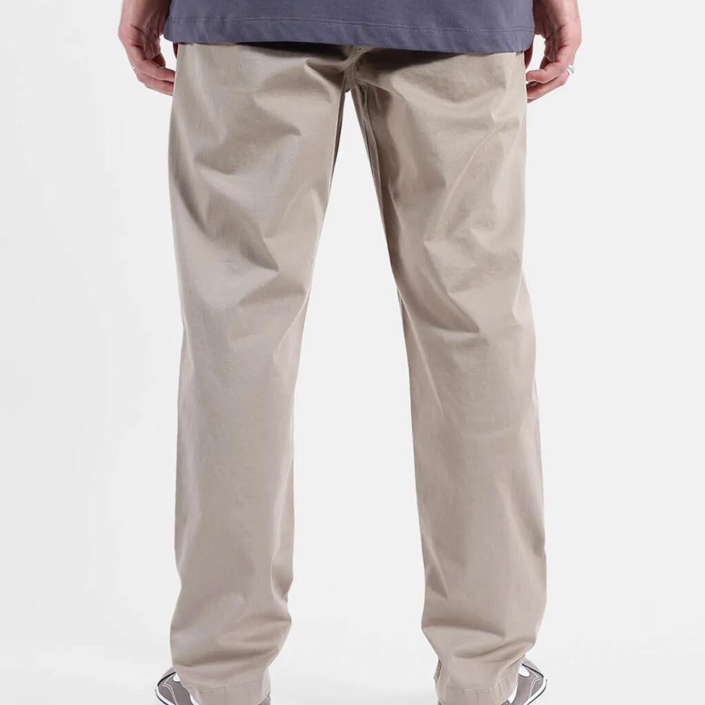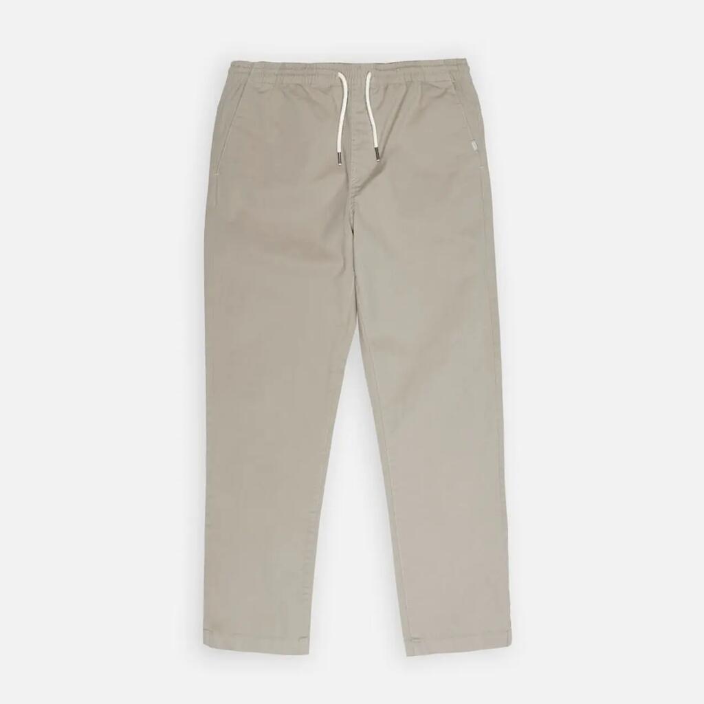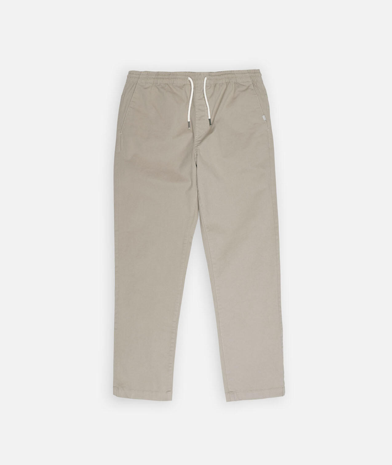 Comfort stretch pants in peach-touch twill, elastic waistband with drawstring, side and back welt pockets, fake fly, length 76–79.5 cm depending on size.
