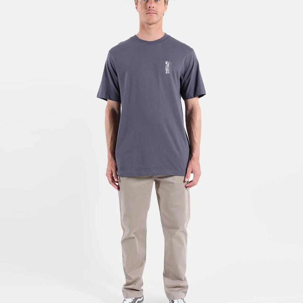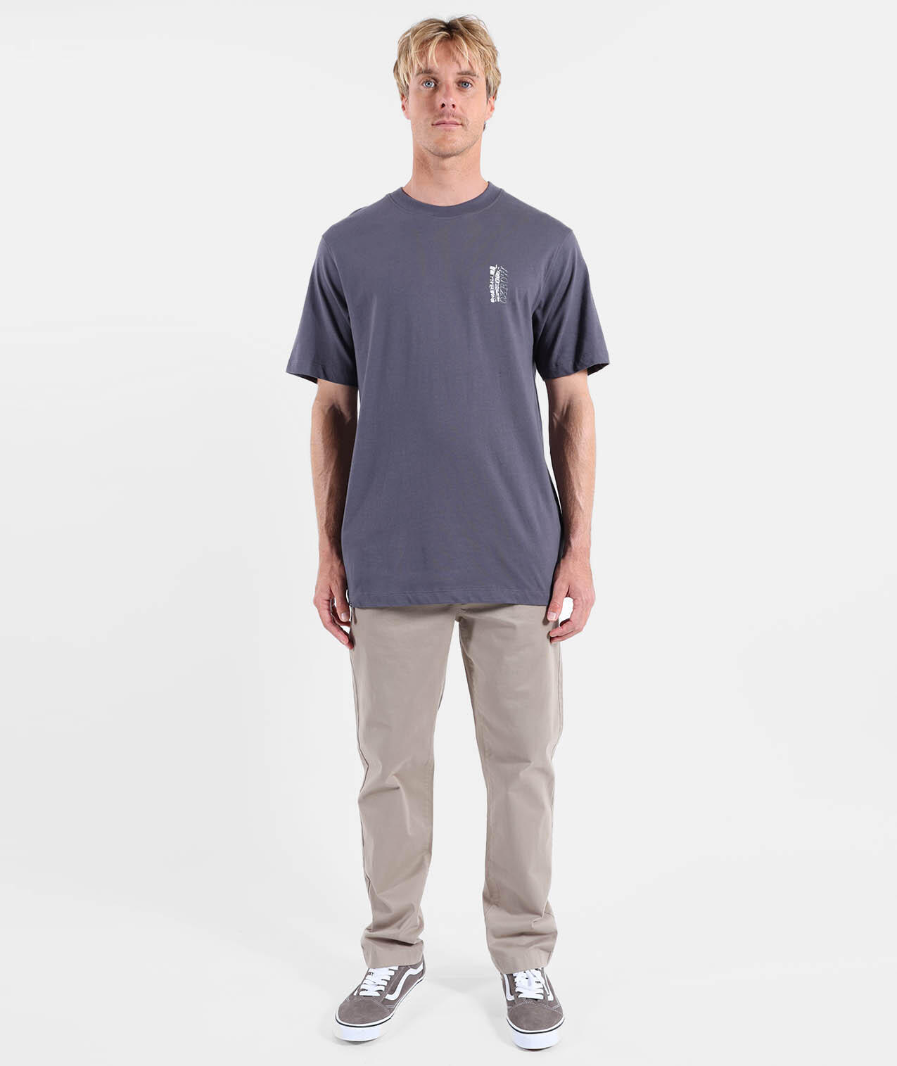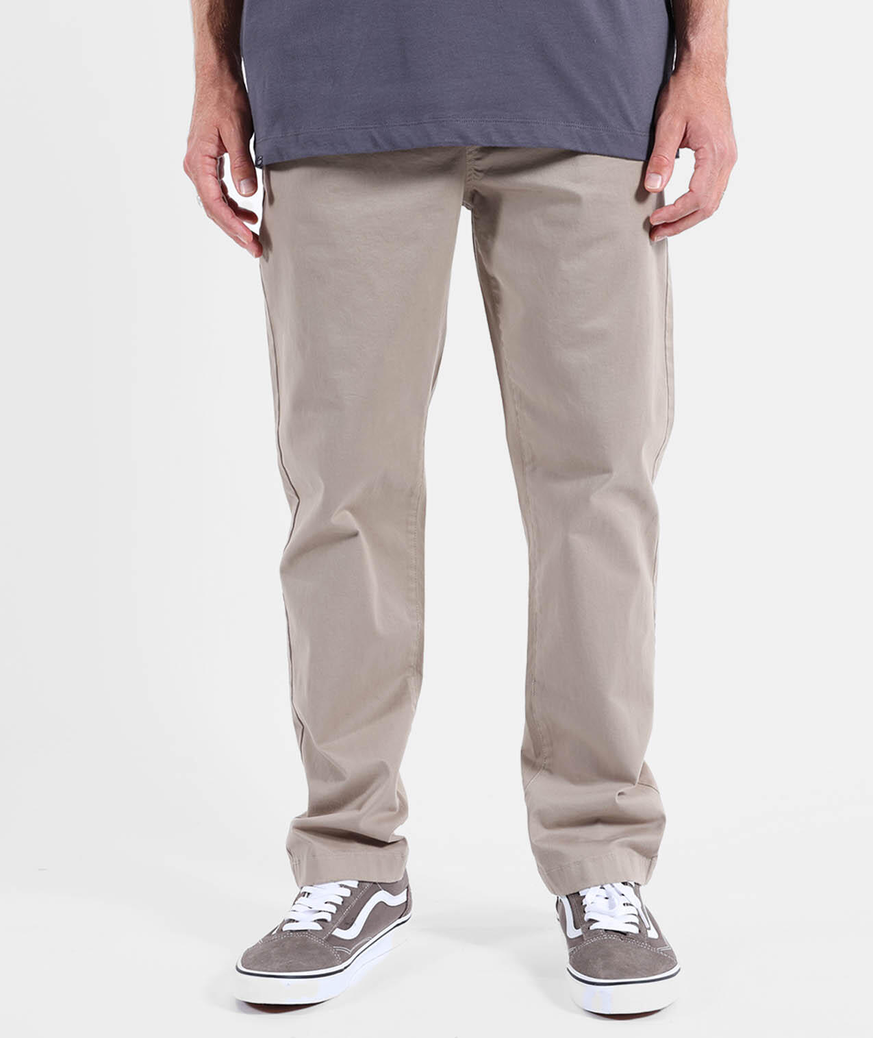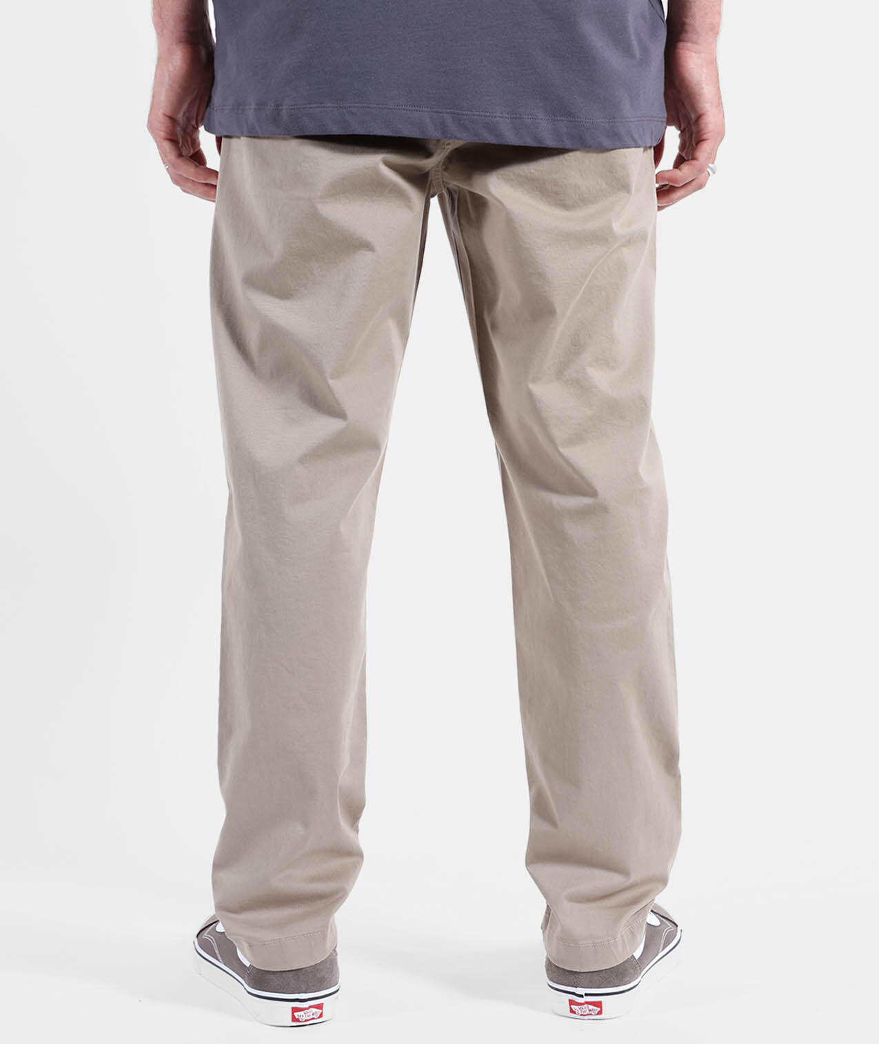 Comfort stretch pants in peach-touch twill, elastic waistband with drawstring, side and back welt pockets, fake fly, length 76–79.5 cm depending on size.