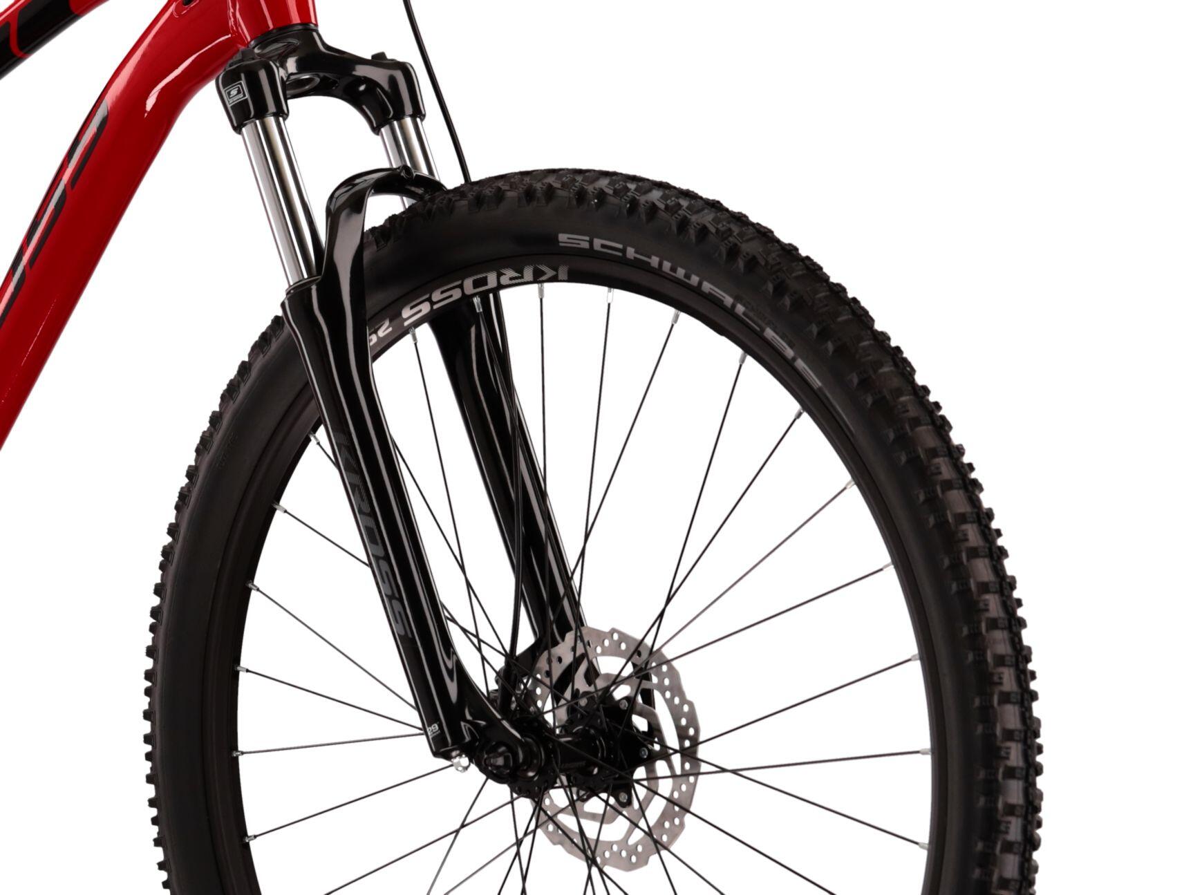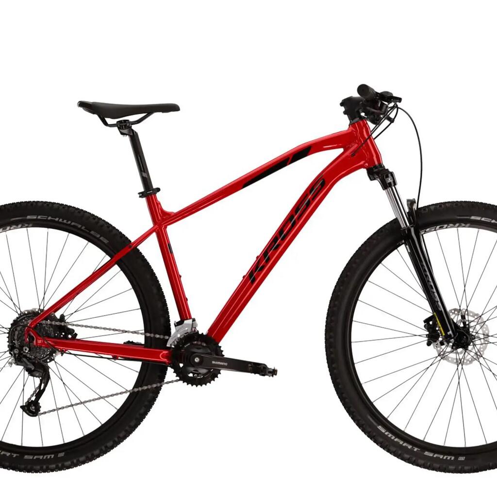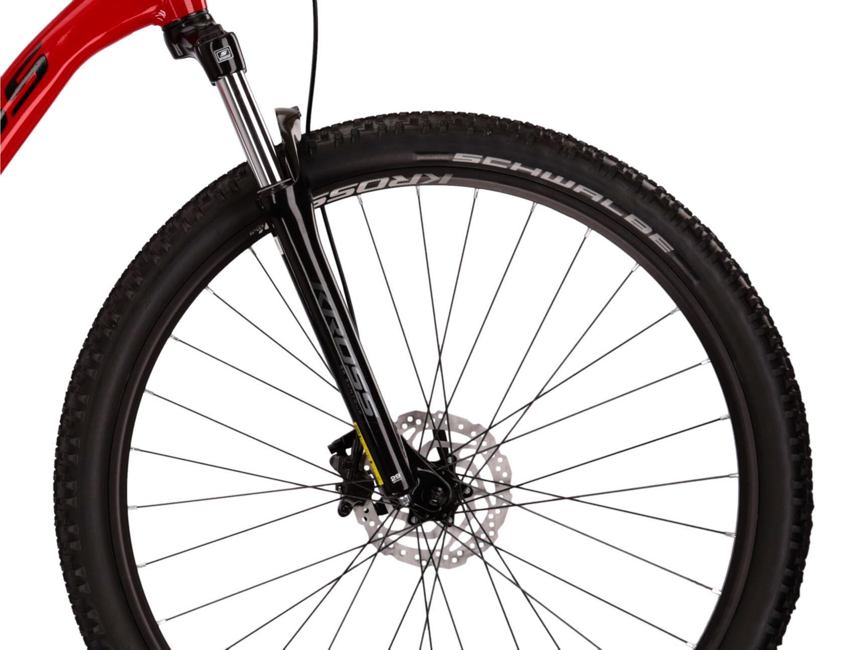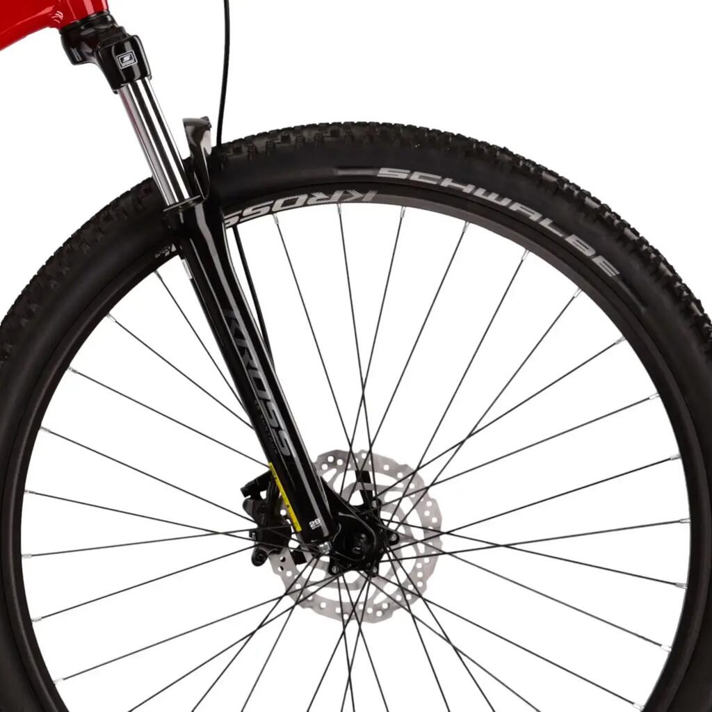 Kross Level 1.0 red MTB, Lite aluminium frame, 29" with SR Suntour suspension, 18 speeds and hydraulic disc brakes for off-road rides.