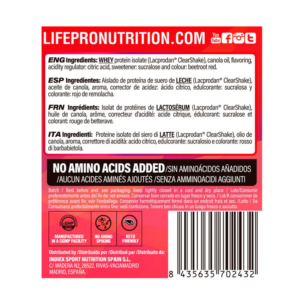 100% Clear Isolate Zero from Life Pro Nutrition helps meet the protein needs of the body for optimal performance, contributing to the maintenance and increase of muscle mass and post-workout recovery. It contains Lacprodan Clearshake whey protein isolate, with a much lighter texture than conventional whey shakes. It is a powdered food preparation based on whey protein isolate Lacprodan Clearshake, a patented formula without sugars or fats. It has a light, versatile, juice-like texture. It is taken to help meet the protein needs of the body, and thus function optimally, especially during periods of physical training. Contributes to the maintenance and gain of muscle mass. Helps in an optimal recovery after training.
