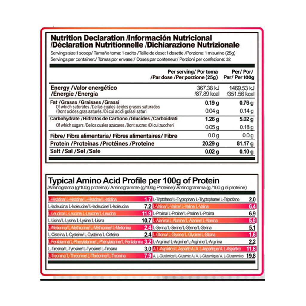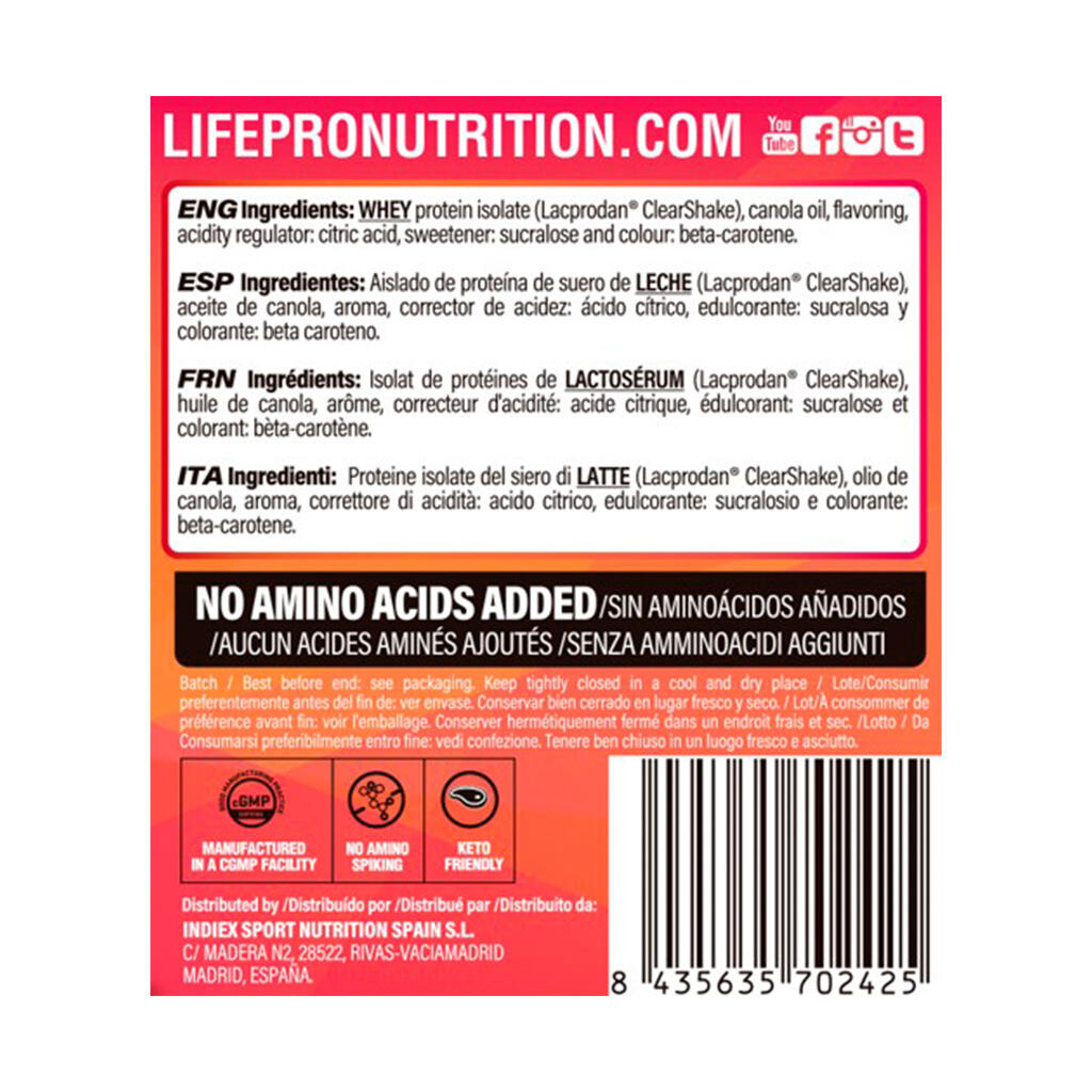 100% Clear Isolate Zero from Life Pro Nutrition helps meet the protein needs of the body for optimal performance, contributing to the maintenance and increase of muscle mass and post-workout recovery. It contains Lacprodan Clearshake whey protein isolate, with a much lighter texture than conventional whey shakes. It is a powdered food preparation based on whey protein isolate Lacprodan Clearshake, a patented formula without sugars or fats. It has a light, versatile, juice-like texture. It is taken to help meet the protein needs of the body, and thus function optimally, especially during periods of physical training. Contributes to the maintenance and gain of muscle mass. Helps in an optimal recovery after training.