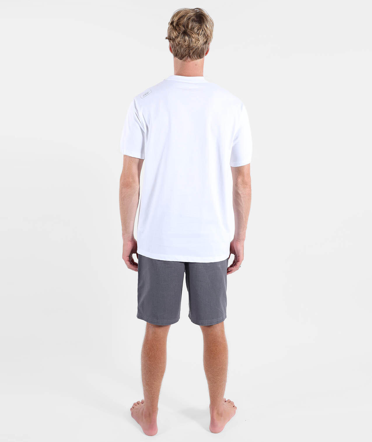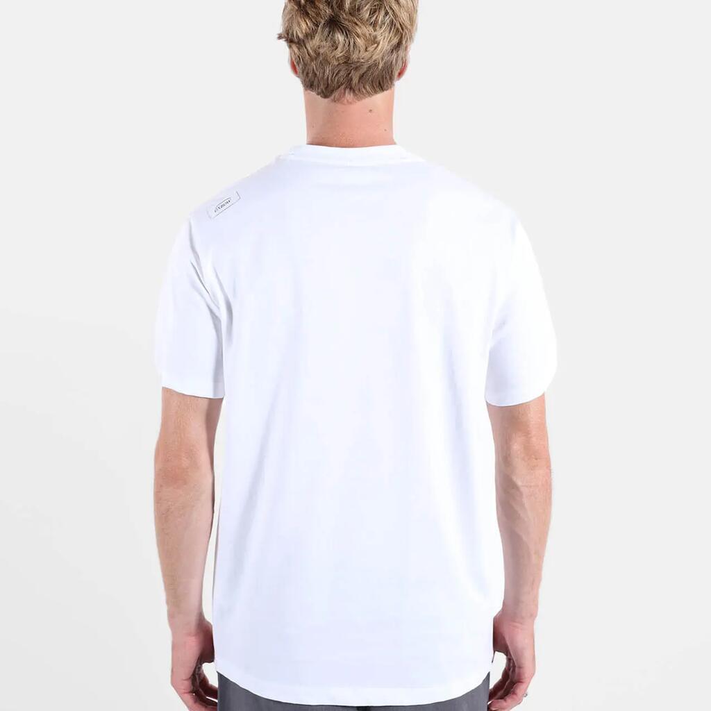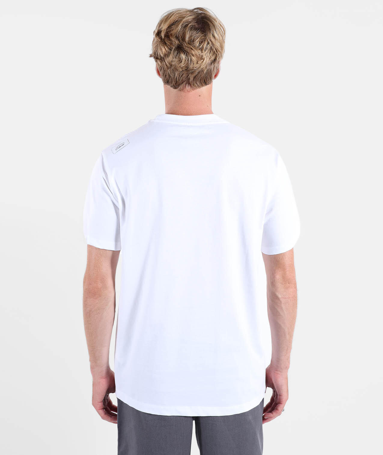 Crew neck tee, printed graphic on back with chest detail, woven label at hem, -polished cotton jersey