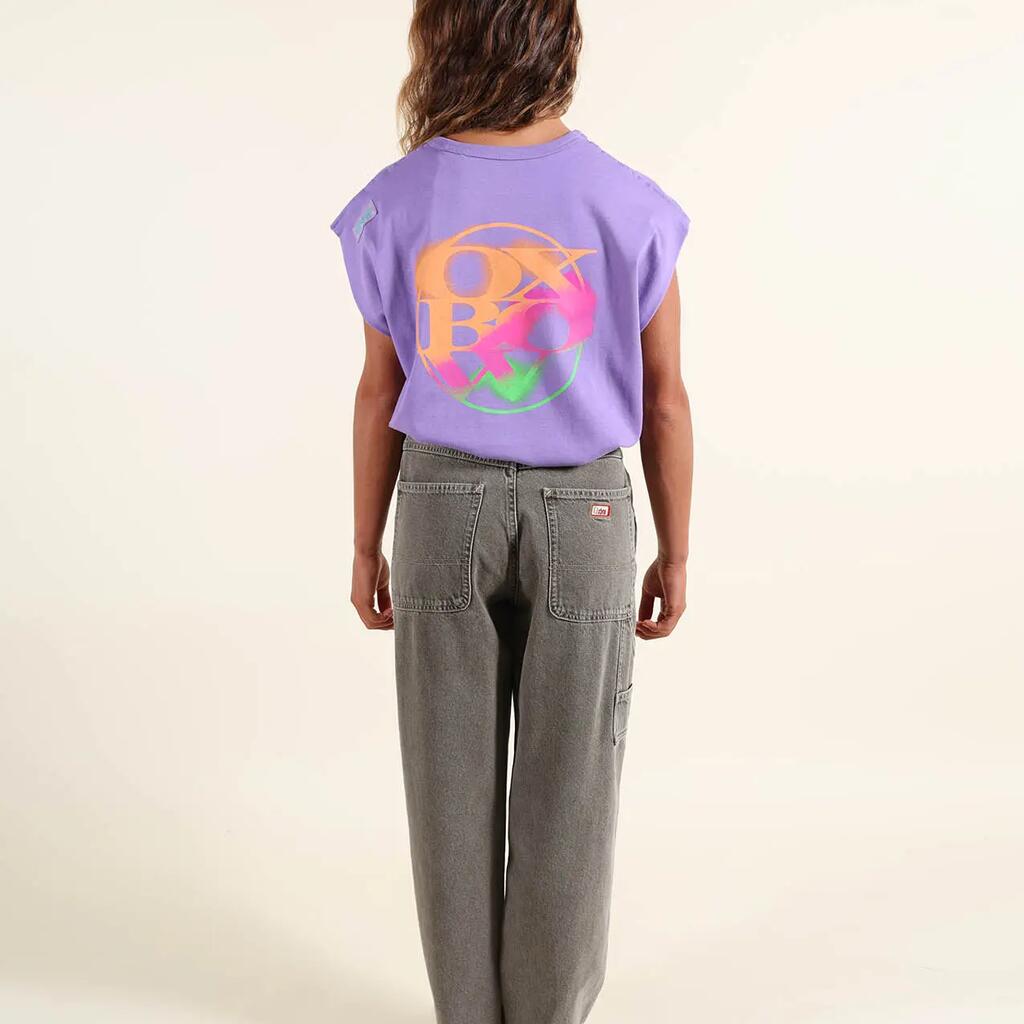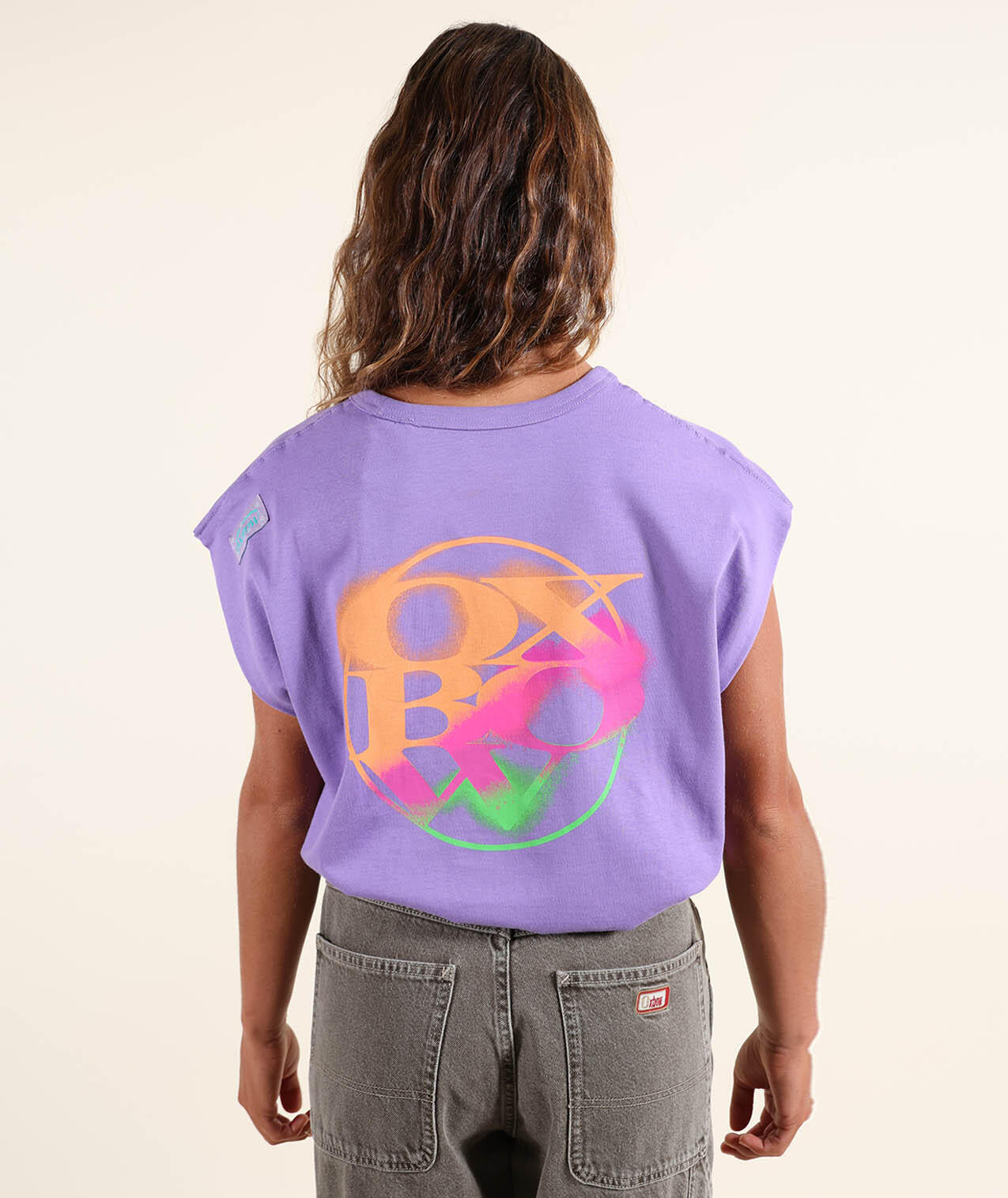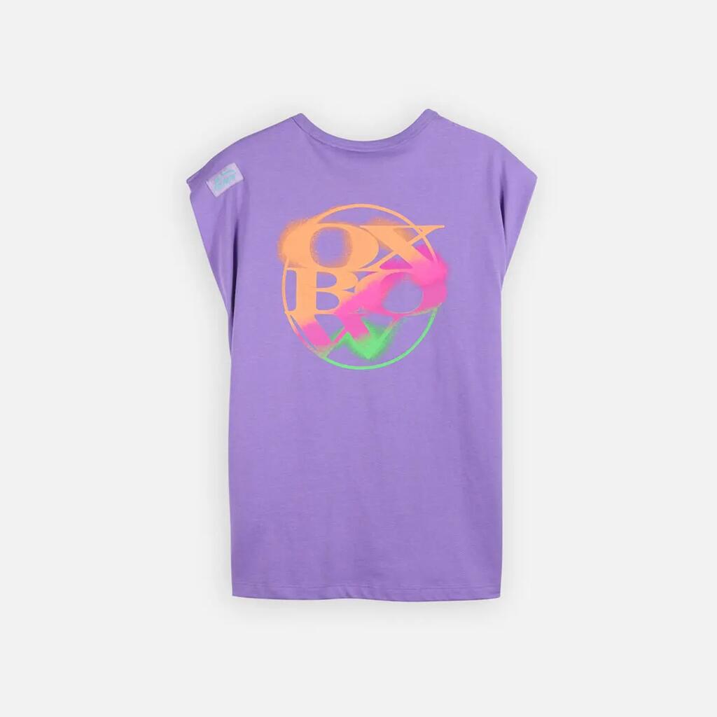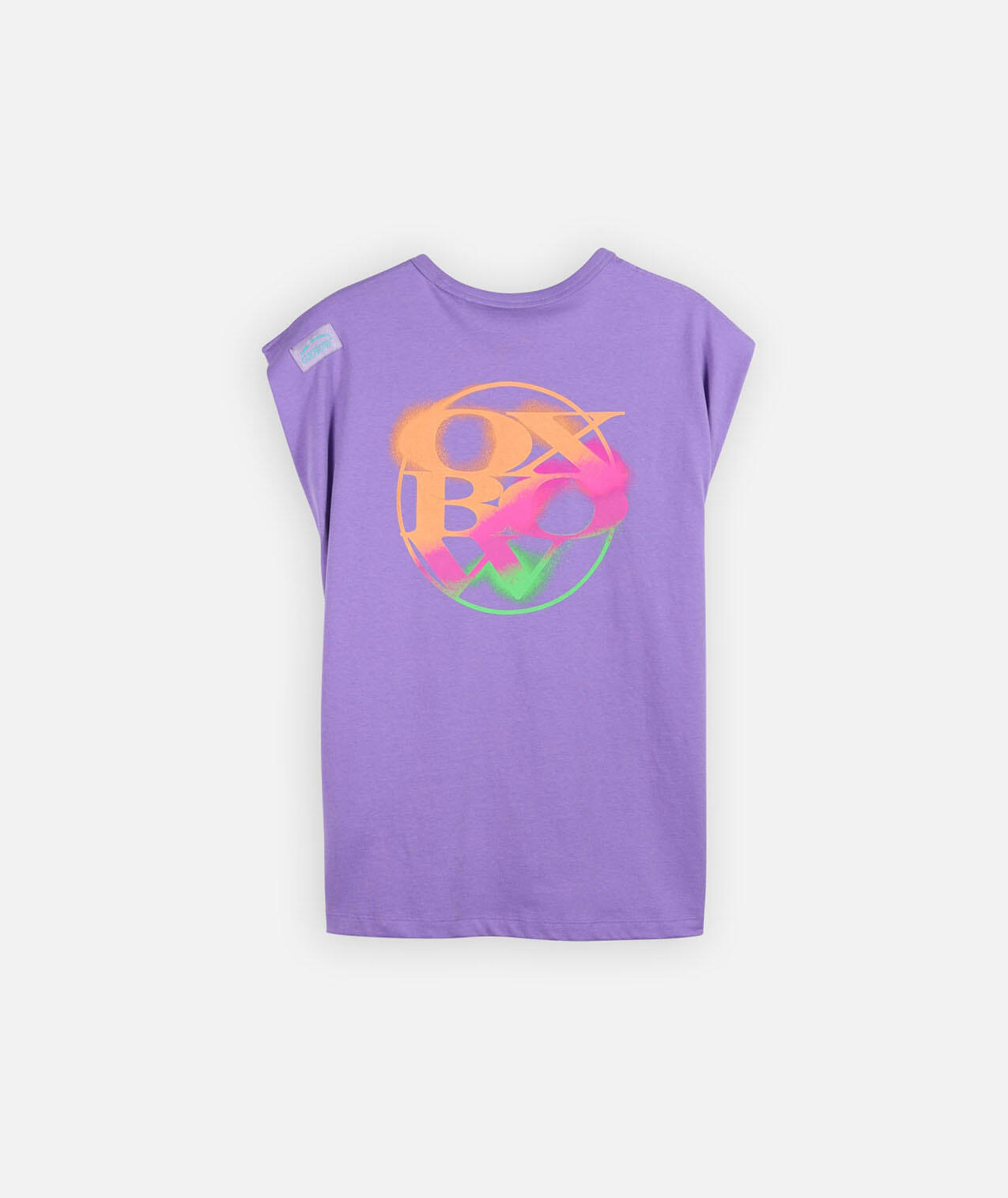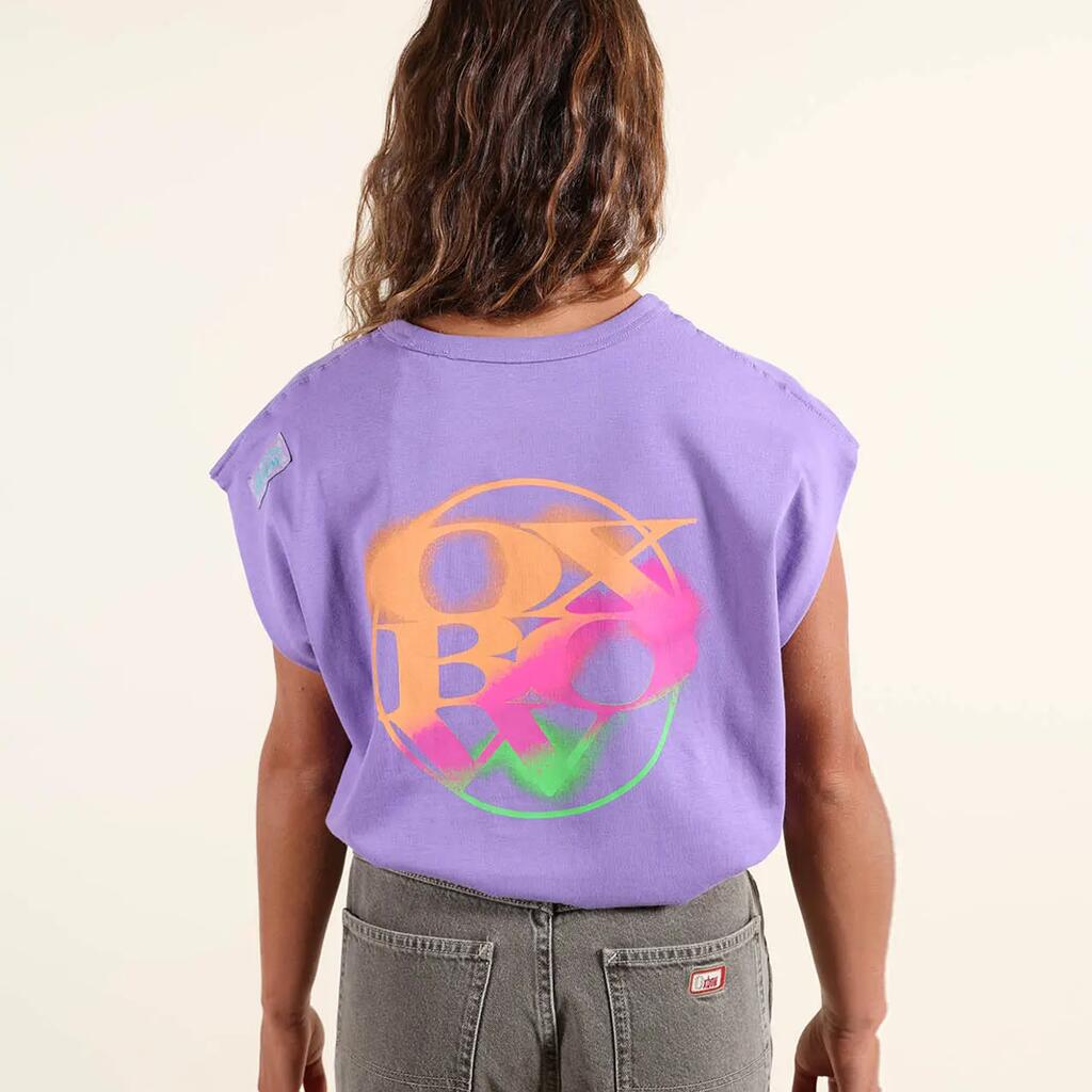 Sleeveless cotton T-shirt, printed back and small chest motif, Oxbow woven label on shoulder.
