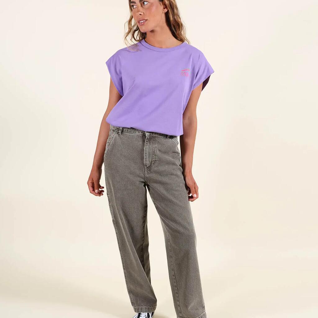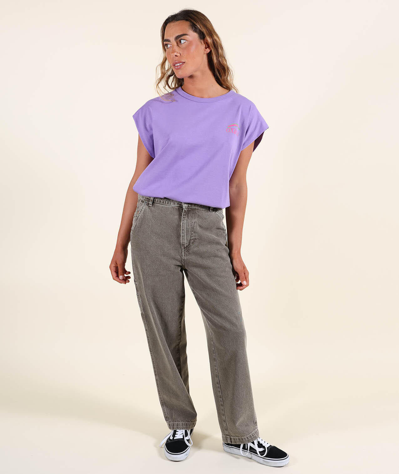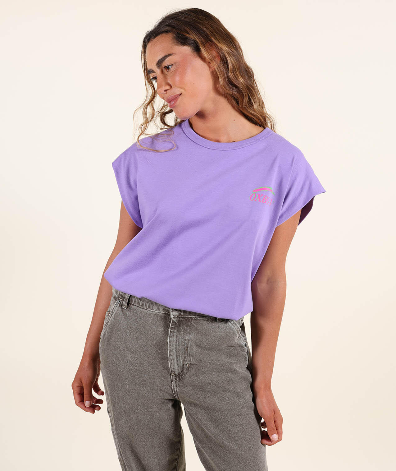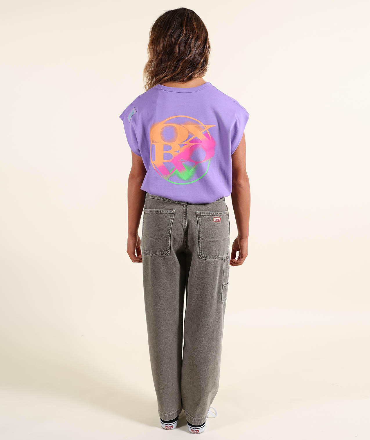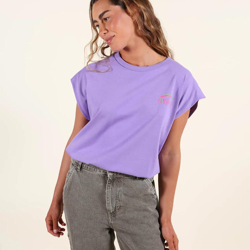 Sleeveless cotton T-shirt, printed back and small chest motif, Oxbow woven label on shoulder.