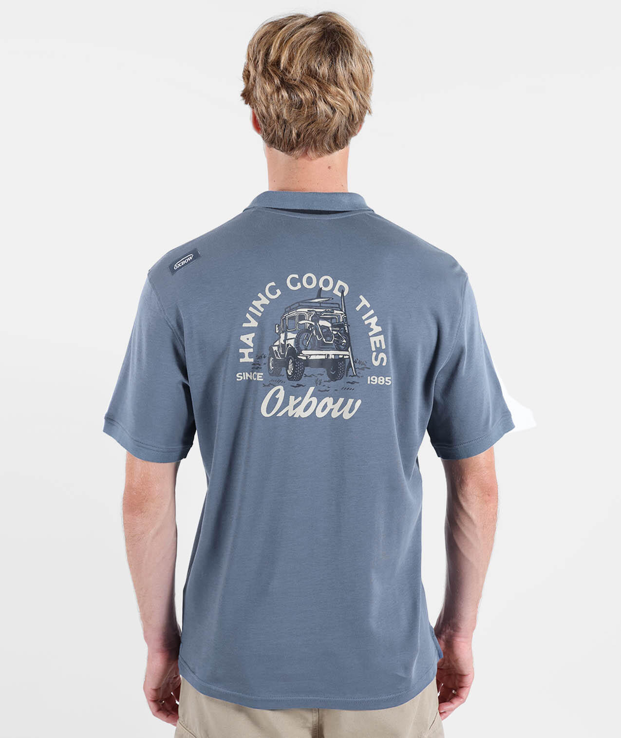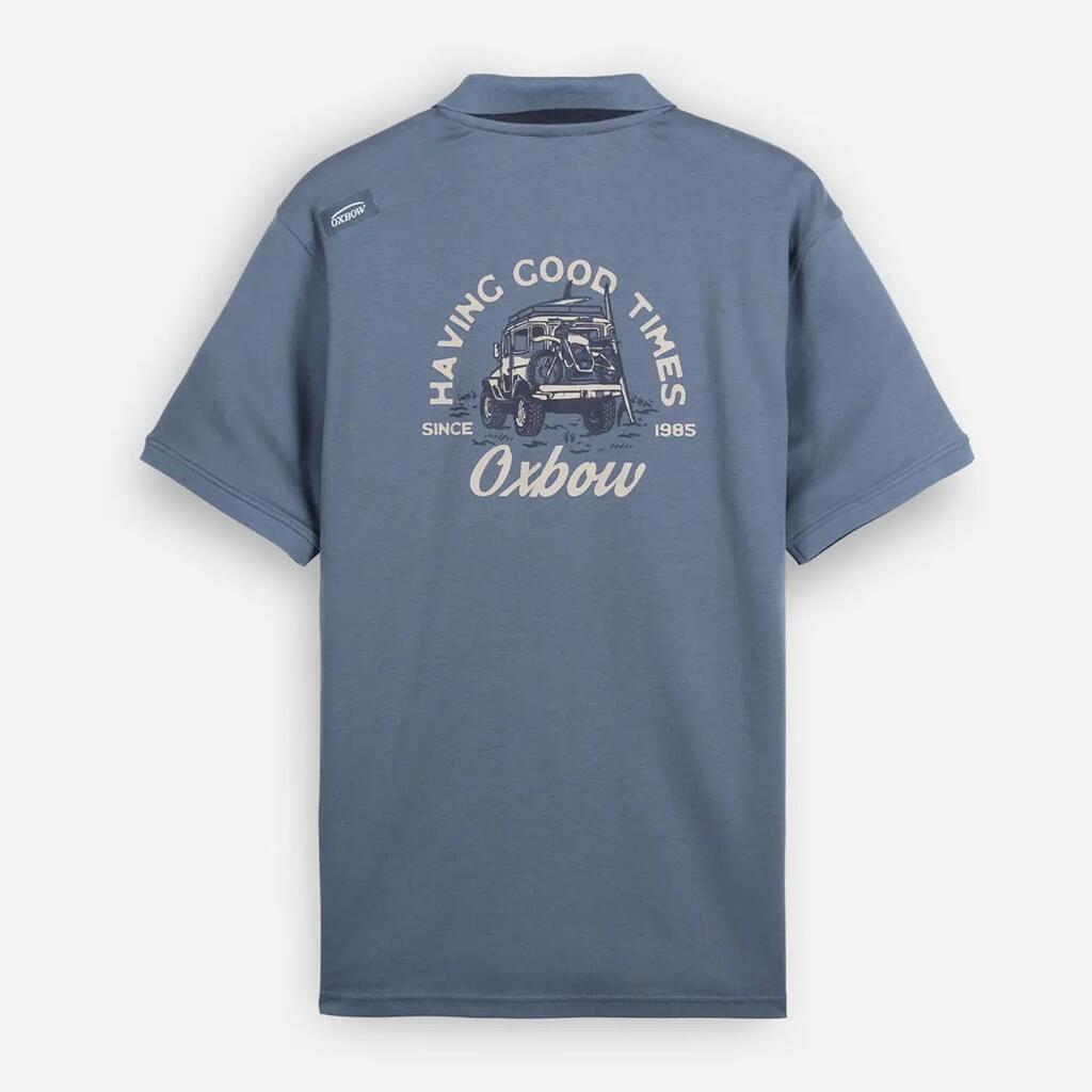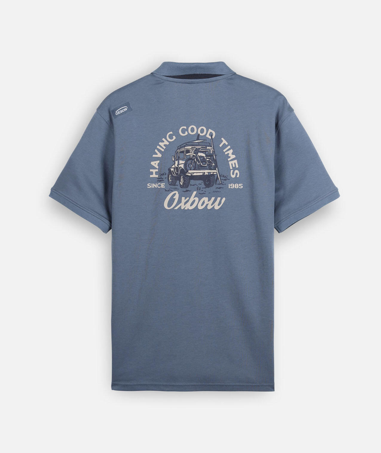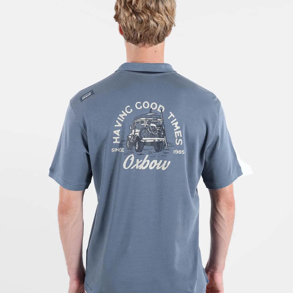 Graphic short-sleeve polo, solid ribbed collar with contrast inner trim, graphic print on back, 4flo embroidered chest logo, cotton interlock jersey 220 g/m².